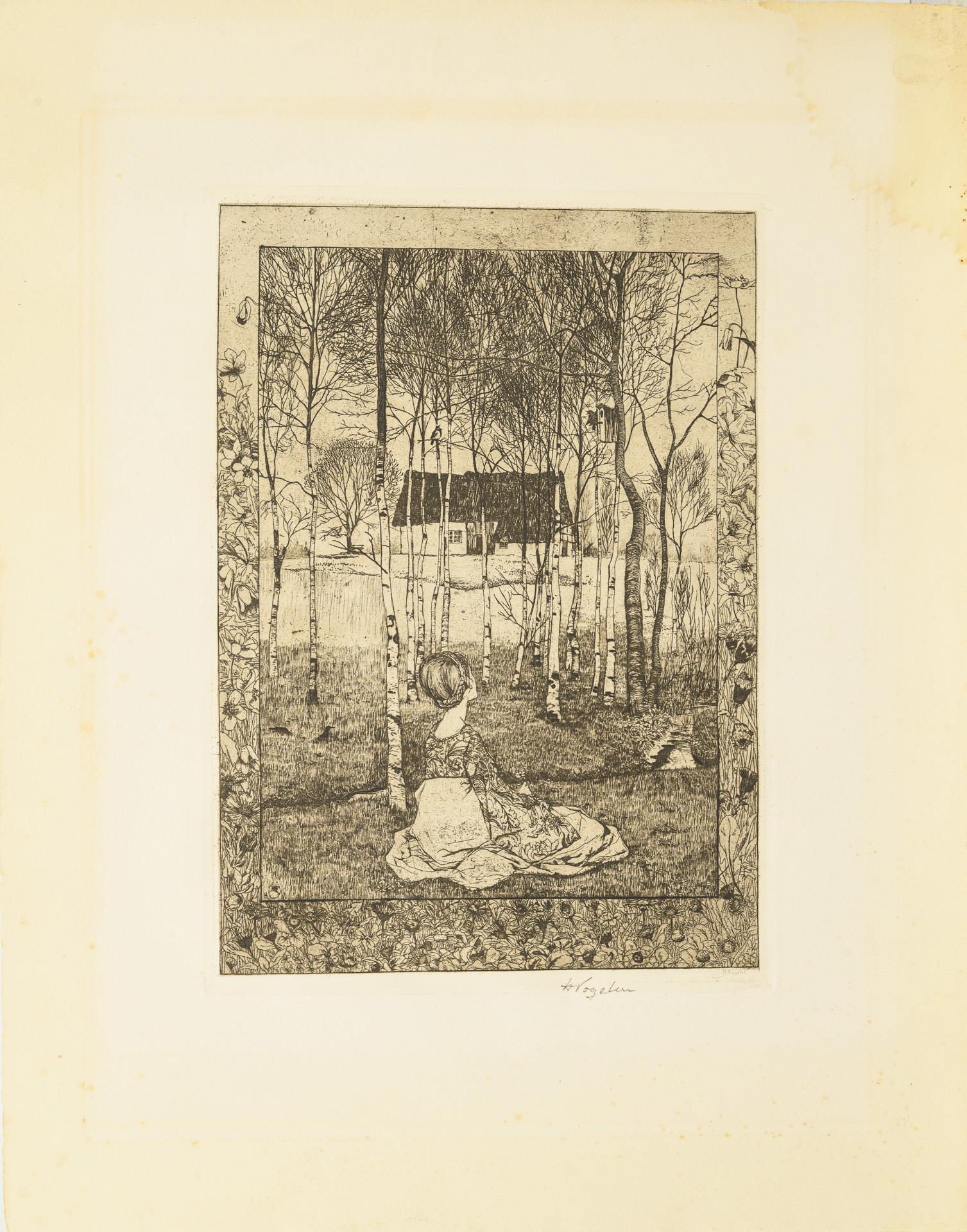 Dem Vogelzwitschern lauschendes Mädchen unter Birken. Im Randbereich stockfleckig angeschmutzt und Wasserfleck, keine Bildbeeinträchtigung.