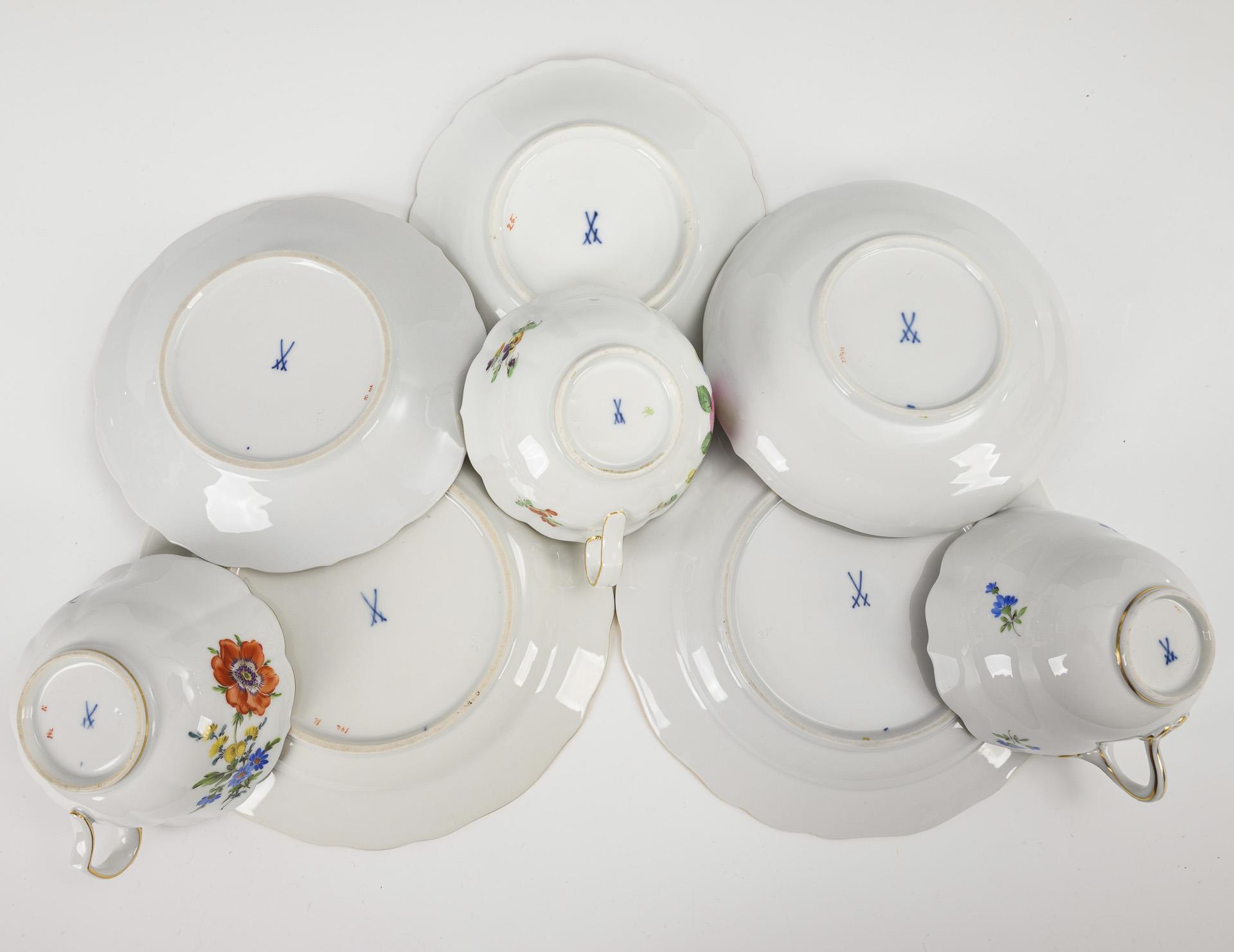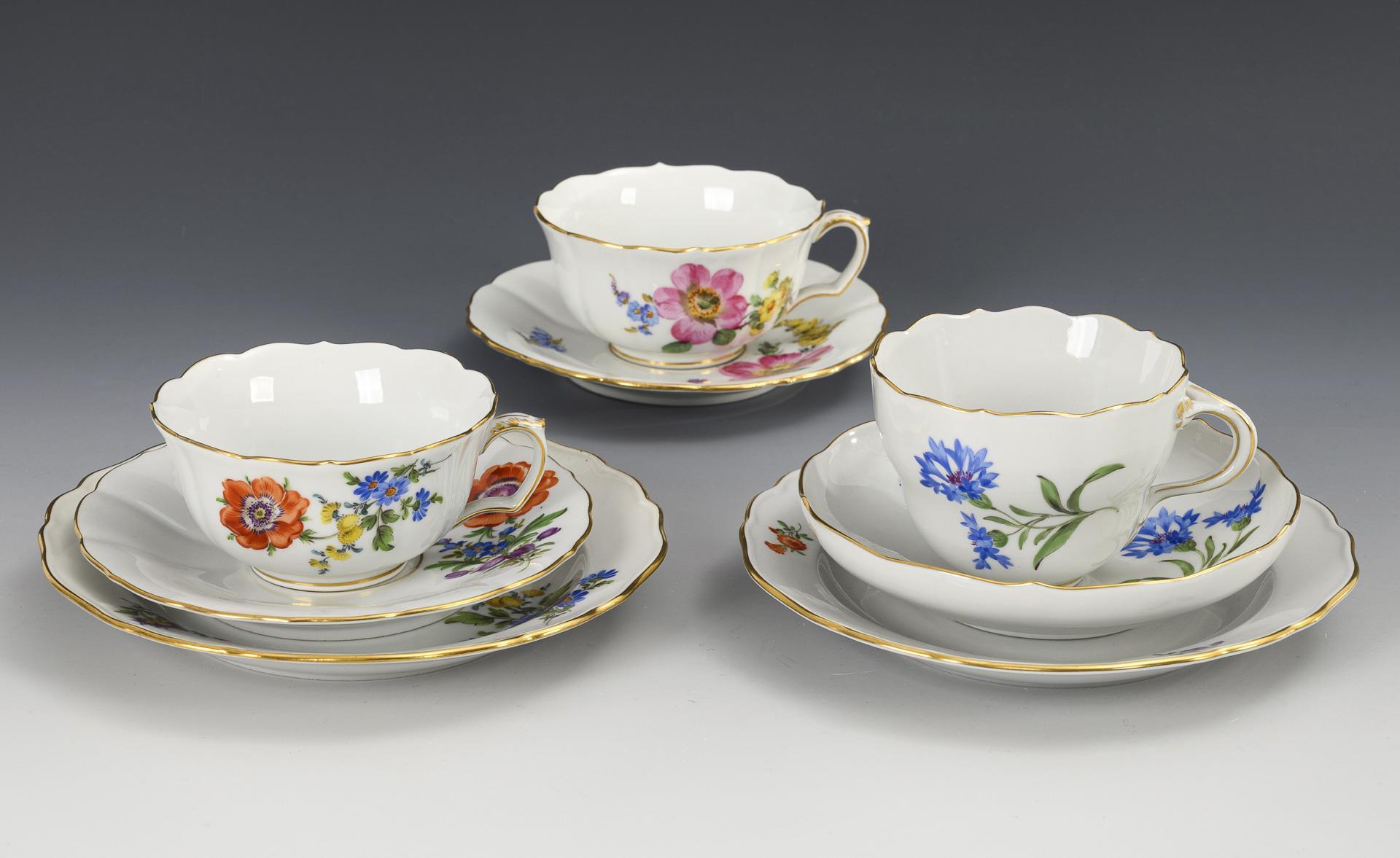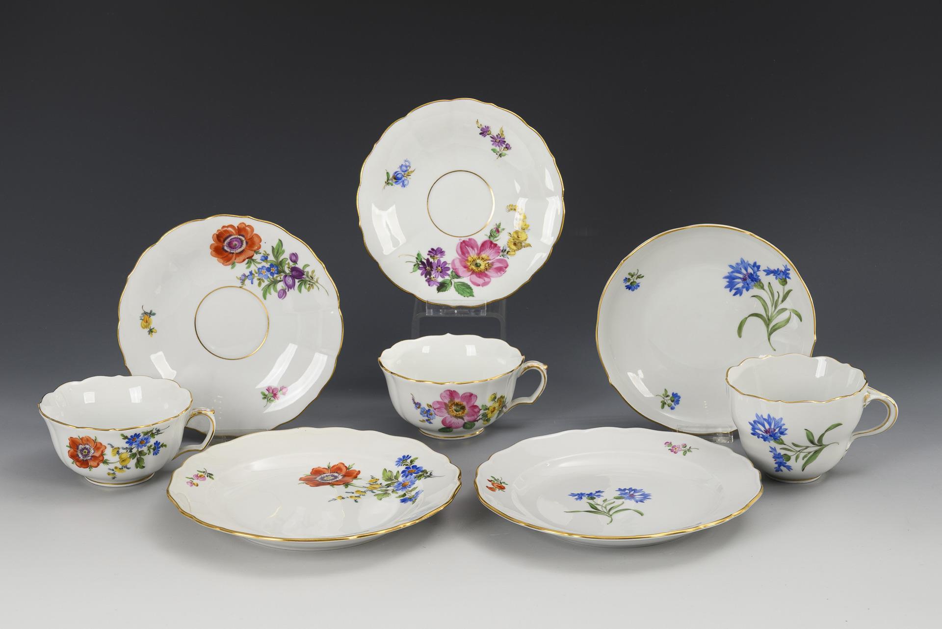 2 Gedecke und 1 Tasse mit Blumenmalerei. Meissen.