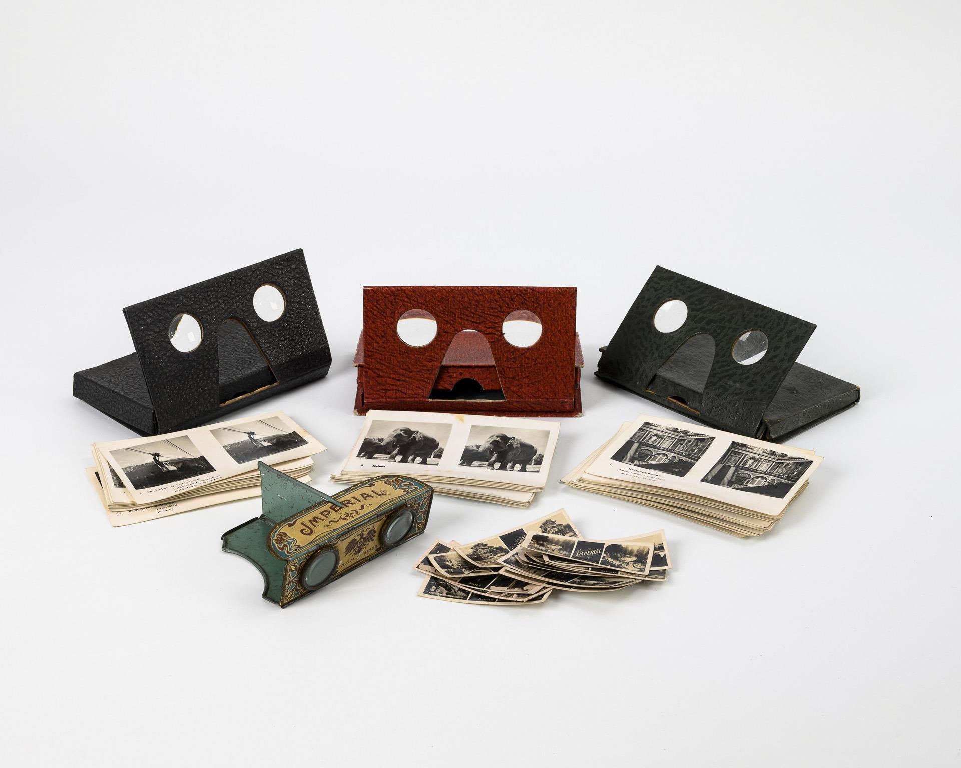 3x Karton mit farbigem Lederbezug, der gleichzeitig Bildbetrachter ist. 1x Eisenblech mehrfarbig lackiert. Je mit Glaslinsen. Je mit Stereo-Fotokarten. Karton 14,5 x 9 cm, 5 x 1,5 cm, Fotokarten 7,5 x 11,5 bzw. 3 x 7 cm.