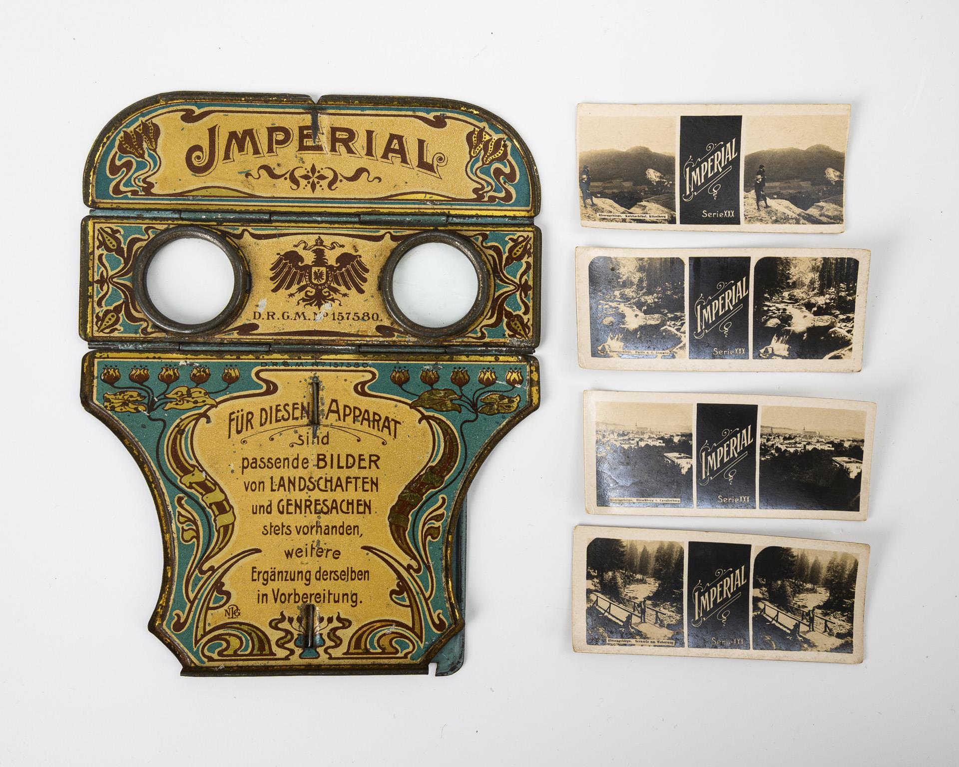 Kartons und Fotos je "Omnia-Verlag", Metallstereoskop und Fotos "Imperial" gemarkt. Um 1900 / Anfang 20. Jh.