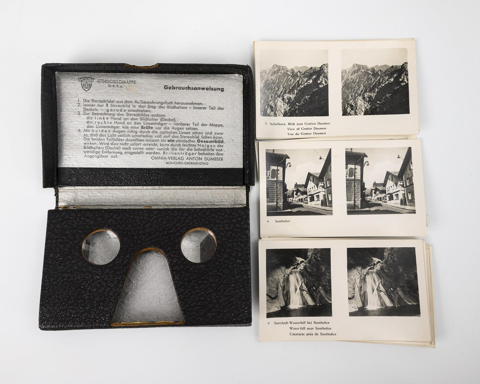 Karton-Stereoskope je mit Gebrauchsanweisung im Scharnierdeckel (1x englisch). Fotoserien Allgäu, aus dem Zoo und Schlösser Bayerns. In moderner Box klappbarer Metall-Stereobildbetrachter mit etlichen Fotos der Serie XXX (Riesengebirge) und 3 Fotos der Serie I (Kinder). Alters-/Gebrauchsspuren zumeist an den Kartons.