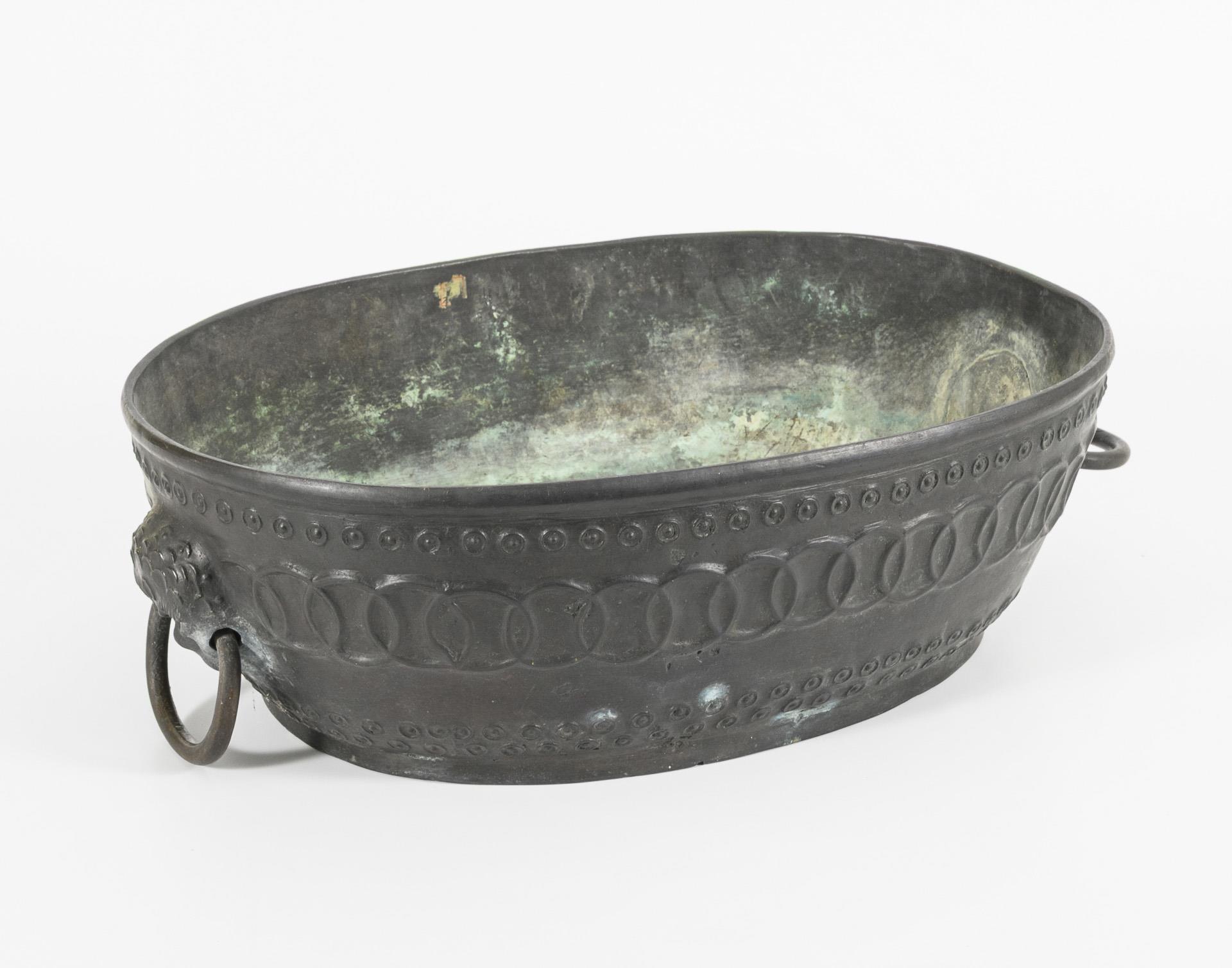 Ovale Form mit Reliefmusterung und zwei ringförmigen Handhaben. Innen grüne Patina und Kalkablagerungen, Unterseite etwas vernarbt.