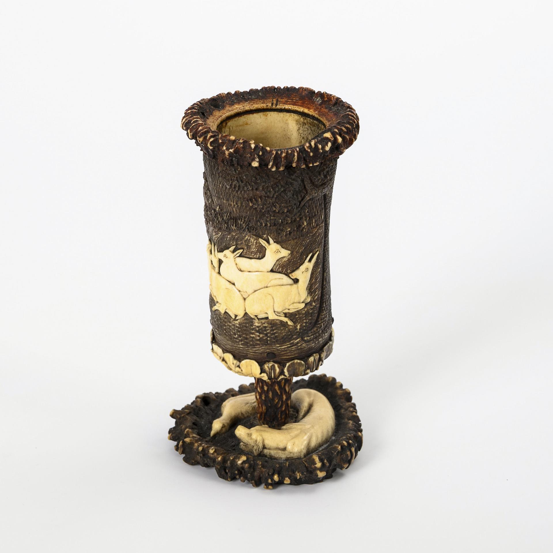 Vasenartiges Gefäß mit Hirschrose als Fuß und als Lippe. Helle Reliefschnitzerei im Kontrast zum dunklen Grund: Liegender Hund und Gans auf dem Fuß; auf der Wandung ein Sprung Rehe mit 5 Tieren, die zumeist zum kapitalen Hirsch aufschauen. 1 kleine Fehlstelle am Blattkranz.
