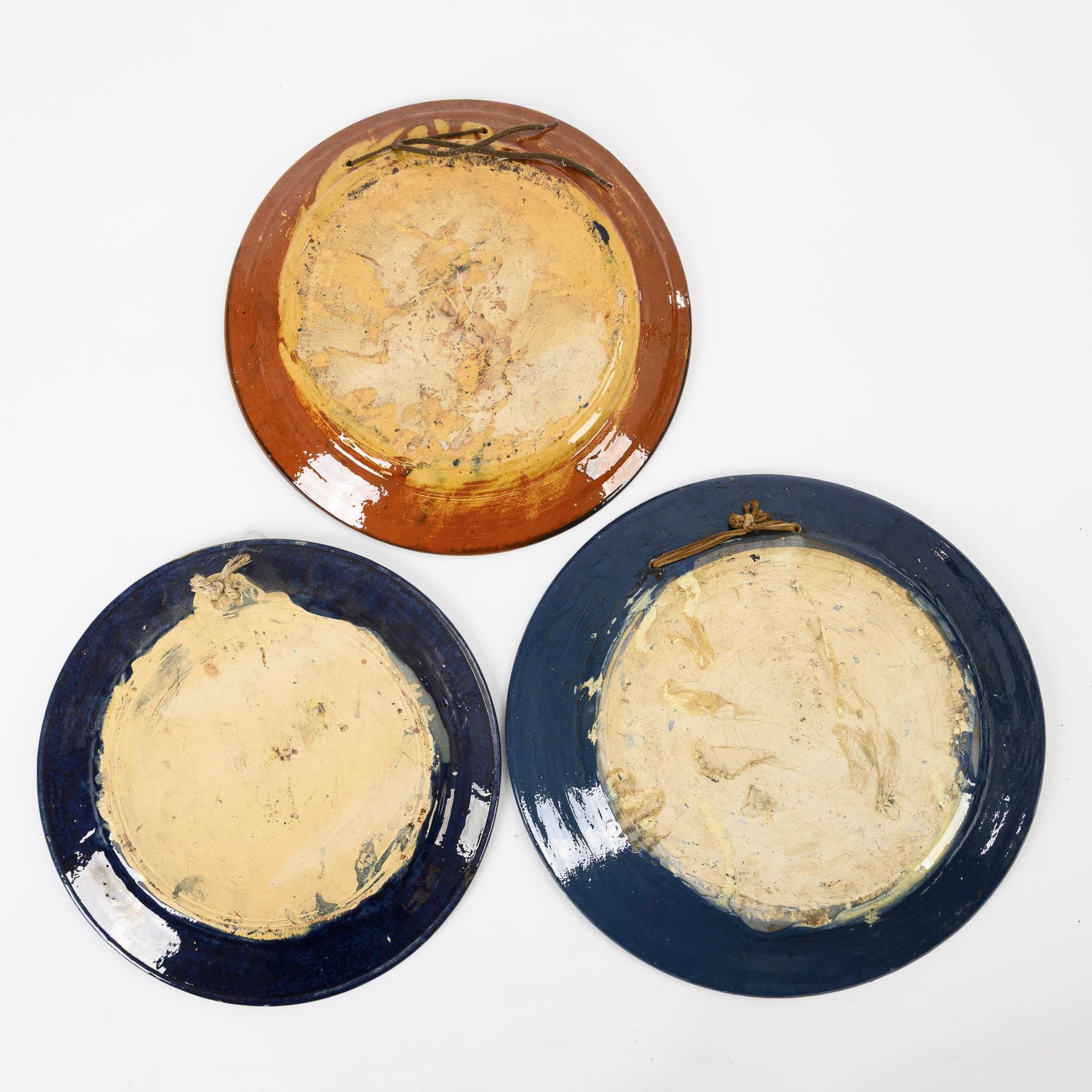 Runde Wandteller, 2x mit Wappenlöwen auf blauem Fond, 1x mit Wappendekor auf rotbraunem Fond, Fahnen verziert mit Schlickerranken. Jeweils mit ergänzter Aufhängung. Leichte Alters- und Gebrauchsspuren, partiell kleine Defekte.