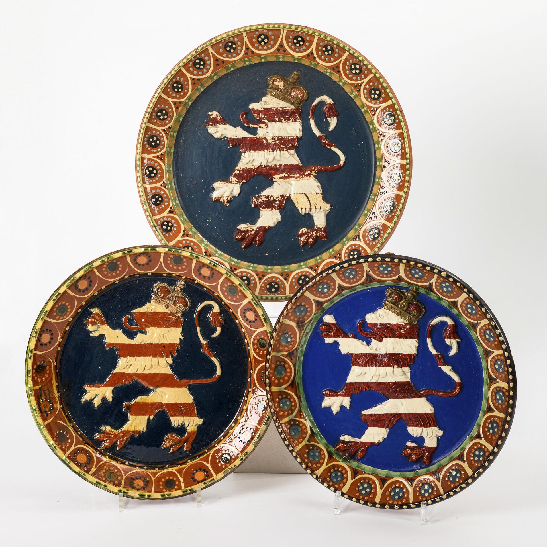 3 Reliefteller mit bekrönten Löwen. Hessische Keramik.