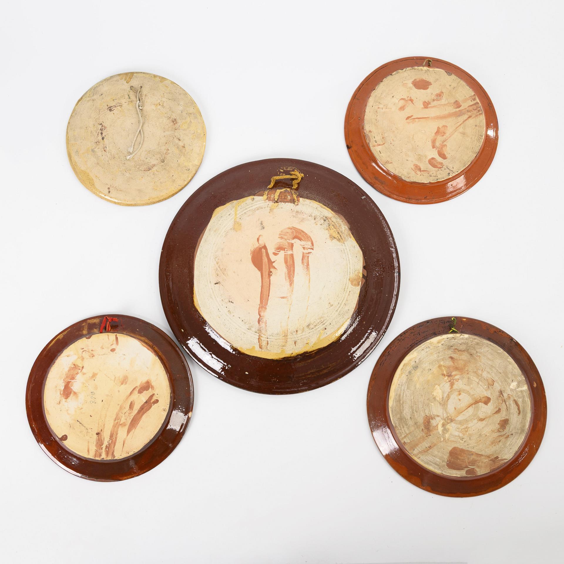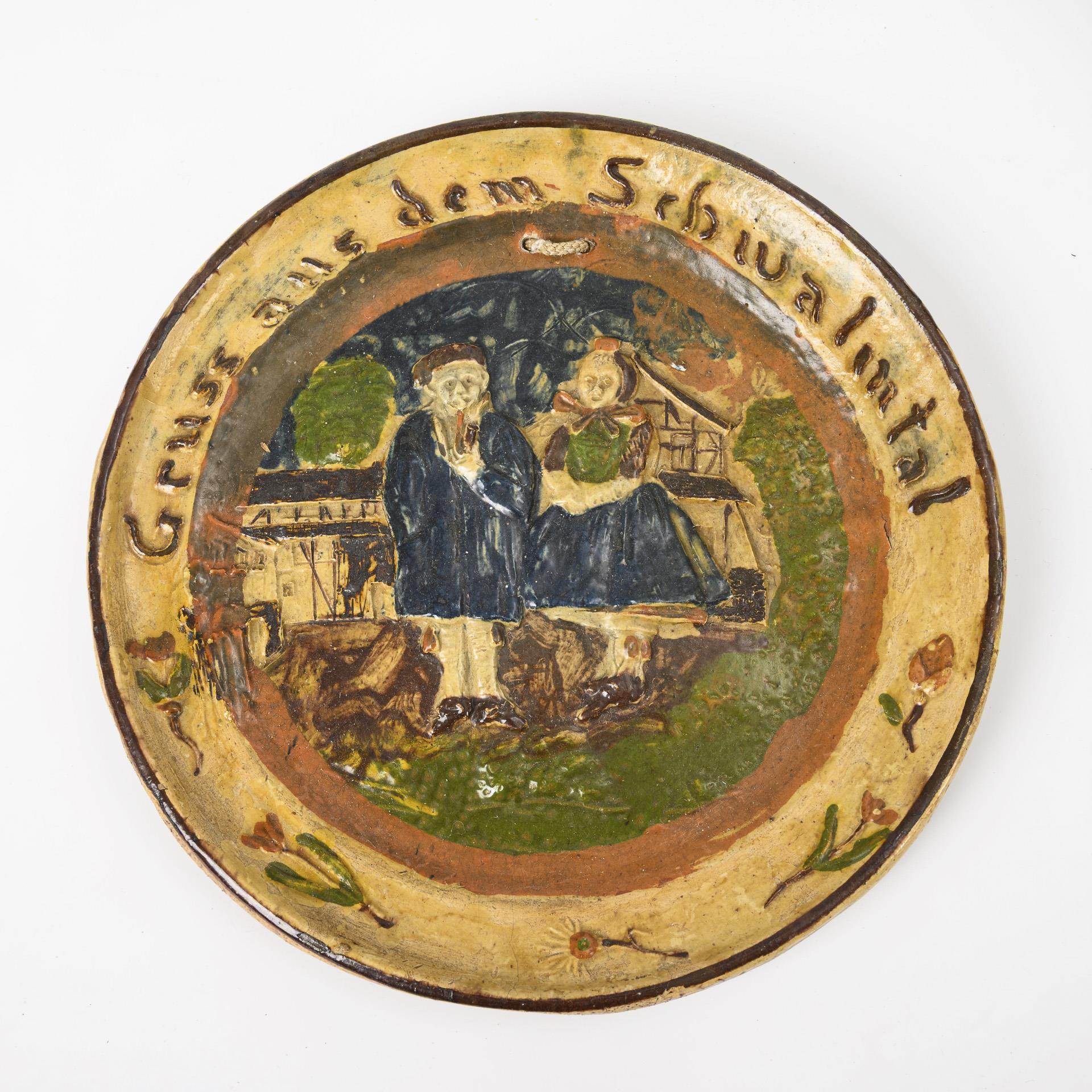 Runde Teller mit verschiedenen Sprüchen und 1x mit Bauernpaar in Schwälmer Tracht, bezeichnet "Gruss aus dem Schwalmtal". Jeweils mit ergänzter Aufhängung. Alters- und Gebrauchsspuren, partiell Glasurbestoßungen, Bauernpaarteller am Rand mit Haarriss.