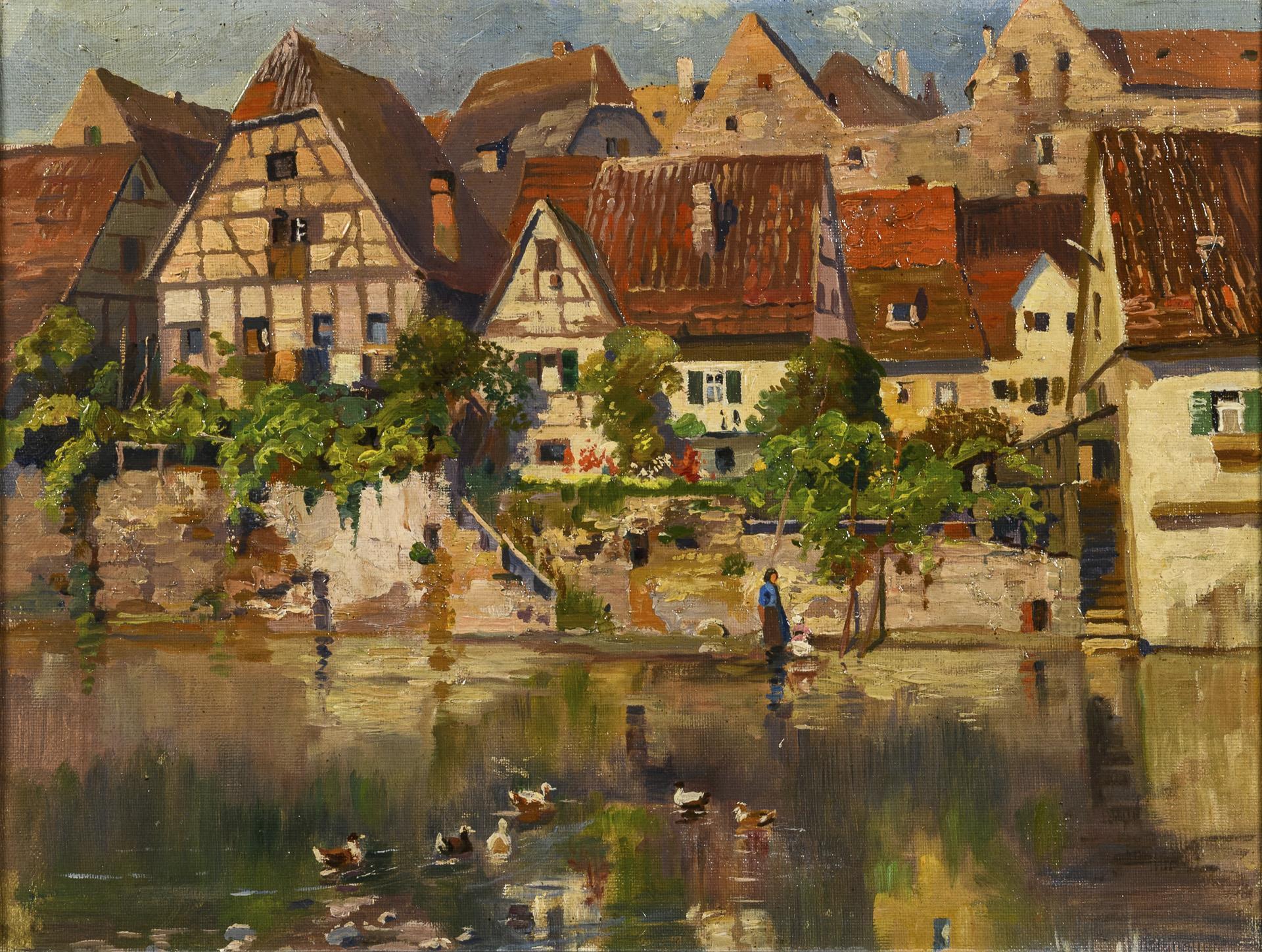 Sonnige Ansicht einer Altstadt mit Fachwerkhäusern und Staffage.