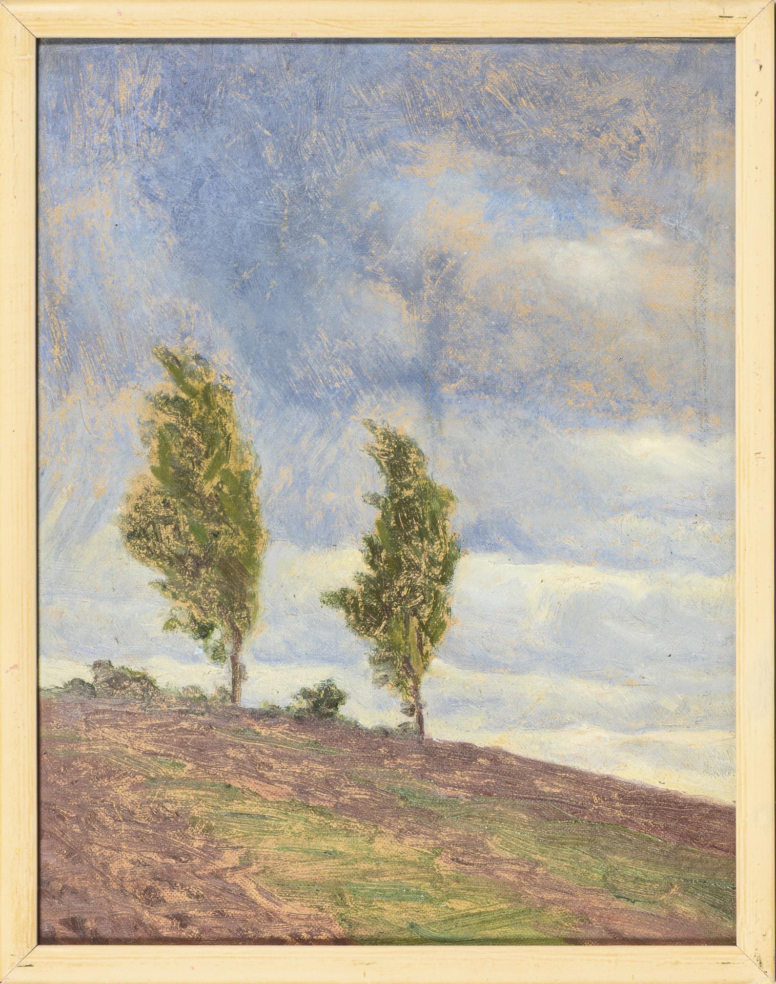 Bäume im Wind auf einer Anhöhe unter bedecktem Himmel.