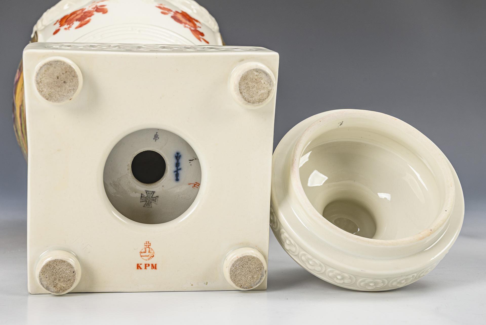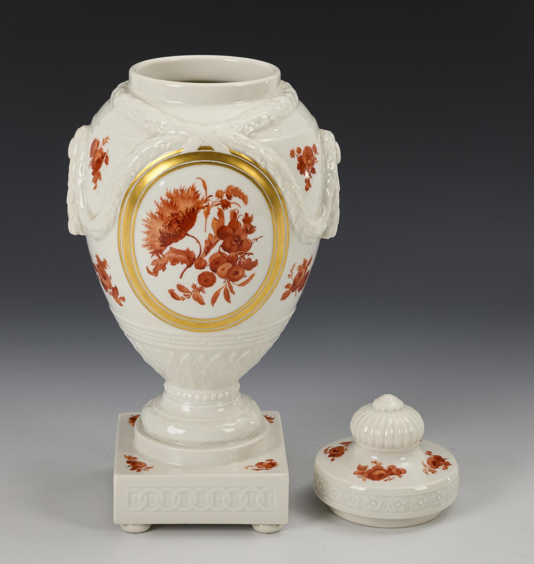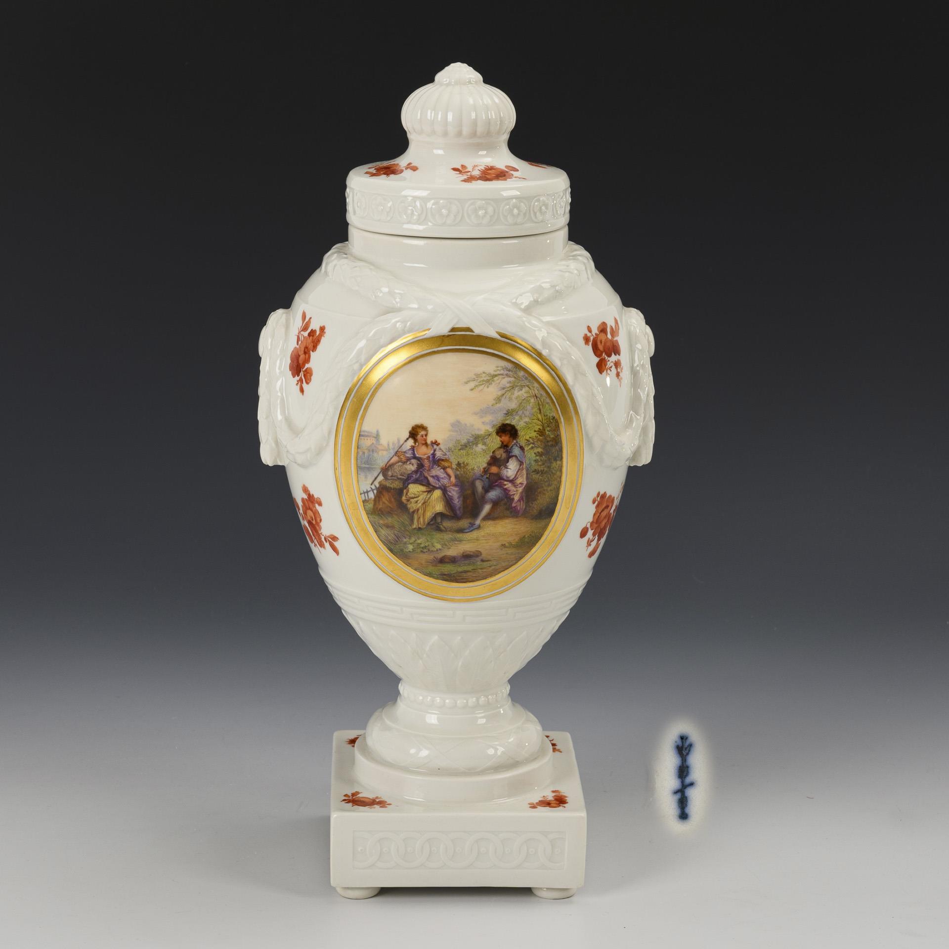Ovoider Korpus mit Lorbeergirlanden, Knaufdeckel und Rundfuß, auf Quadratplinthe mit vier gedrückten Kugelfüßen. Schauseitig eine Ovalkartusche mit der Darstellung eines Schäferpaares in einer Flusslandschaft, verso ein korallenrotes Blumenbukett. Minimale Bestoßung an 1 Sockelecke und 1 Lorbeerfestonhandhabe.