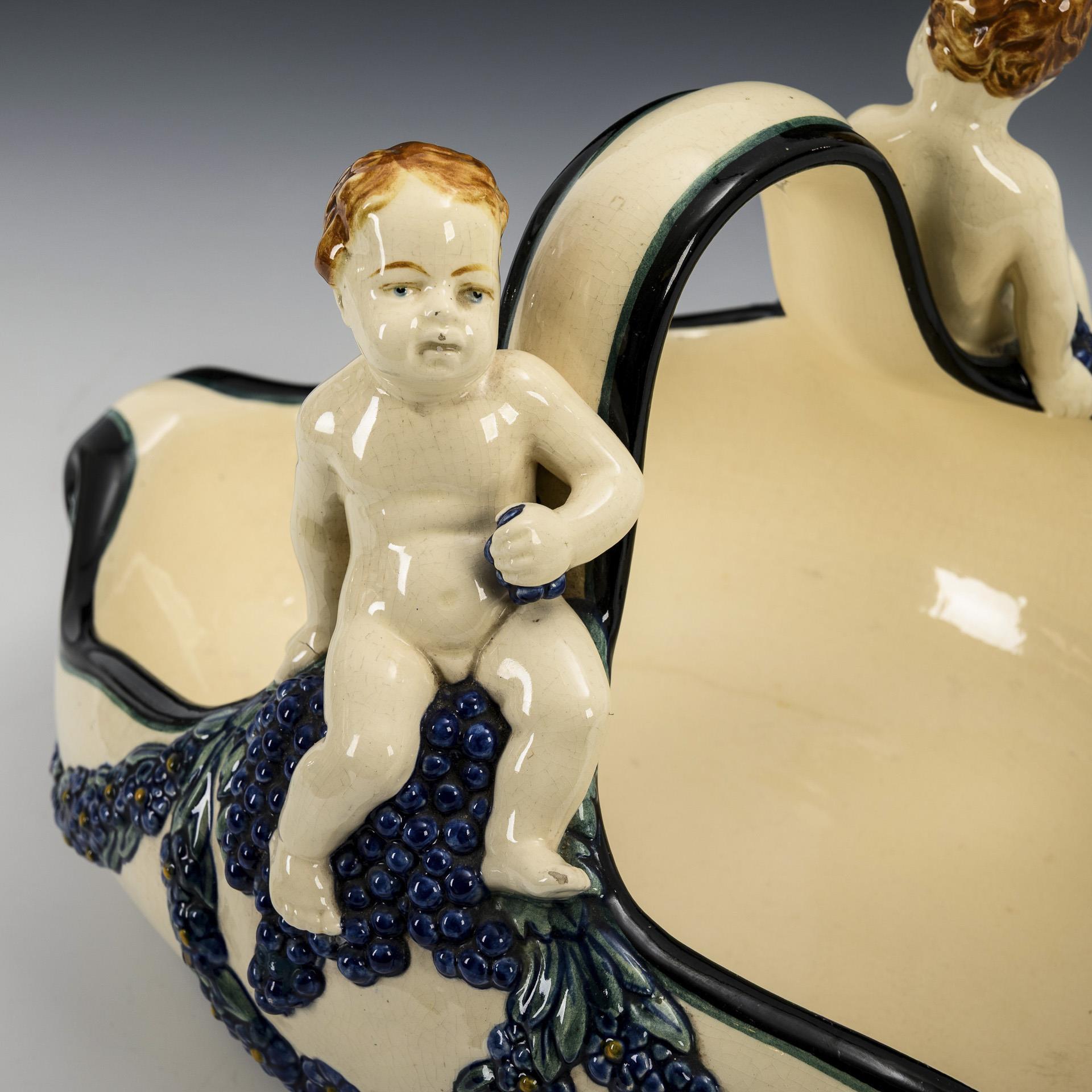 Ovale Schale mit volutierten Enden und umlaufendem Reliefdekor mit Blumengirlanden und Traubenschmuck, am Henkel 2 sitzende plastische Putten. An den Füßen und einer Lippe leicht bestoßen.