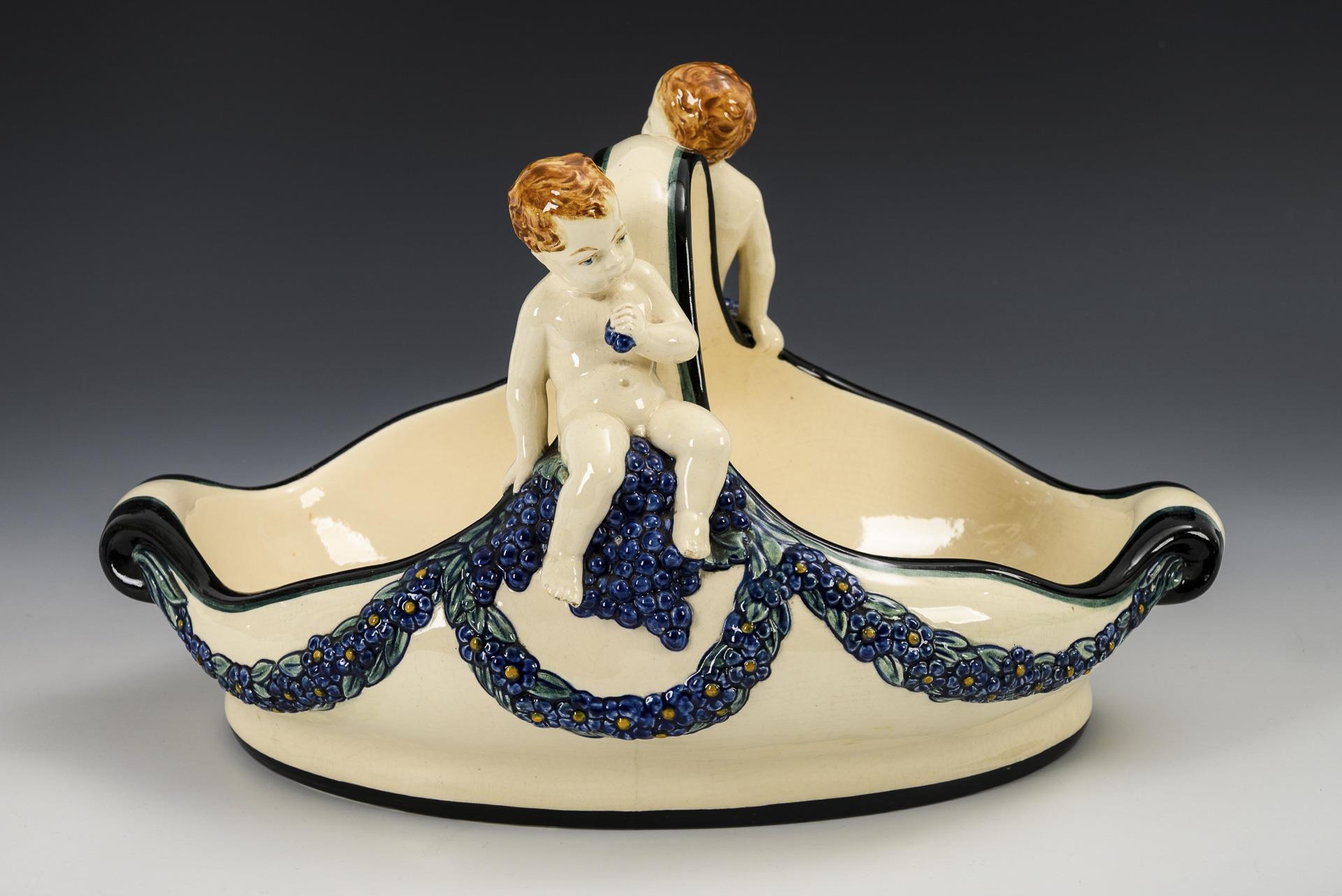 Henkelschale mit Putten. Karlsruher Majolika.
