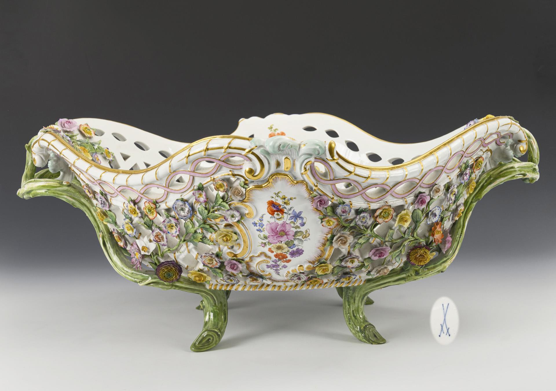 Vierpassiger Korb mit gitterdurchbrochener Wandung, zwei Asthandhaben mit insgesamt vier Astfüßen, reichem Blütenbelag und qualitätvoll gemalten Blumenbuketts. Bestoßungen und Restaurierungen am Belag, alle Fußenden restauriert, am Durchbruch herstellungsbedingt Glasurfehlstellen und partiell Brandrisse.