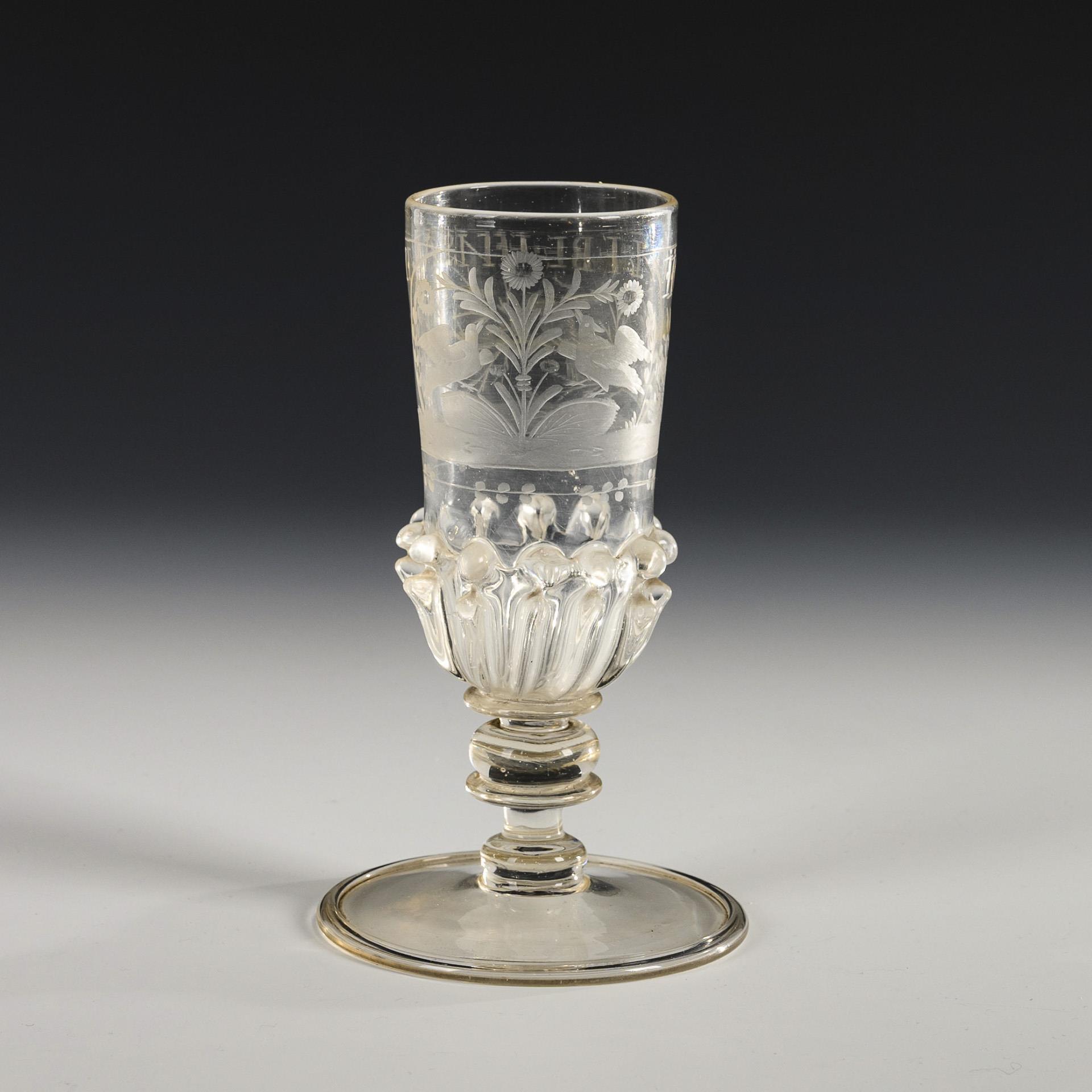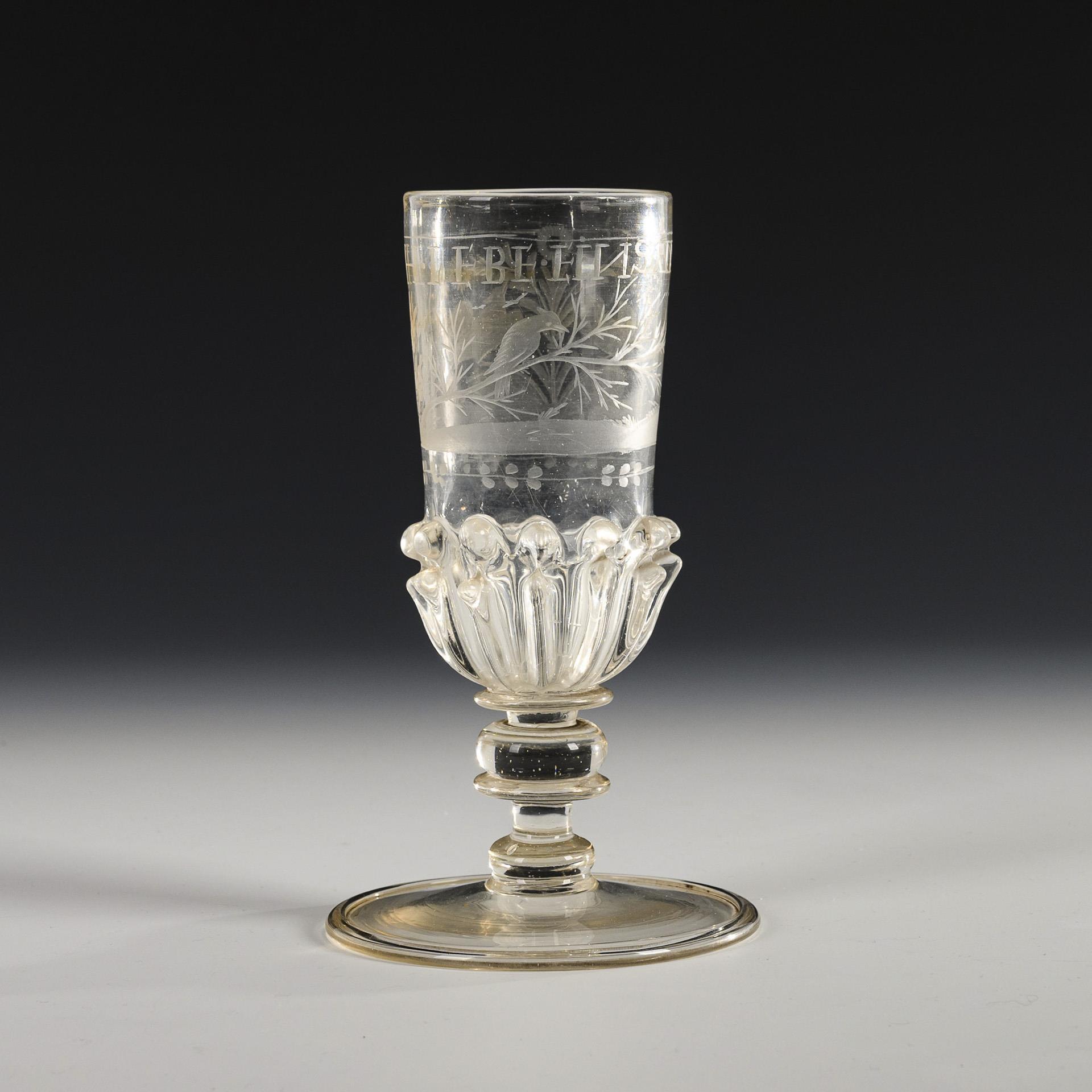 Kuppa mit einem Rippenkranz unter einem Nuppenkranz am Kuppaansatz, mehrfach gegliederter Schaft, Scheibenfuß mit nach oben umgeschlagenem Rand; Abriss. Auf der Kuppa gravierte Vogelmotive und die Bezeichnung "Ich lebe einsam".