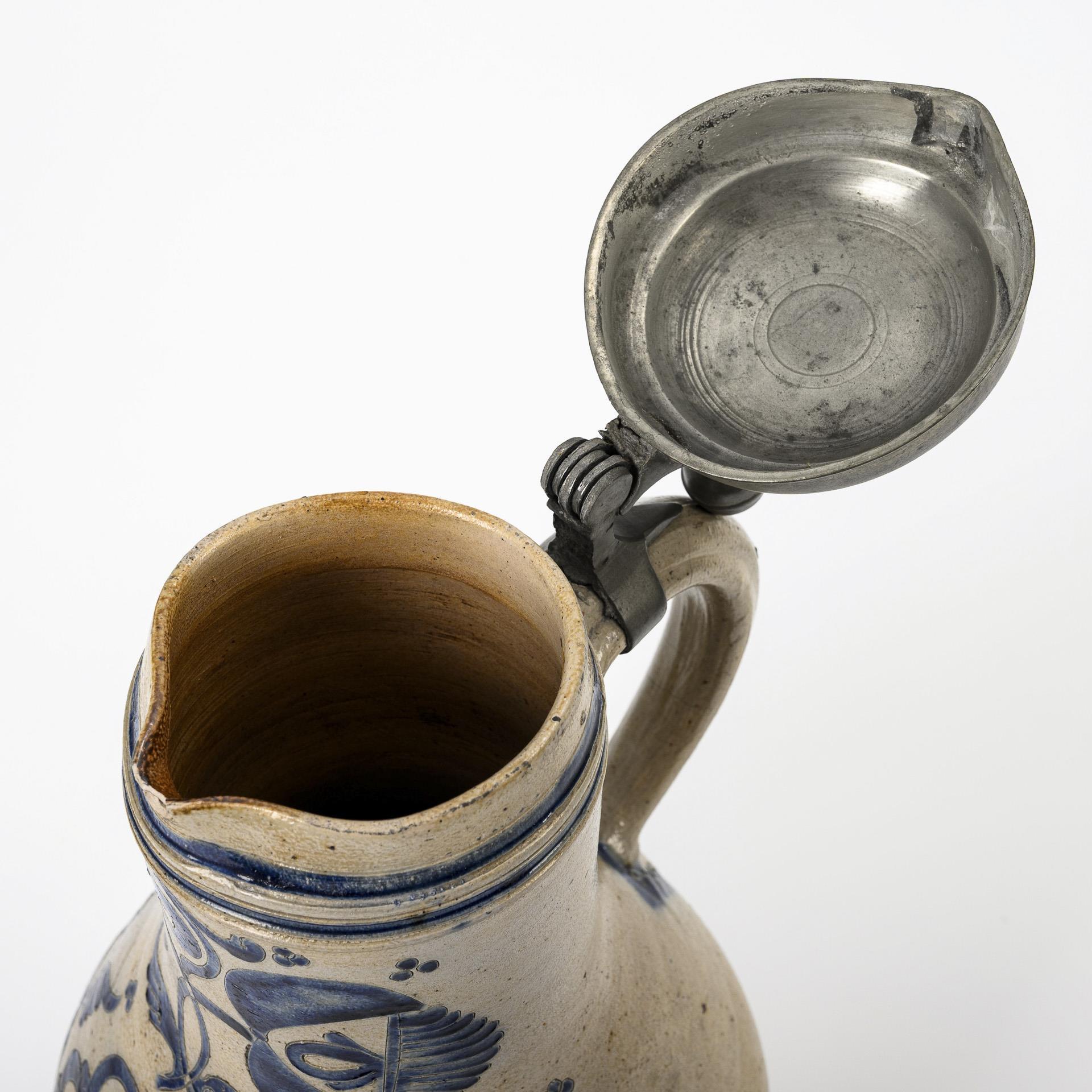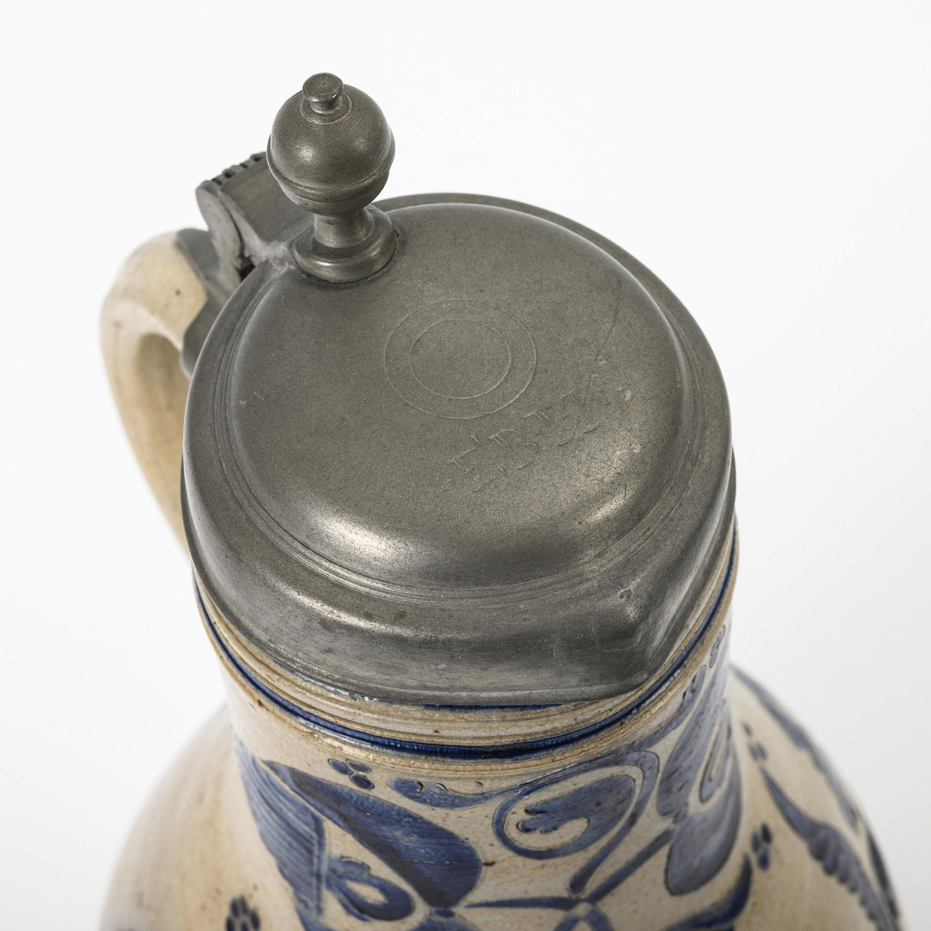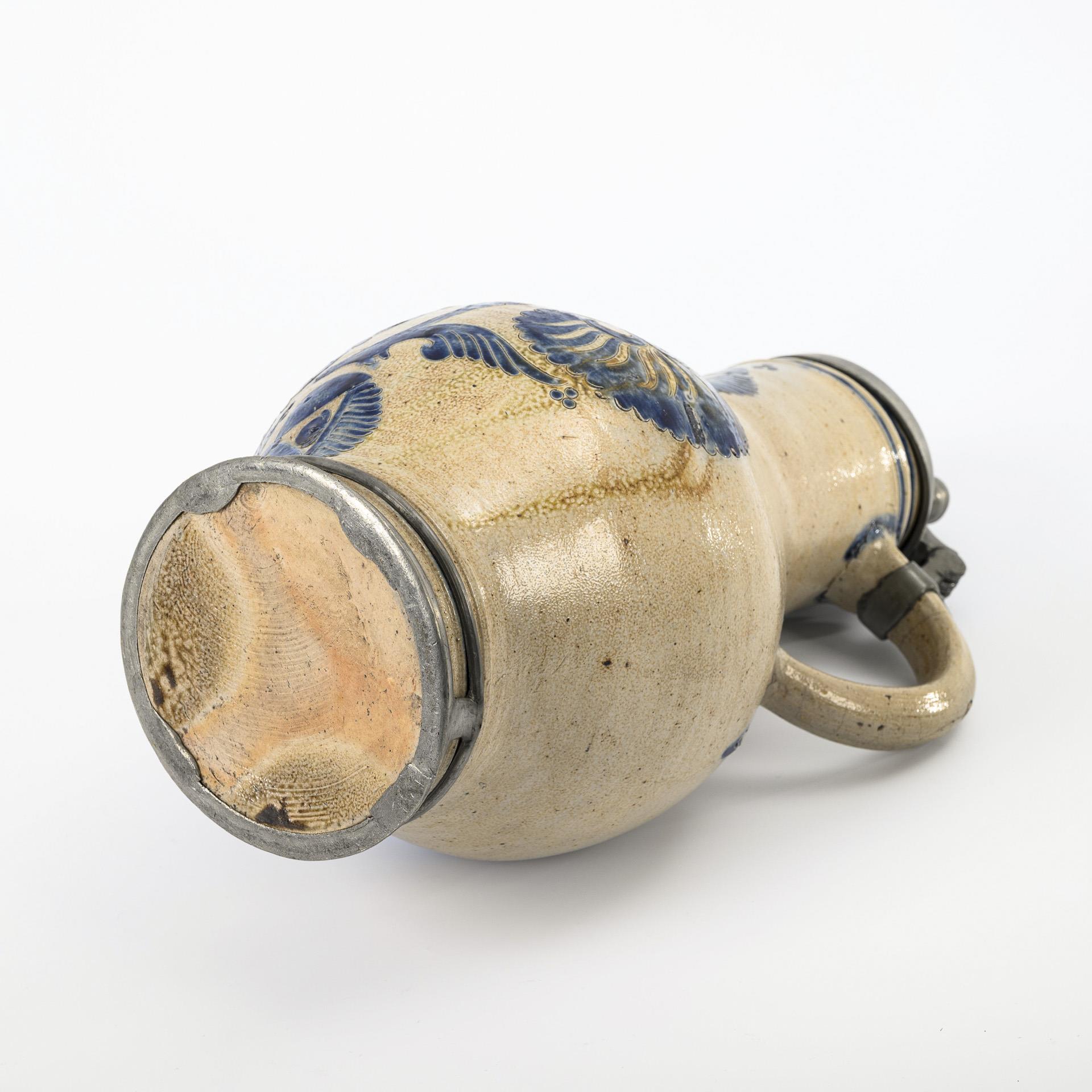 Birnform mit spitz auslaufendem Bandhenkel, schauseitig eine große Rosette mit flankierenden großen Fächerblumen. Zinndeckel mit Kugeldrücker, graviert EBM, Zinnstandring. Glasurdefekte, in der Front ein Ausbruch am Dekor, Henkel rissig, an Hals und Schulterbereich fein haarrissig.