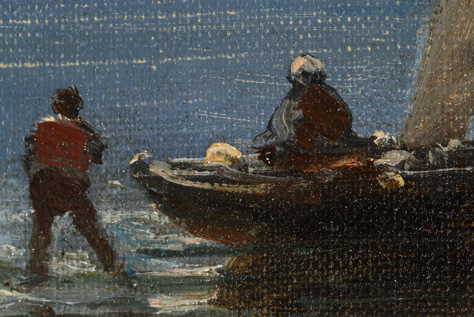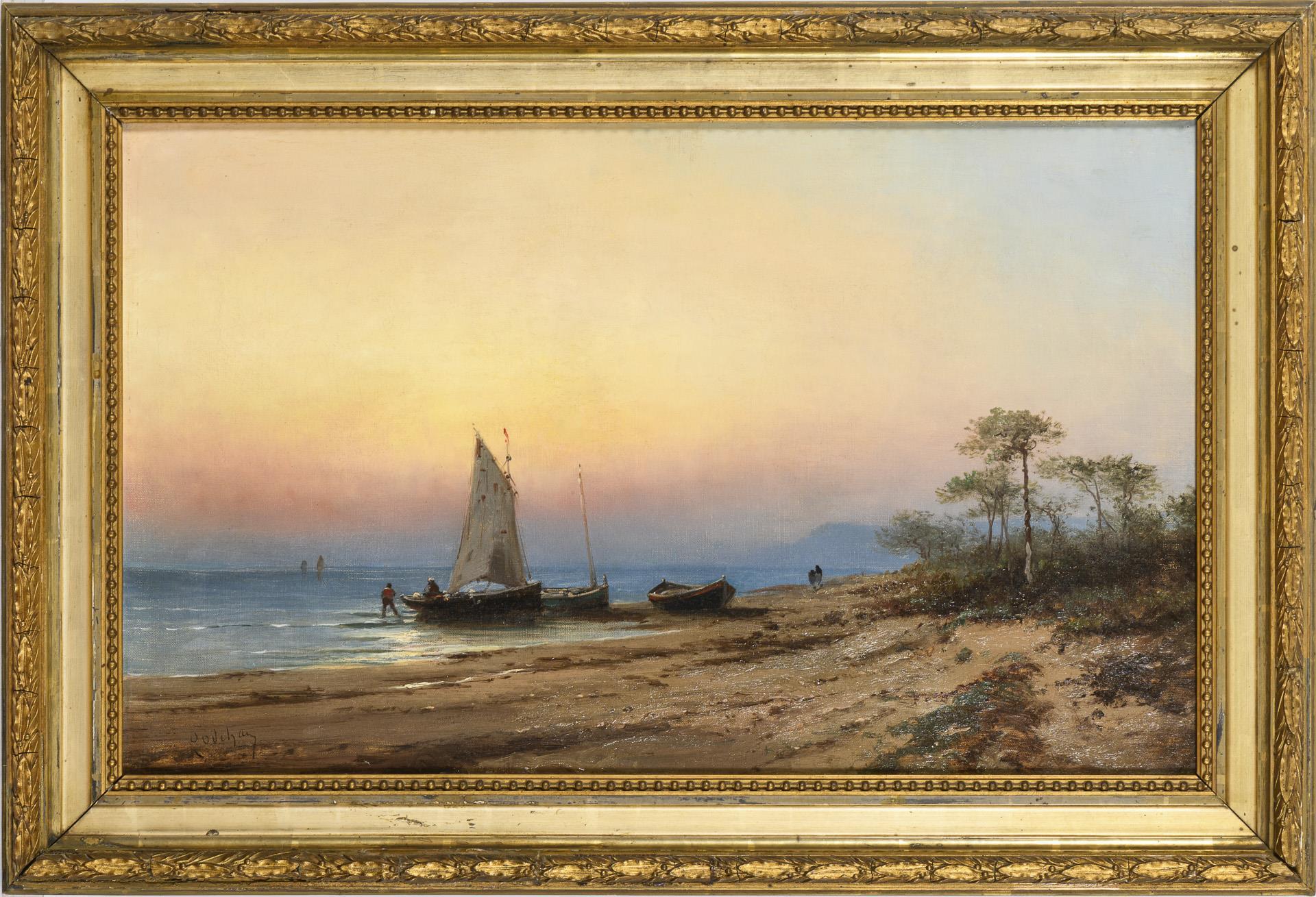 Fischerboote am Abend am Sandstrand mit Blick hinaus aufs Meer. Eine kleine restaurierte Stelle mit Hinterklebung.