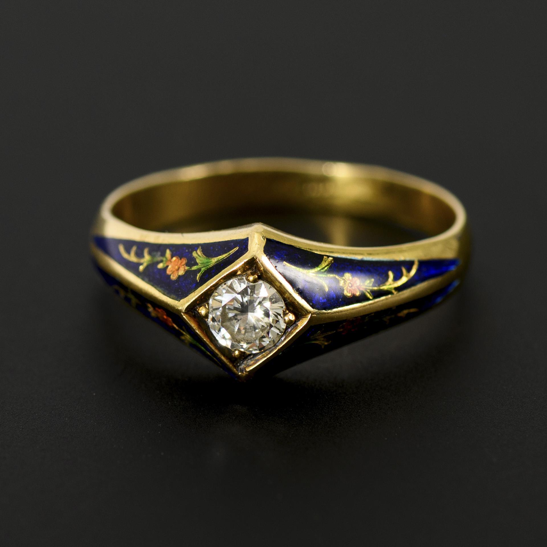 Historisierend gestalteter Ring mit Brillant, die Ringschultern in blau sowie mit floralen Details in grün und rot mit Kaltemaille gestaltet. Leichte Tragespuren an der Ringschiene.