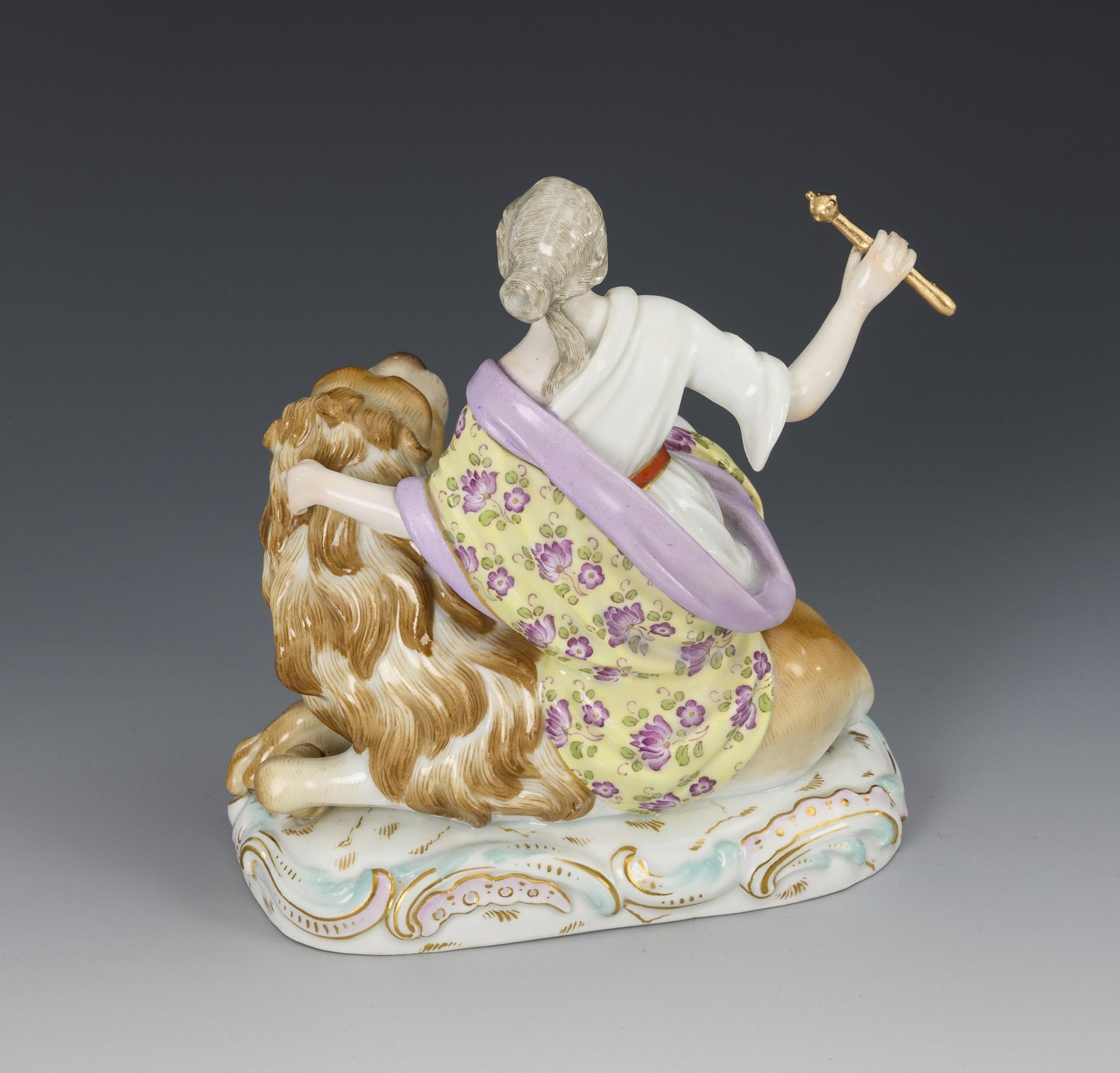 Auf einem Löwen sitzende junge Frau mit Zepter. Linker Fuß, rechte Hand und Zepter restauriert.
