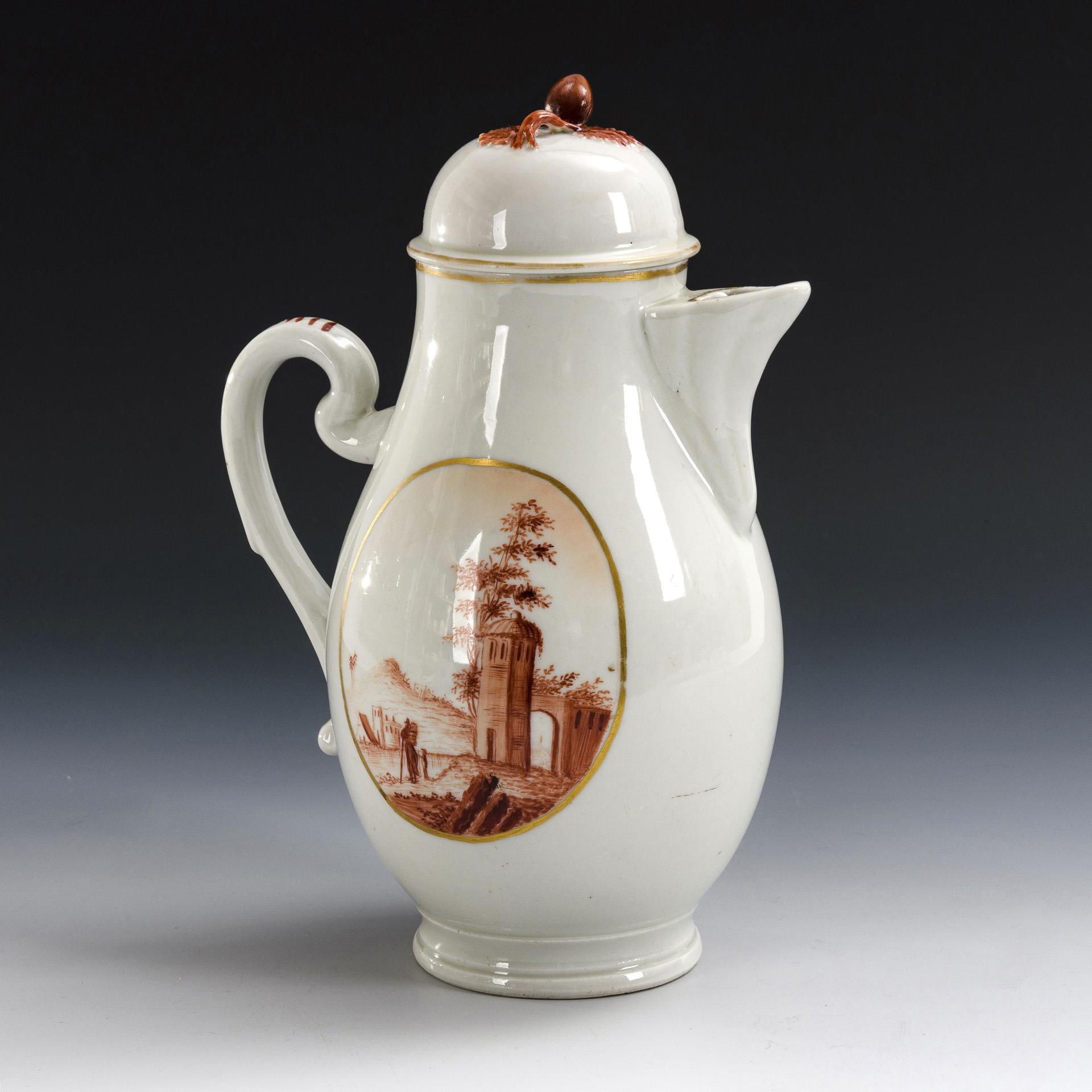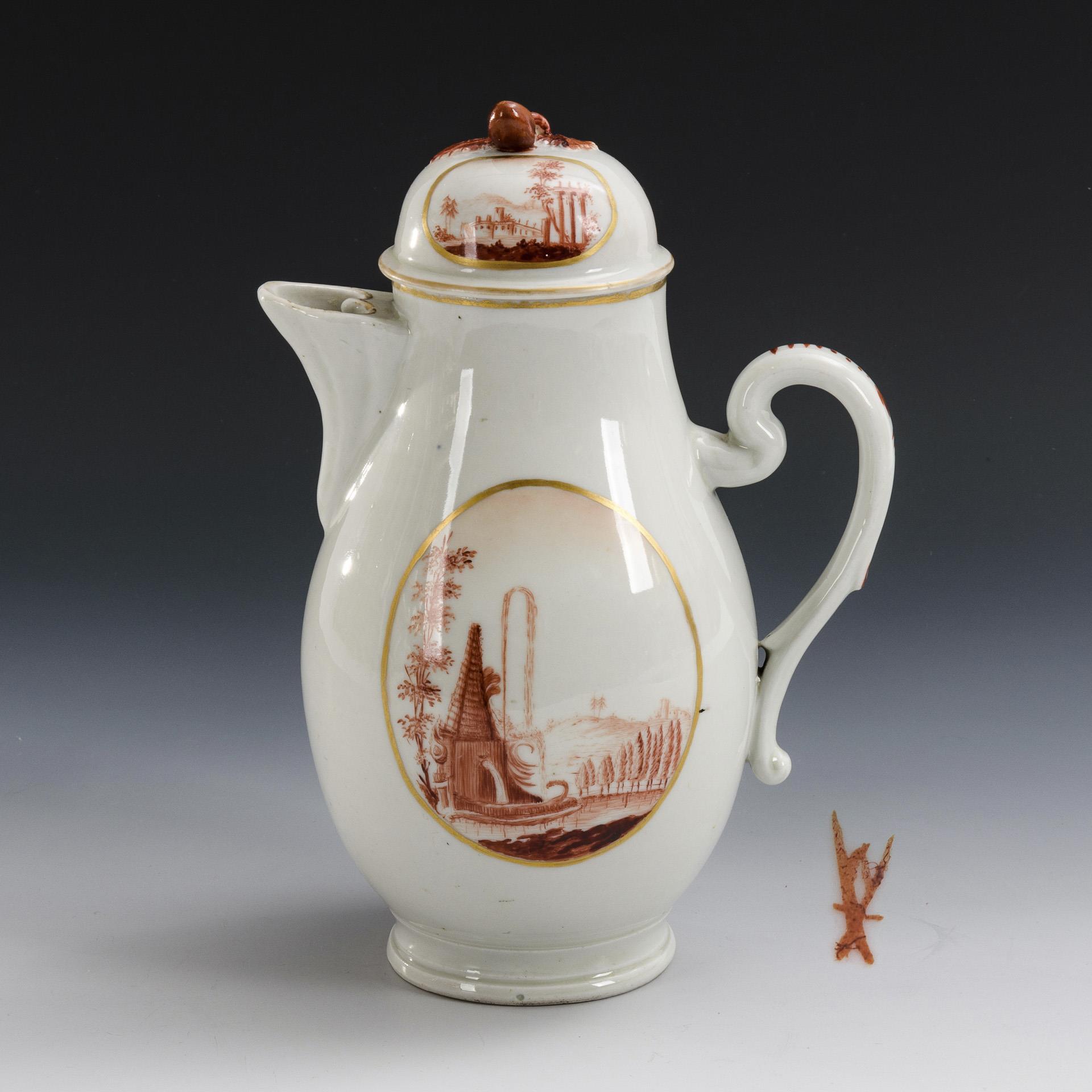 Birnkanne mit Fruchtknaufdeckel. Beidseitig ein goldgerahmtes Medaillon mit Landschaftsmalerei mit Brunnen, Architektur und Personenstaffage. Deckelfrucht und -blätter restauriert.