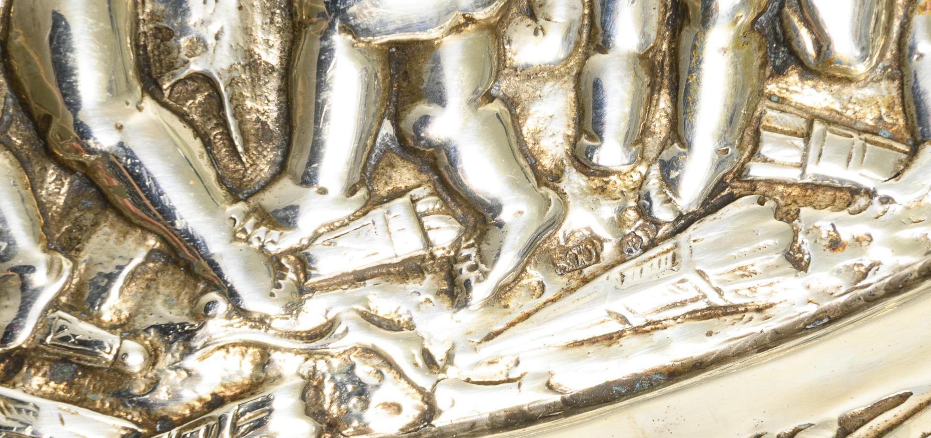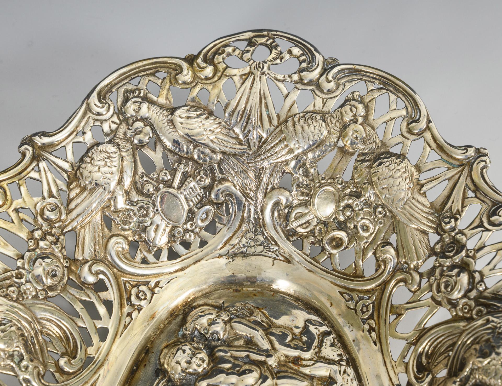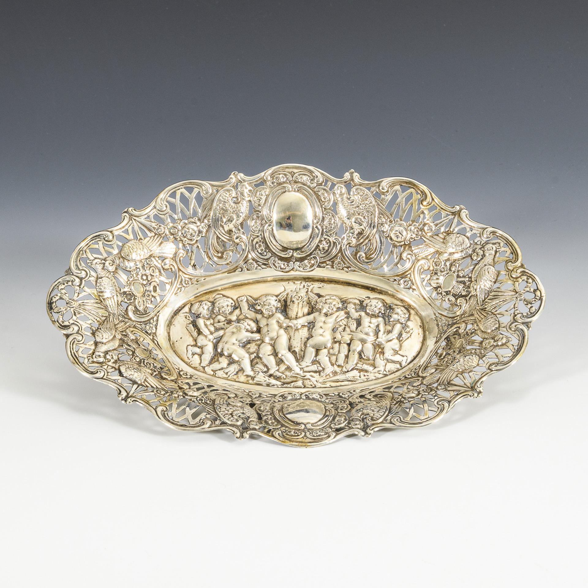 Ovale Durchbruchschale mit tanzenden Putten im Spiegel und Vogelmotiven am Rand.