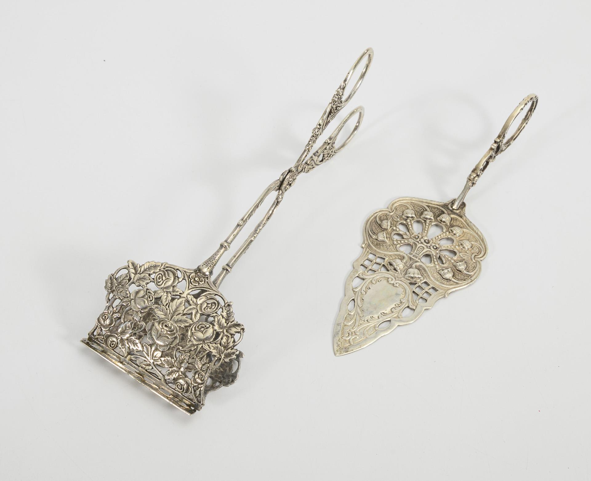 8 Teile, reich reliefiert, meist mit Blütenmotiven: 2 Tortenheber, Gebäckzange, 3 Zuckerlöffel, kleine Vorlegegabel und Gewürzschälchen.