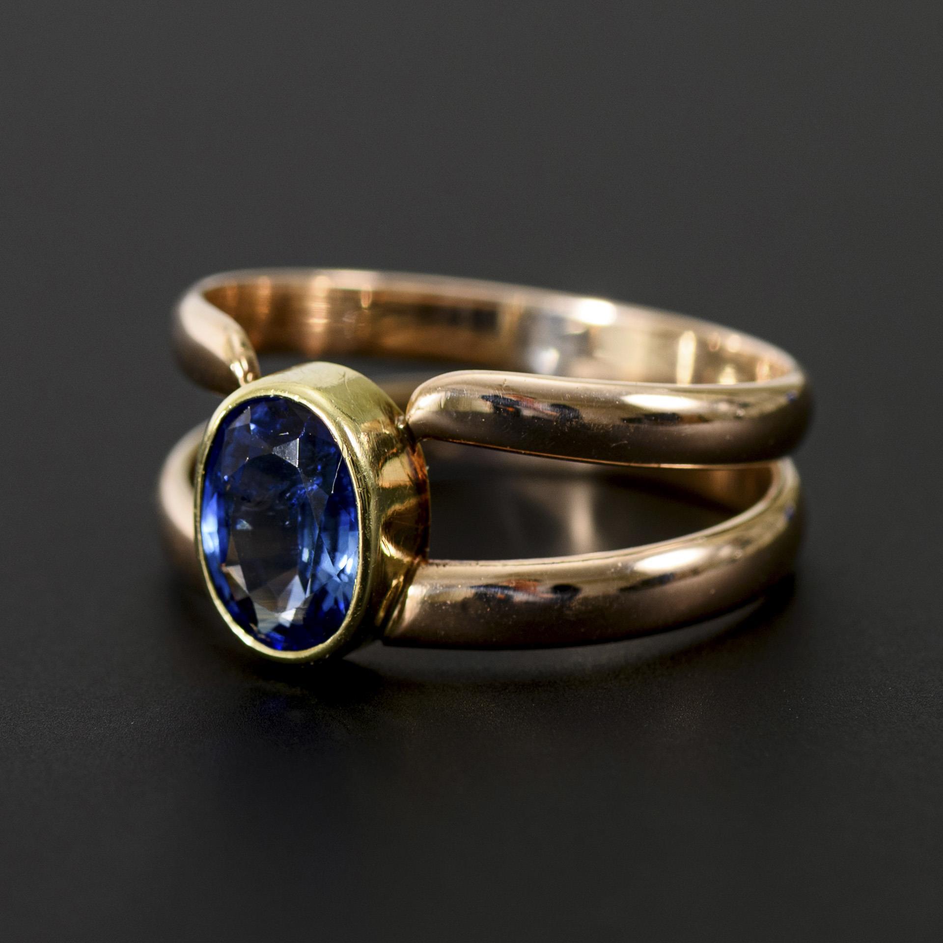 Blauer Farbstein, wohl Saphir, längsoval zwischen einer breit angelegten doppelbändrigen Ringschiene aus Roségold, in Gelbgold gefasst.