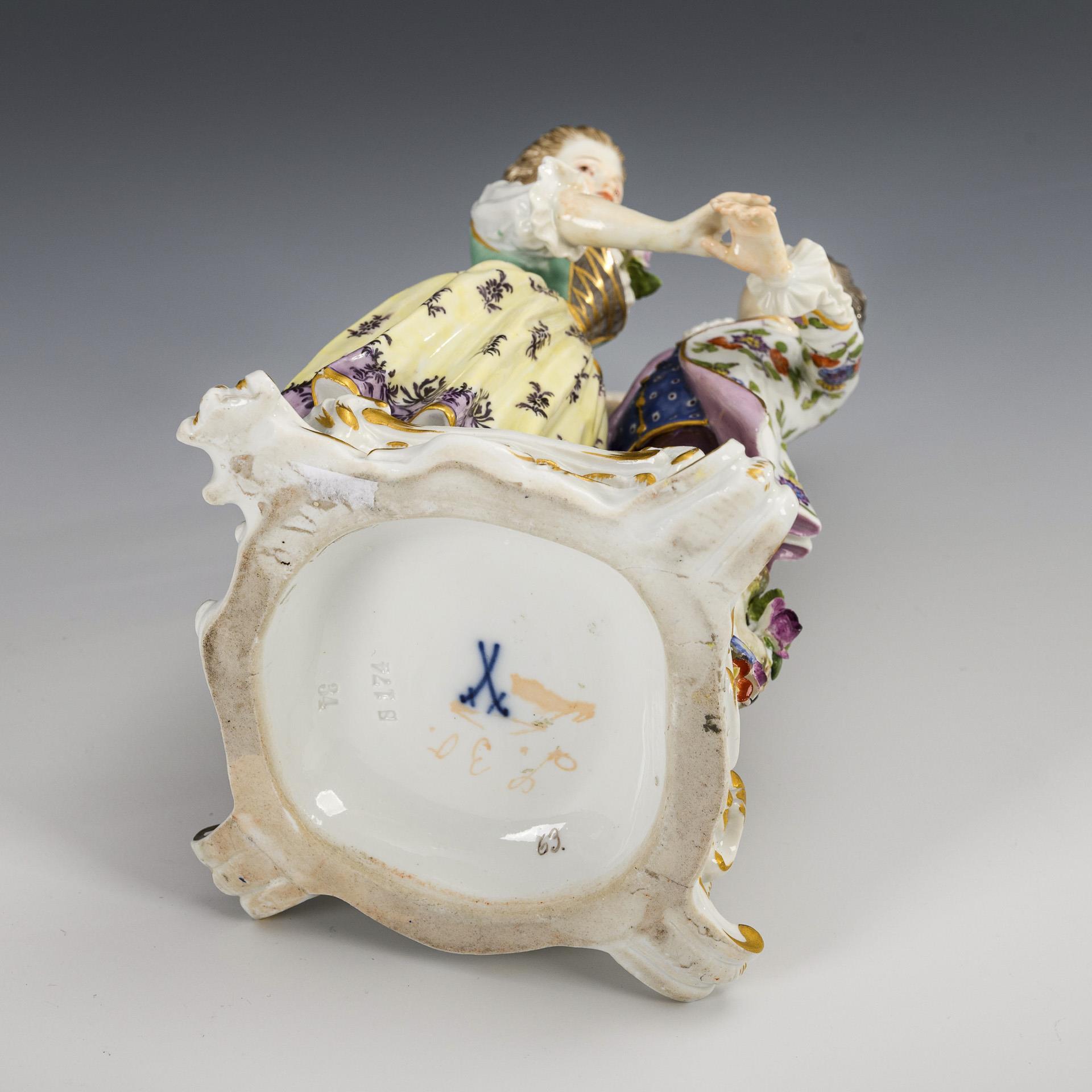 Auf einem blütenbelegten Rocaillesockel stehendes Kinderpaar in Tanzpose. Rechte Hand des Mädchens und partiell Blüten und Blätter restauriert.