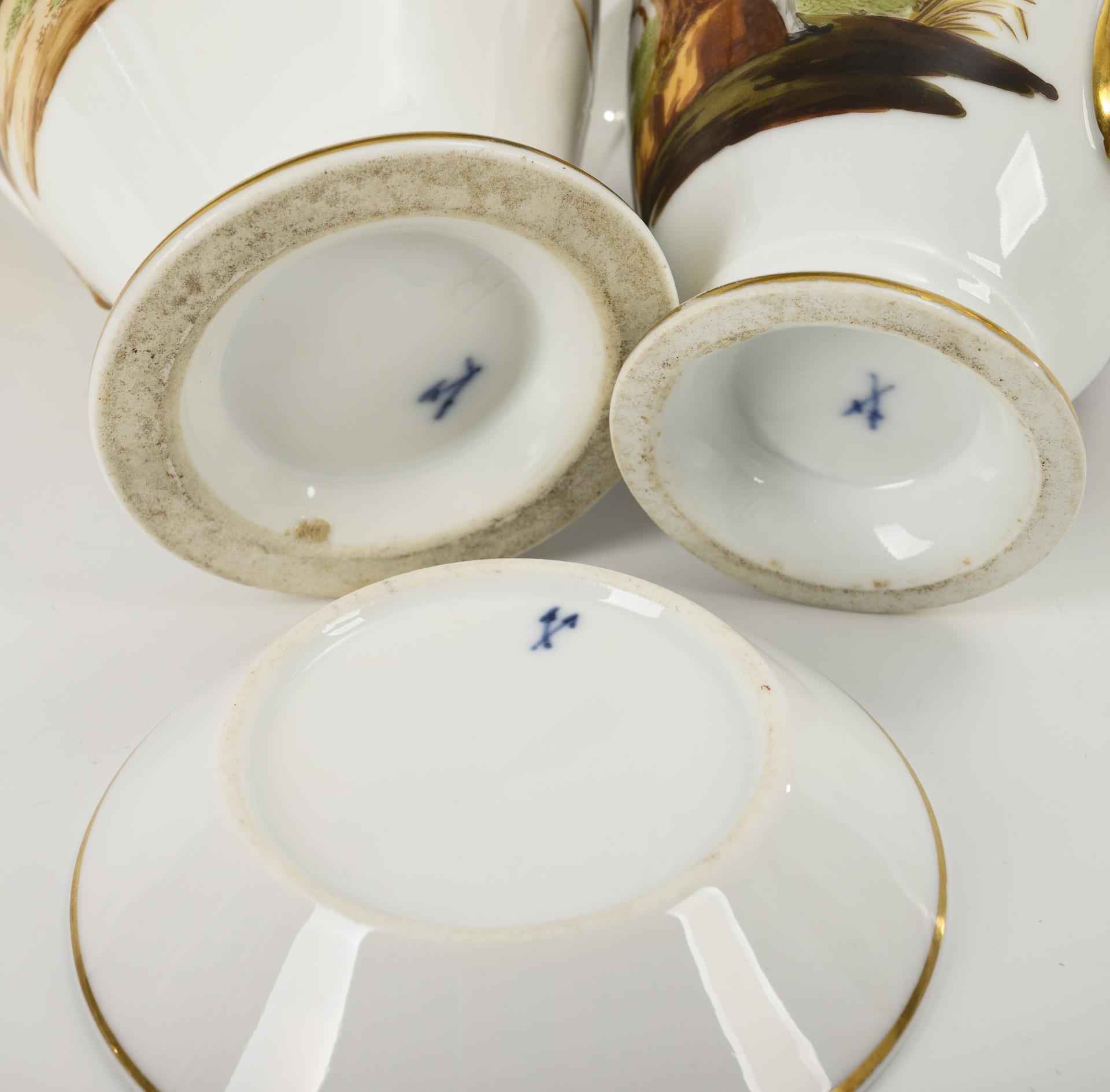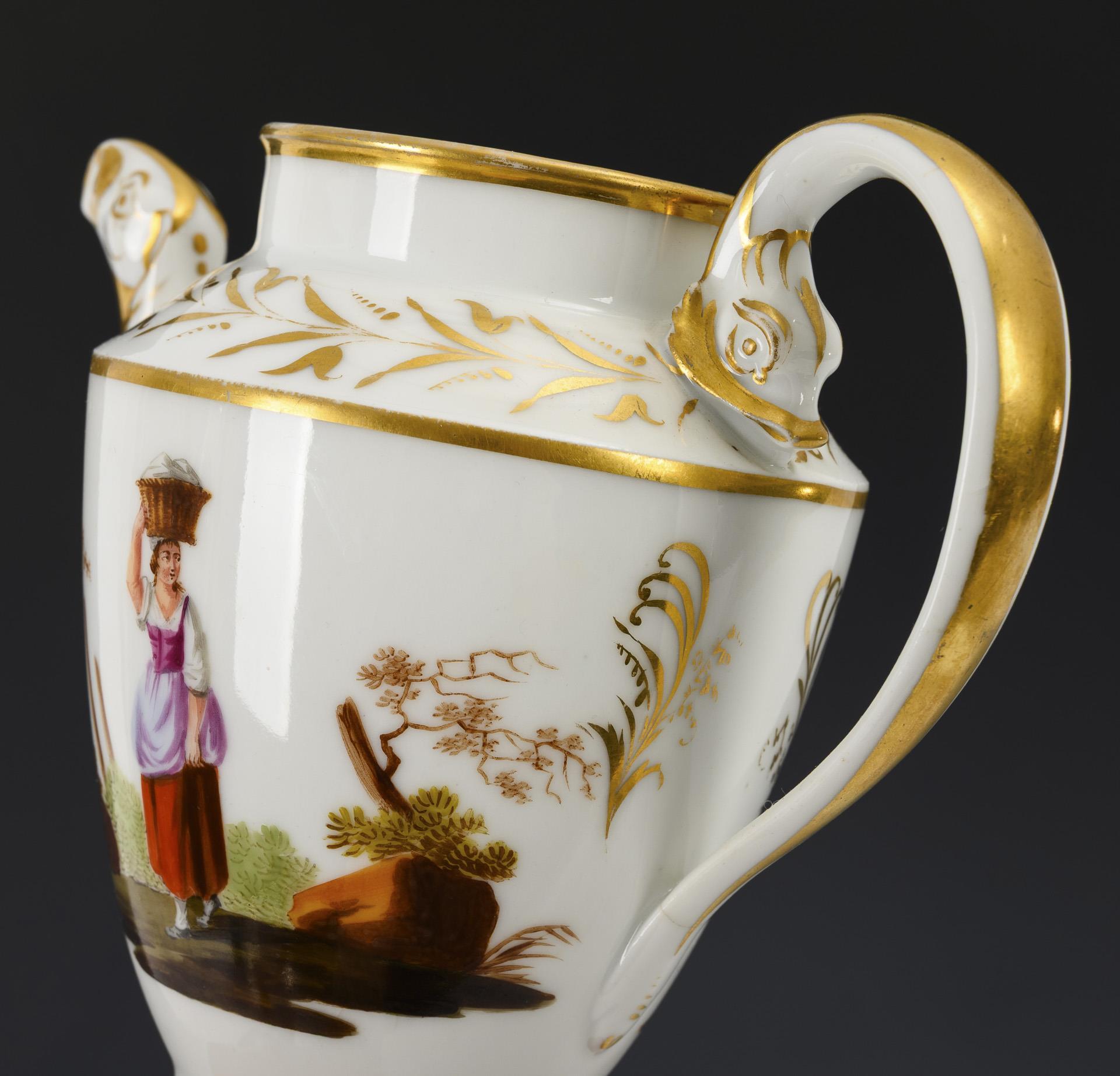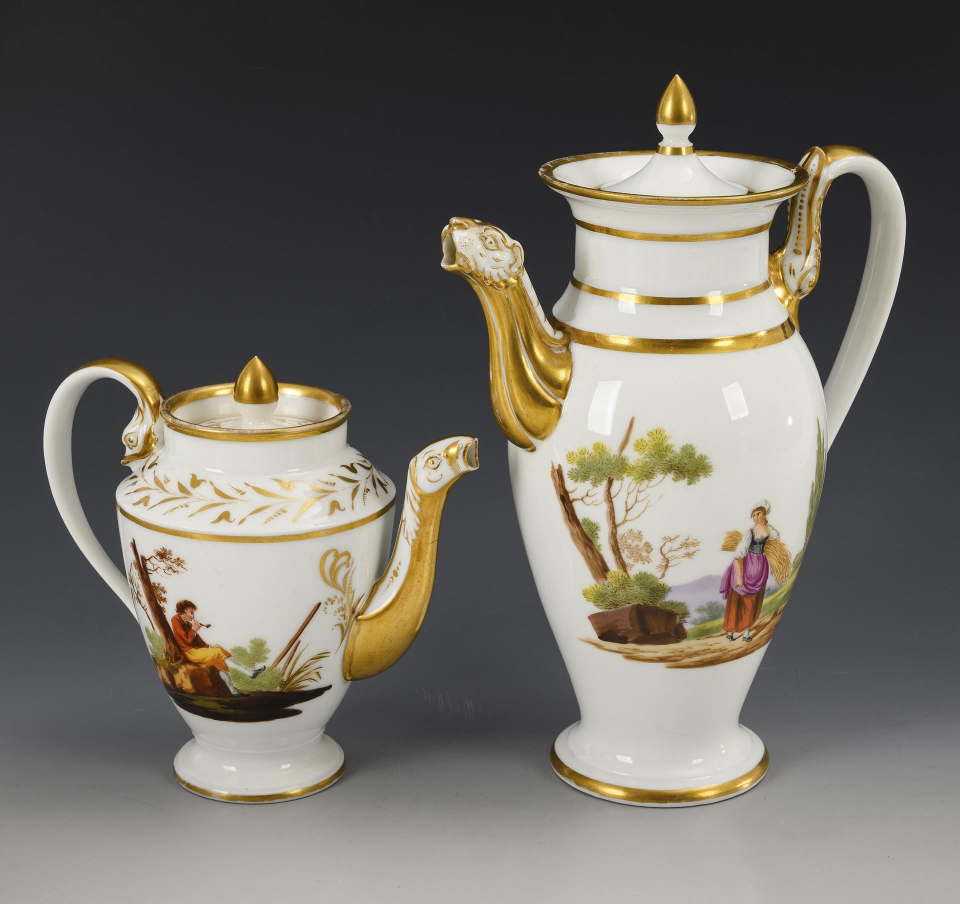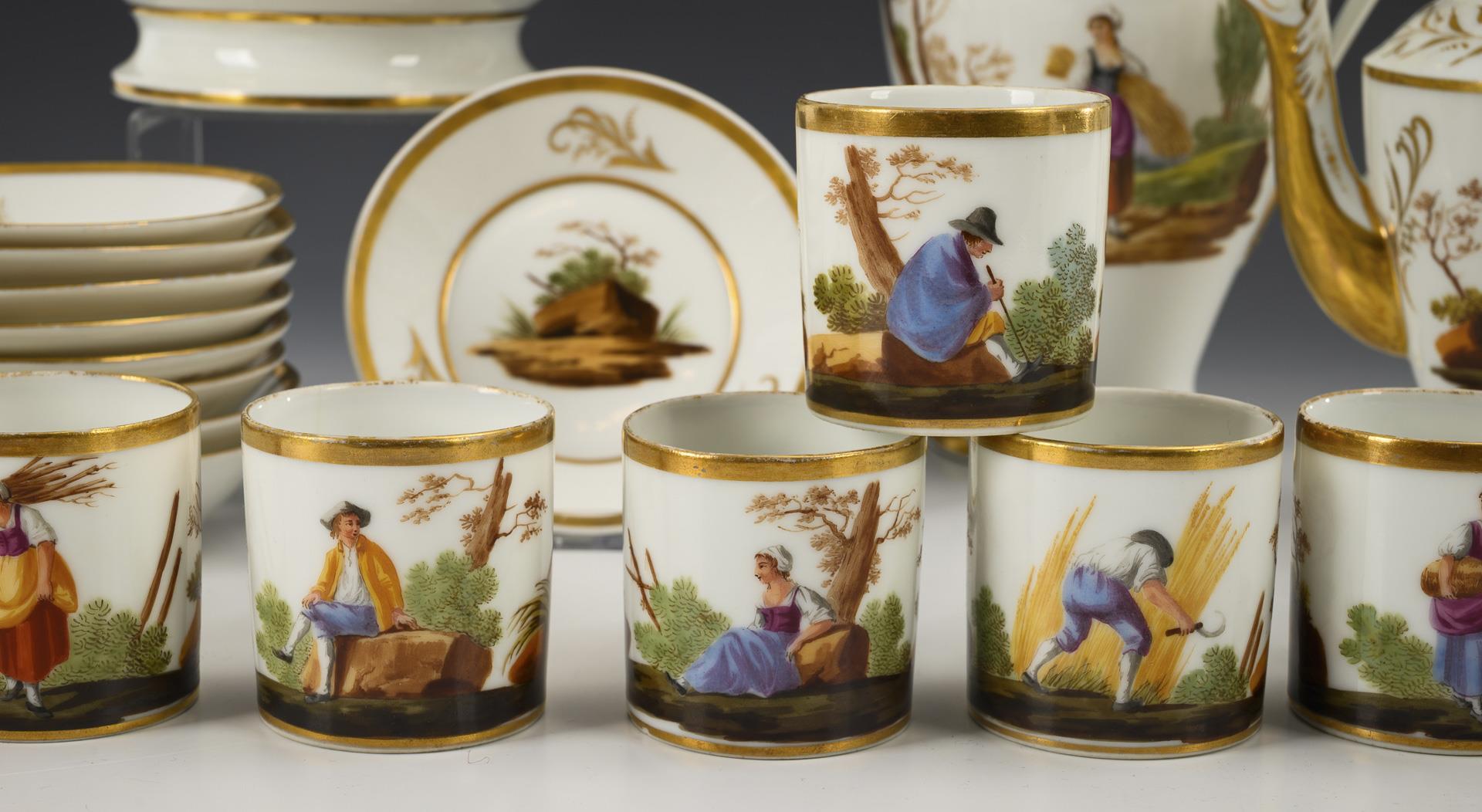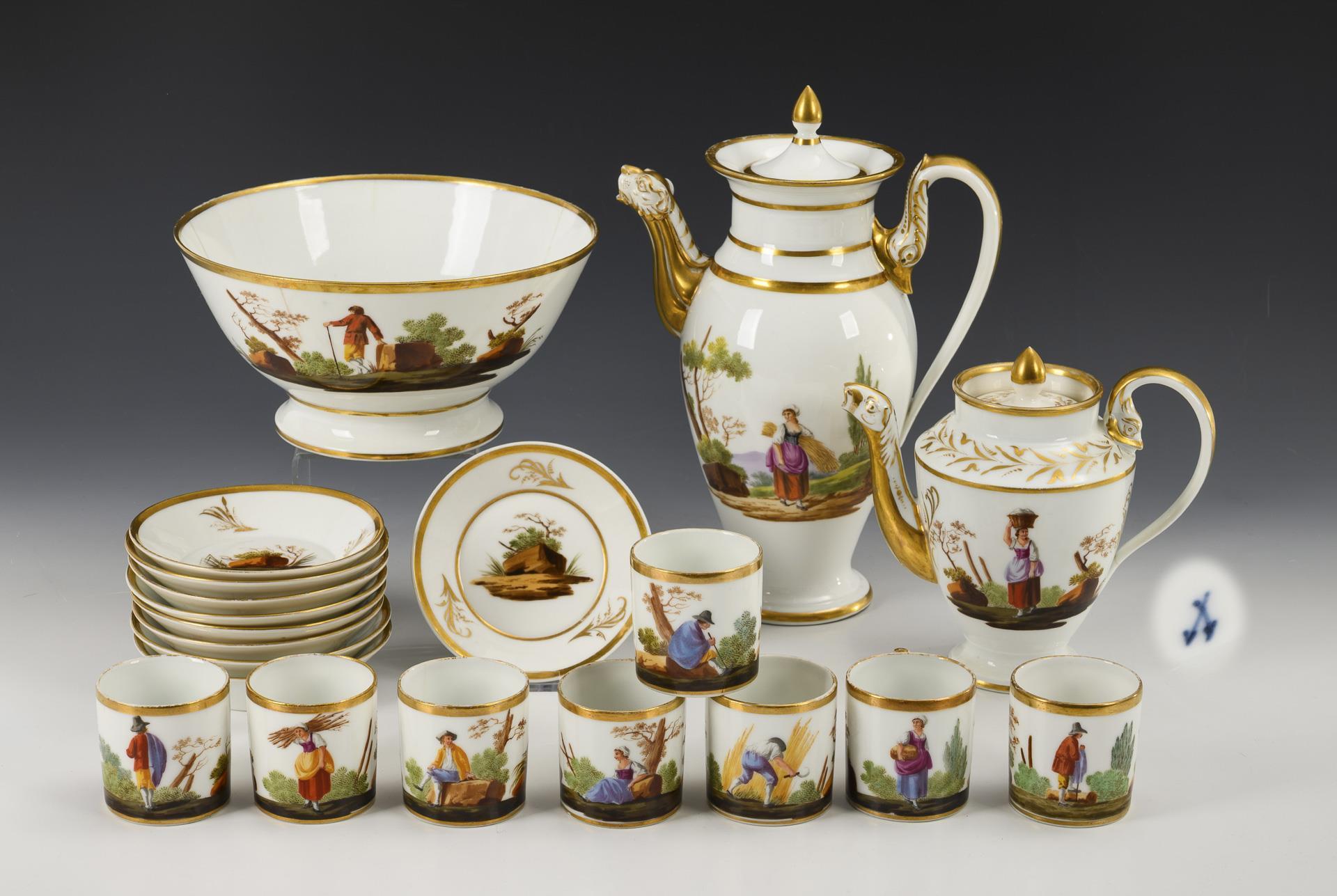 20 Teile. Bemalt mit verschiedenen Bauernfiguren in einer Landschaft. 2 Kannen (H 17,5 und 28,5 cm), 8 Zylindertassen (H 6,5 cm), 9 Untertassen (Ø 13,5 cm) und 1 Spülkumme (Ø 22,5 cm). Kumme mit Haarrissen, Haarriss im Henkel der kleineren Kanne, 2 Deckelnase bestoßen, 1 Tasse, 1 Kannenhenkel und 1 Tassenhenkel mit Haarriss, partieller Goldabrieb.