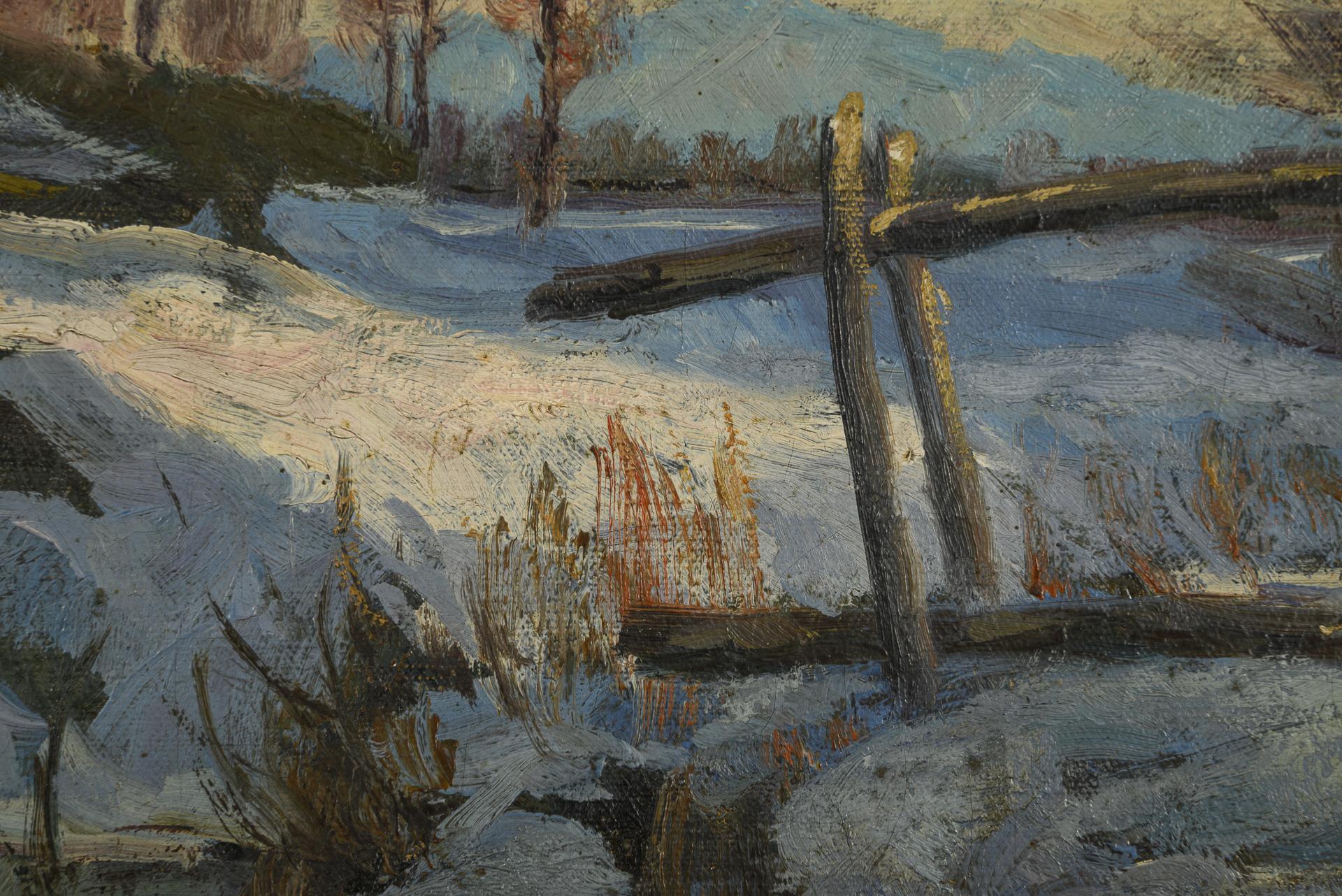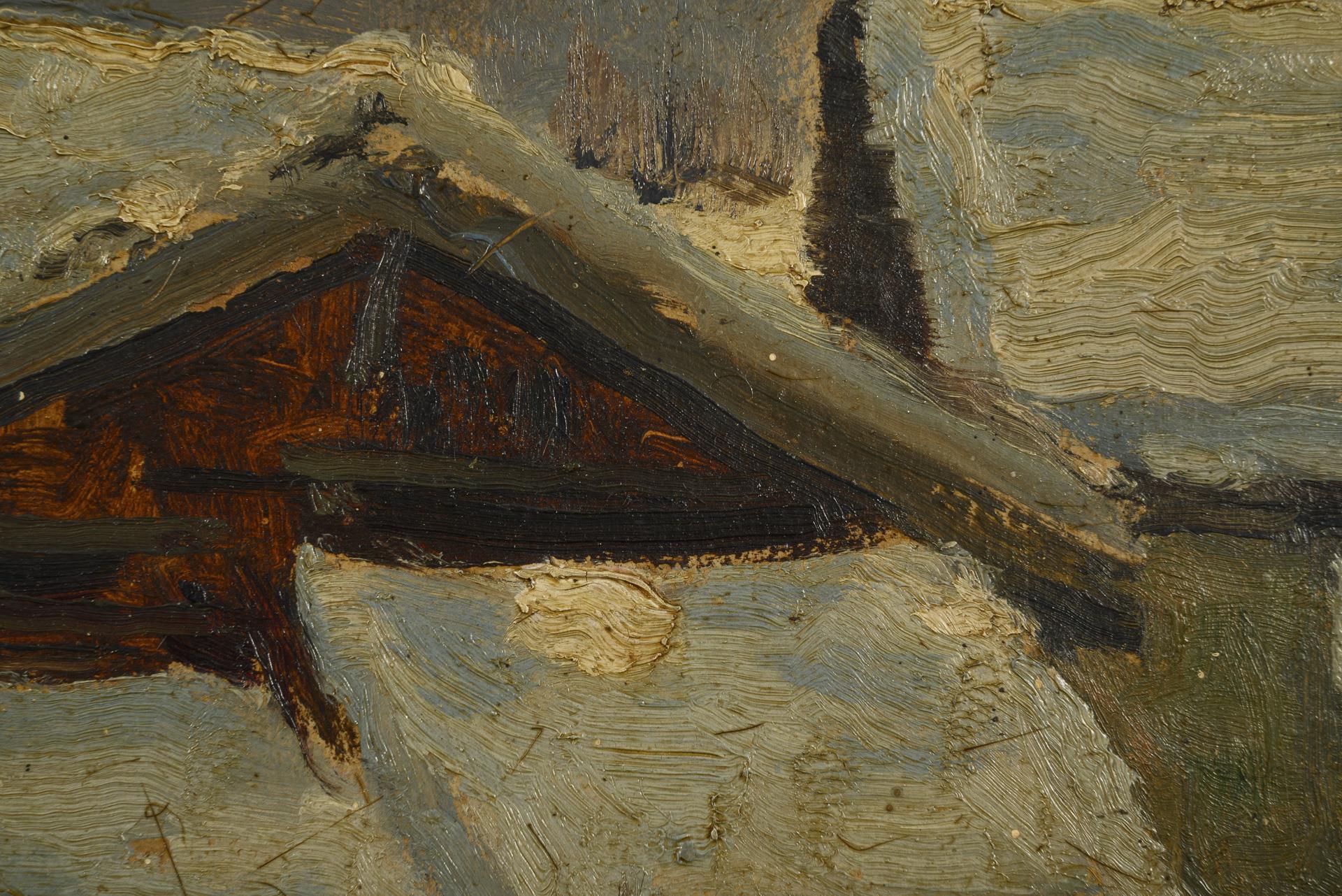 Verschneite Dorfhäuser im Sonnenschein sowie Schneeschmelze am Bach unter leicht wolkigem Himmel. Leichte Altersspuren.