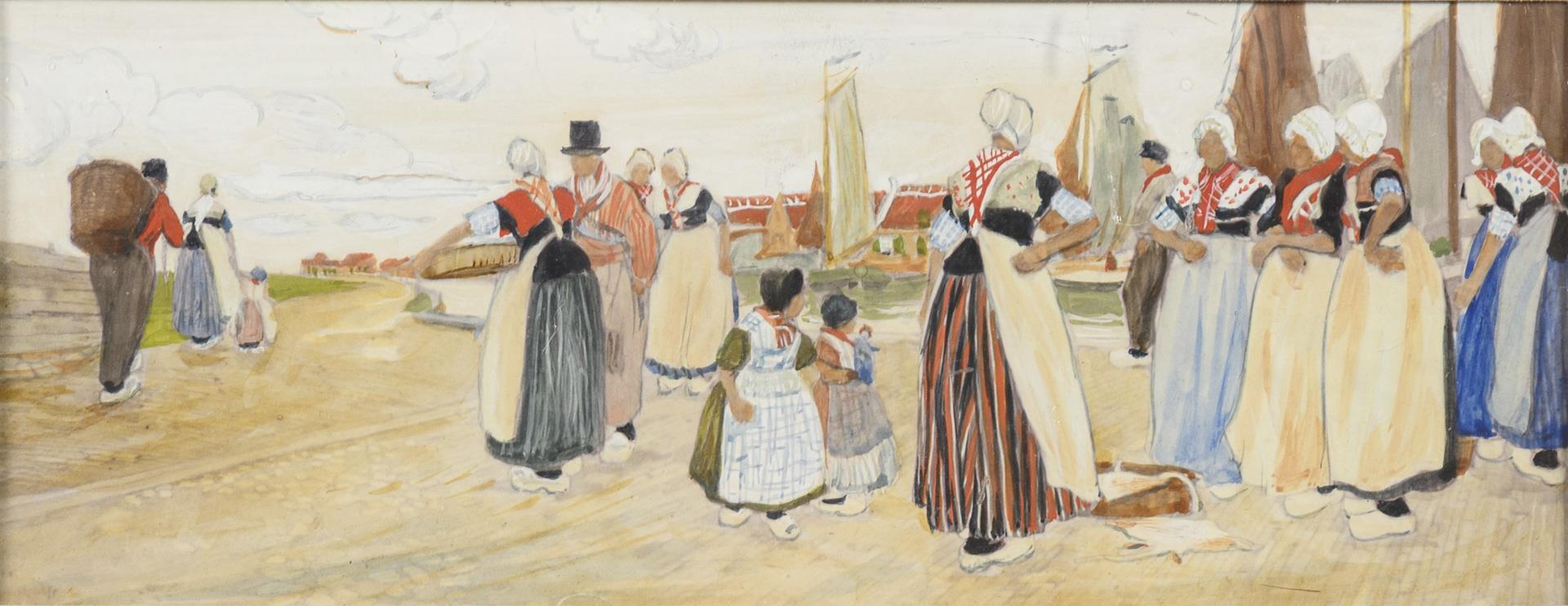 Holländische Frauen auf einem Weg nahe dem Ufer sowie holländische Frauen am Strand bei den Seglern.