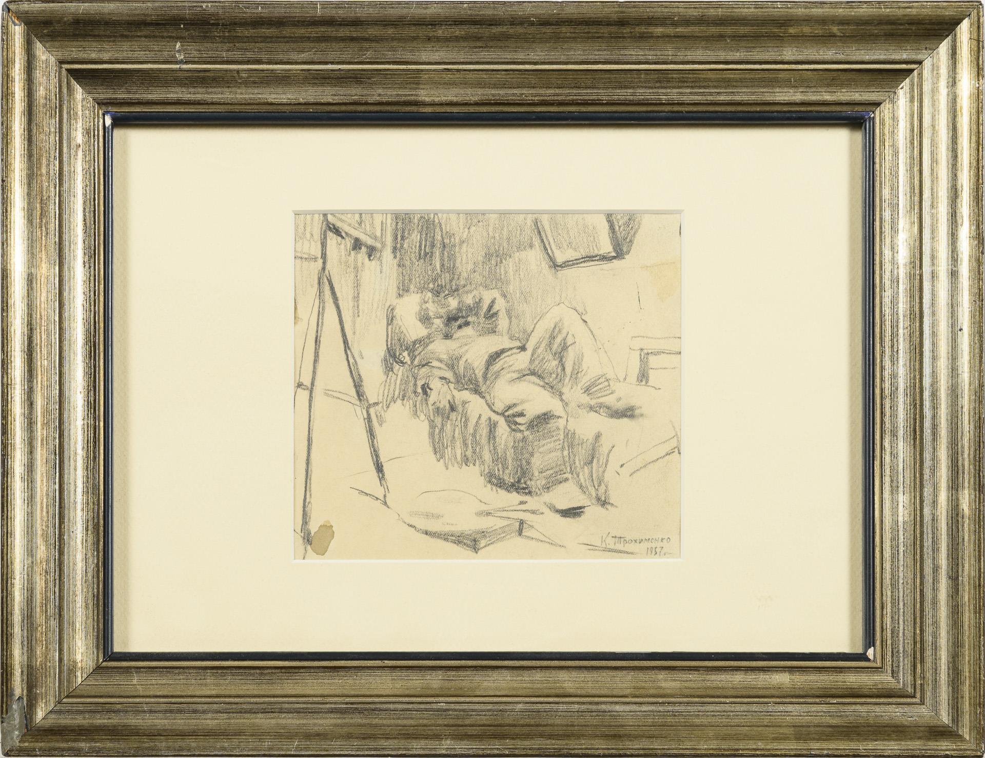 Ruhender Mann auf einem Sofa, neben sich Staffelei und Palette.