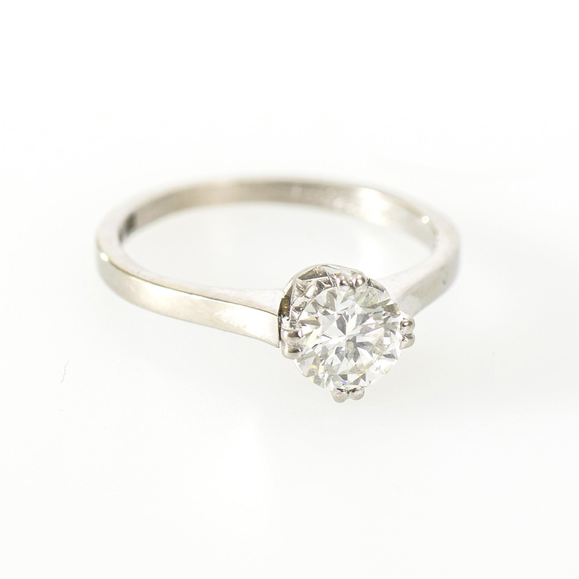 Weißgold 18 K (750) gestempelt, Handgravur 0.75 [ct] innenseitig unterhalb des Brillanten. Ringgröße 52. 2,8 g.