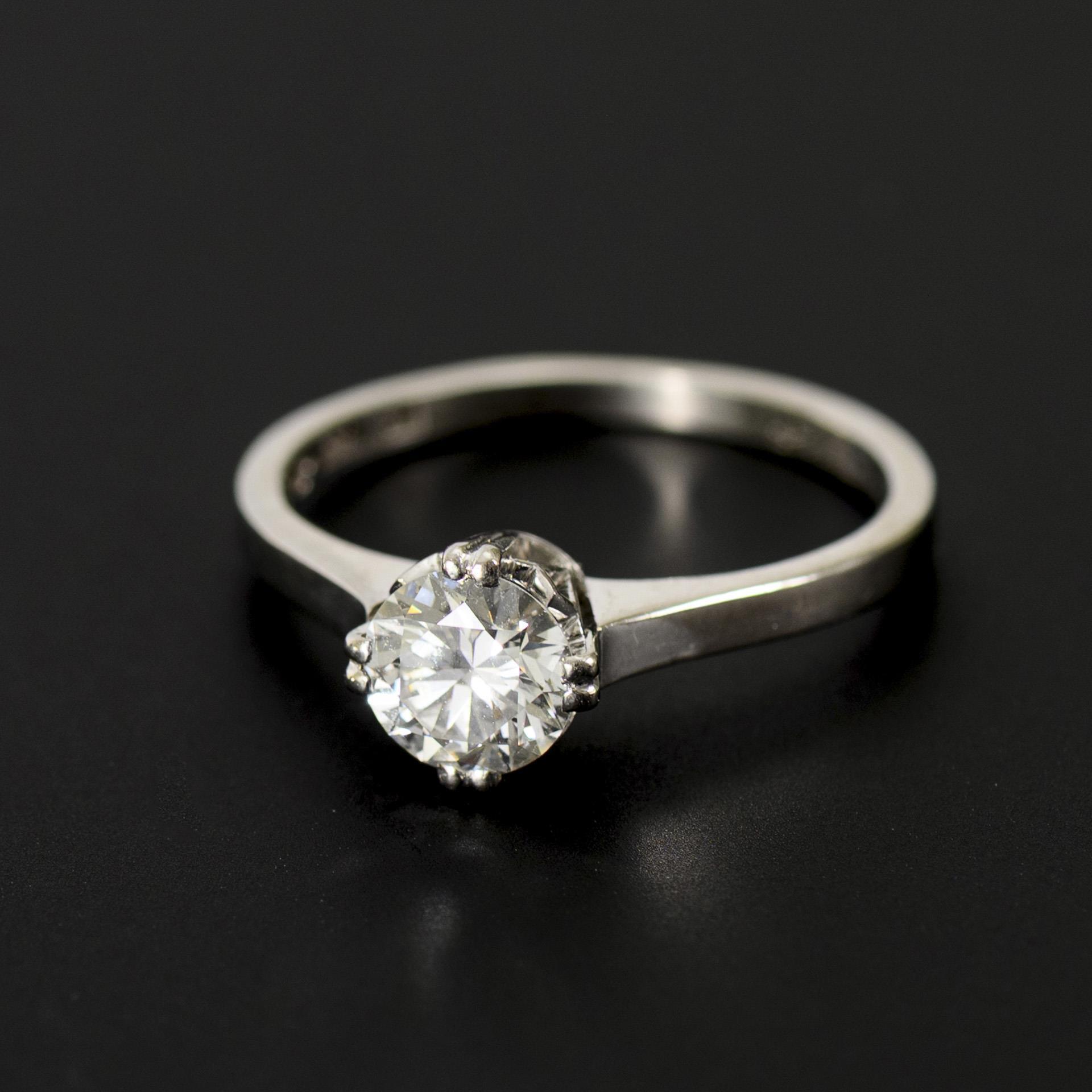 Weißgold 18 K (750) gestempelt, Handgravur 0.75 [ct] innenseitig unterhalb des Brillanten. Ringgröße 52. 2,8 g.