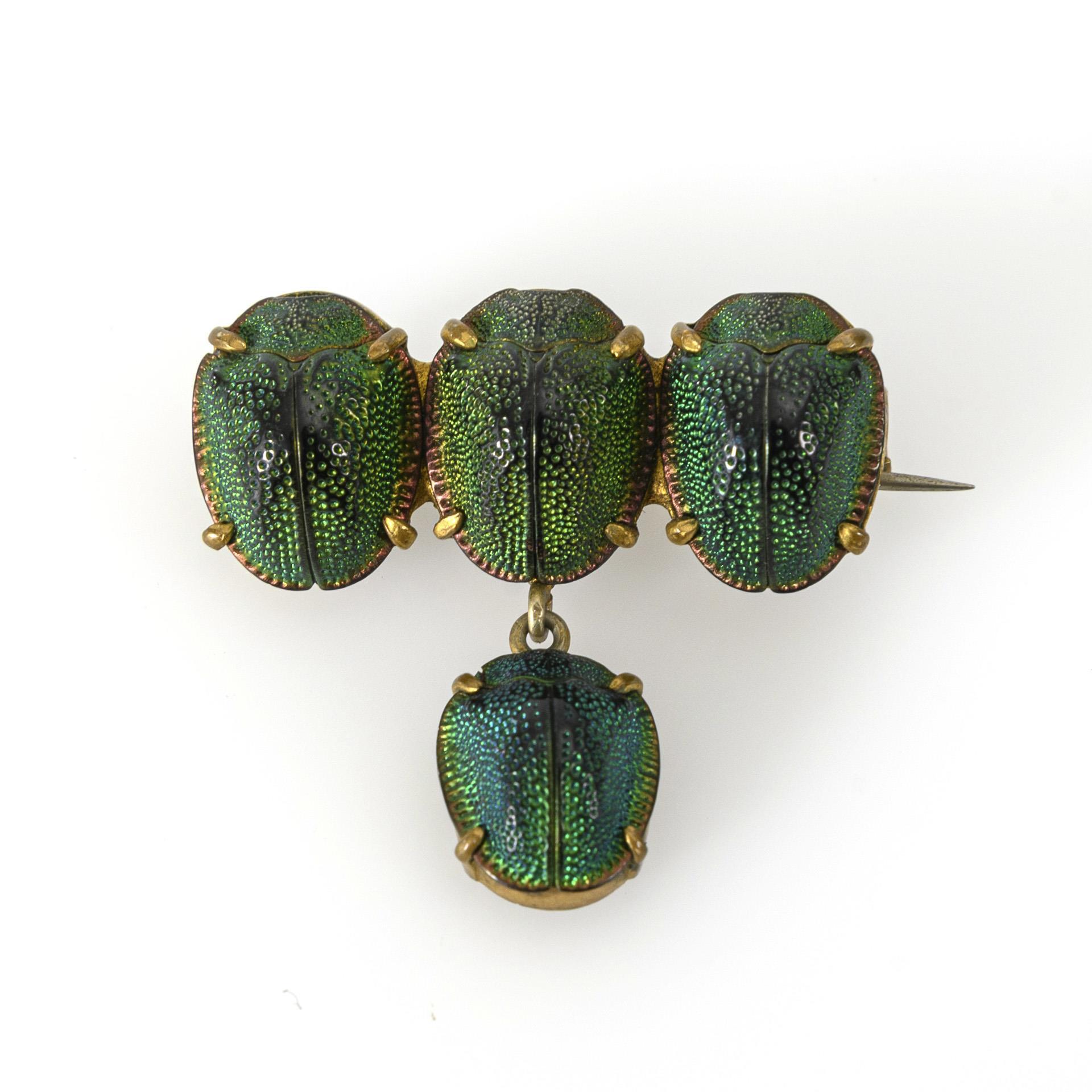 Brosche aus der Zeit um die Jahrhundertwende, entstanden wohl vor dem Hintergrund des damaligen Interesses für das Alte Ägypten. Bei dem vorliegenden Entwurf sollen die verwendeten Schmuckkäfer wahrscheinlich an den Skarabäus als altägyptisches Götter- und Glückssymbol erinnern.