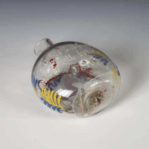 Kugelige Plattflasche mit kurzem Enghals; Abriss. Schauseitig ein Medaillon mit der Darstellung eines Pferdes, verso der Spruch "Haber und Gier, macht wilte Thier. 1786.".