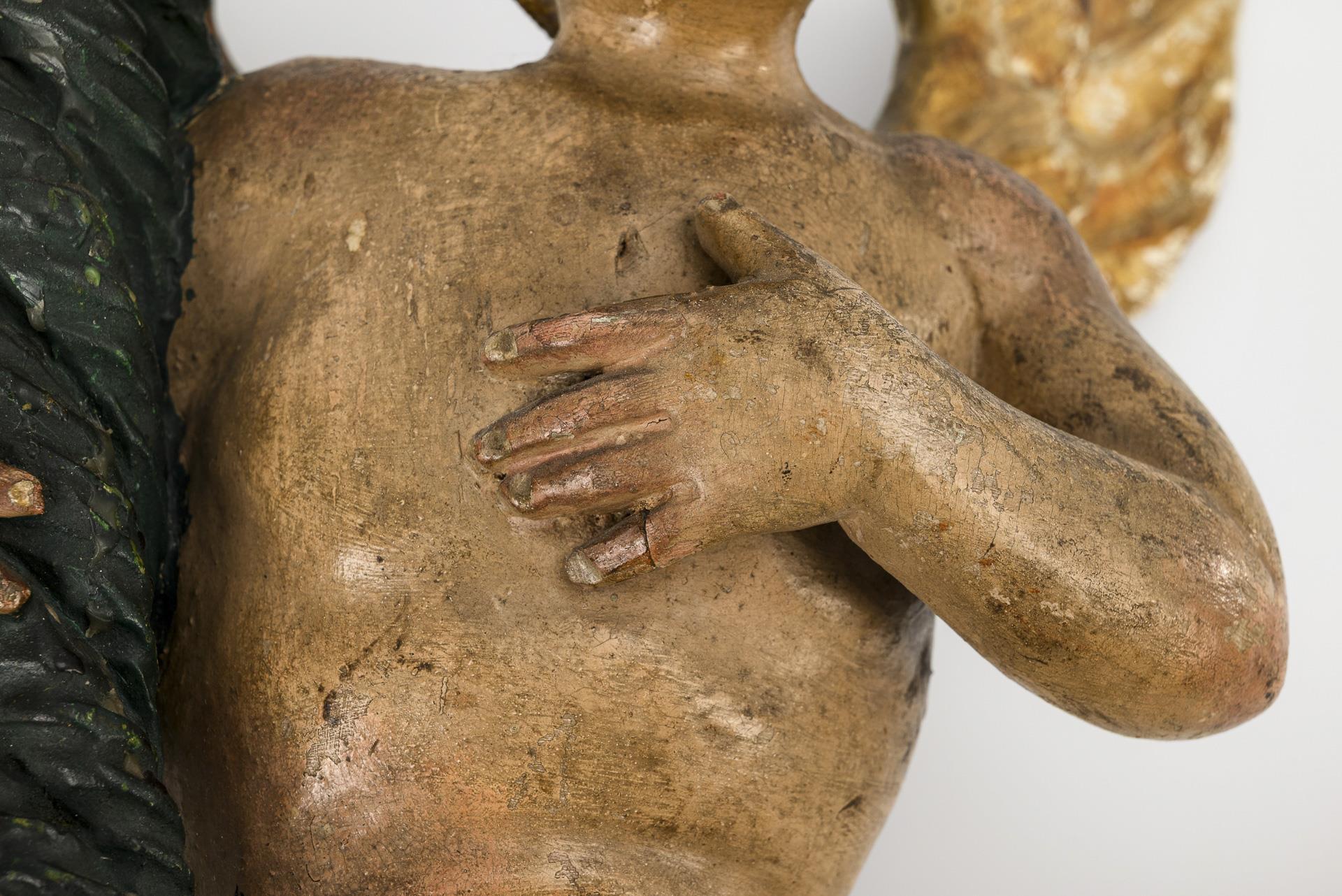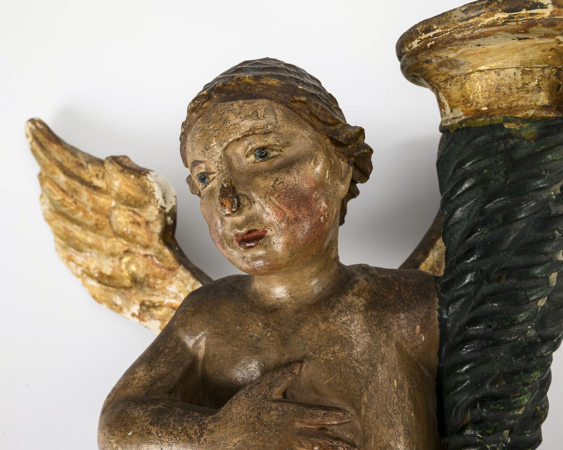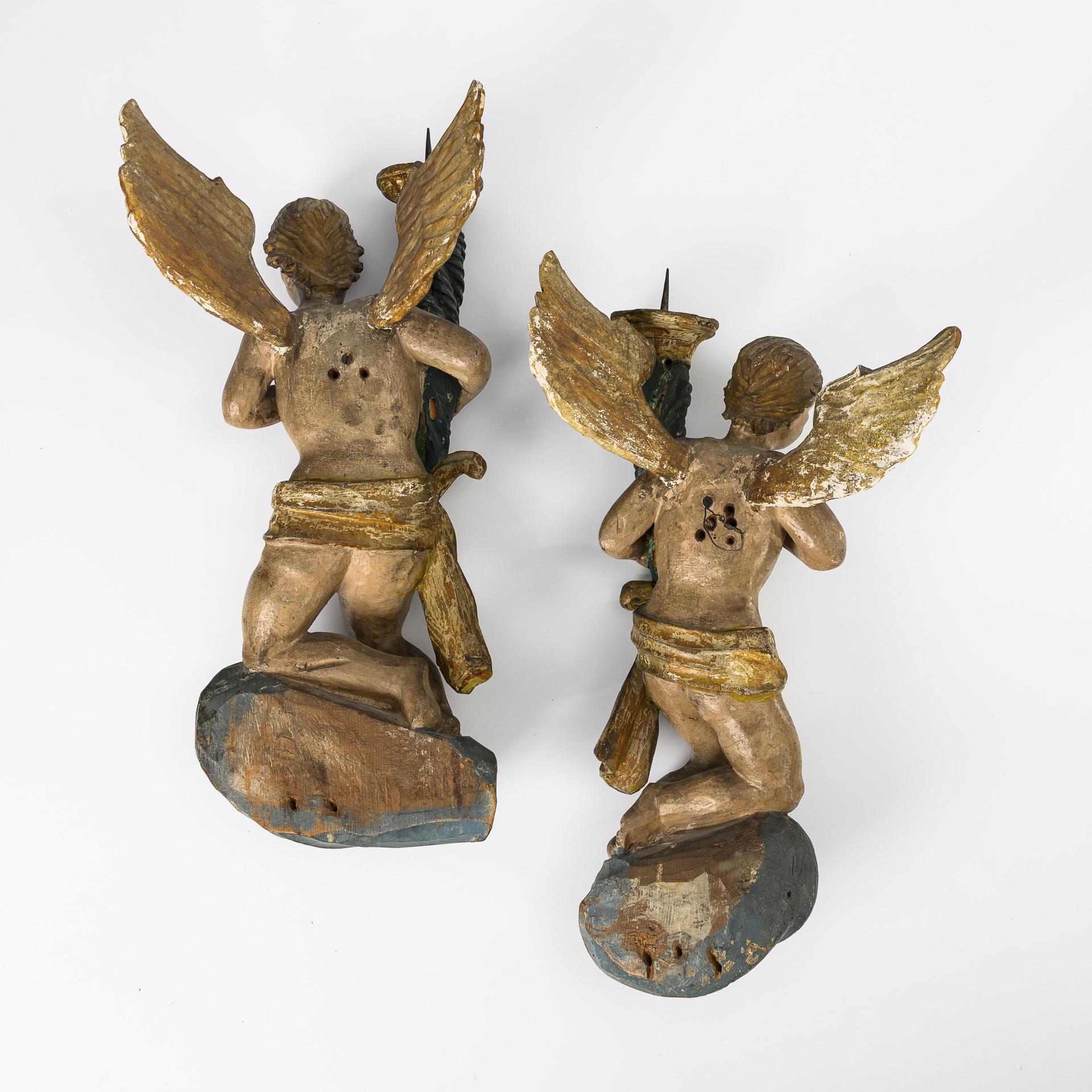 Spiegelbildlich gearbeitete, halb auf den Wolken kniende Engel mit füllhornartigen Kerzenhaltern in einer Hand, während die andere ergriffen an die Brust fasst. Einige Nagelspuren, 1 Ausbruch an einer Kerzentülle hinten, Fassung alt übergangen, Alters-/Gebrauchsspuren.