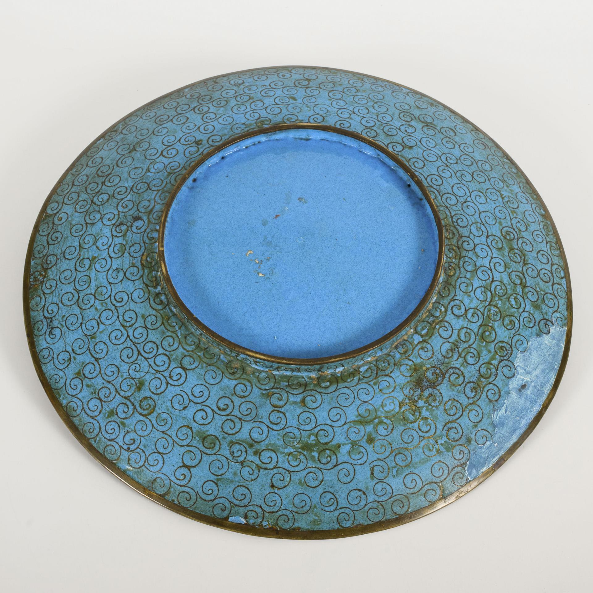 Fliegende Spatzen zwischen Chrysanthemen-Blüten. Rückseite emailliert, mit Spiralmuster. Kleinere Kratzer in der Front, rückseitig größere Reparaturstelle.