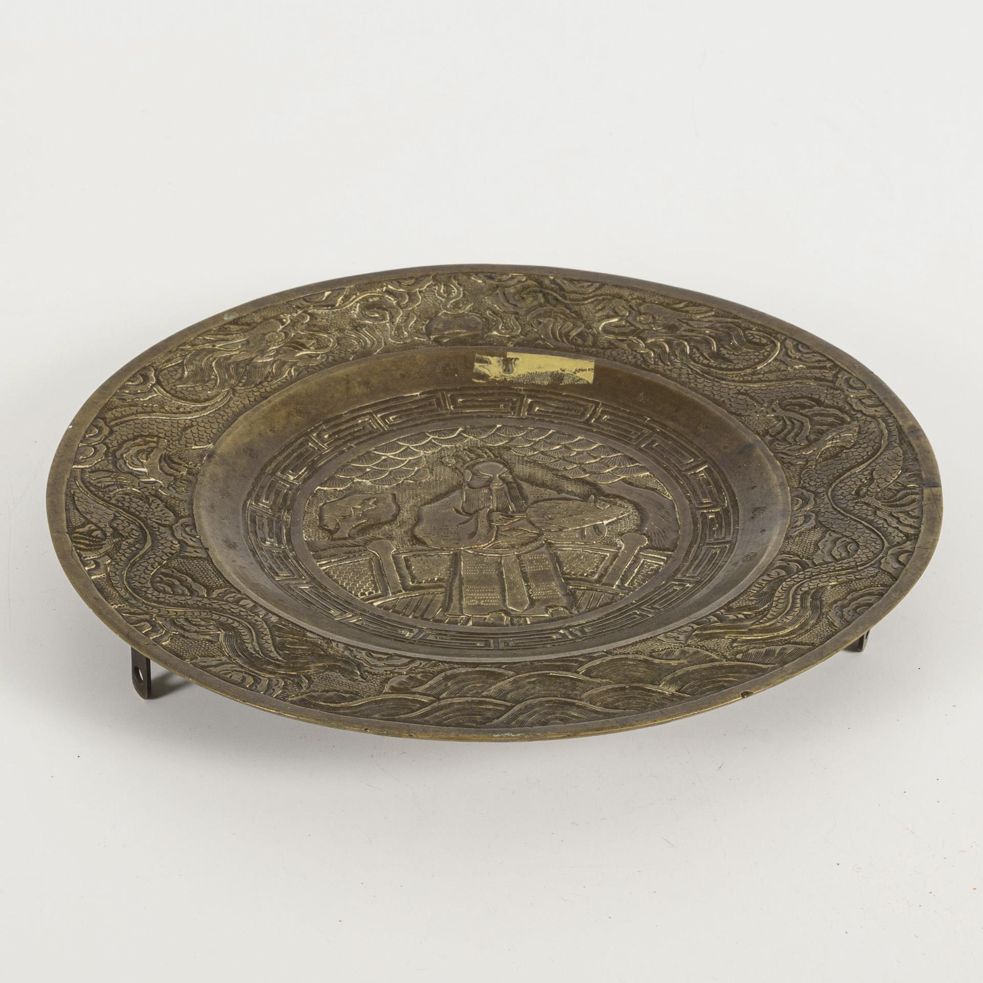 Reliefierter Teller mit Gelehrtenfigur im Spiegel und Drachenornament auf der Fahne. Rückseite mit angesetzten Metallösen.