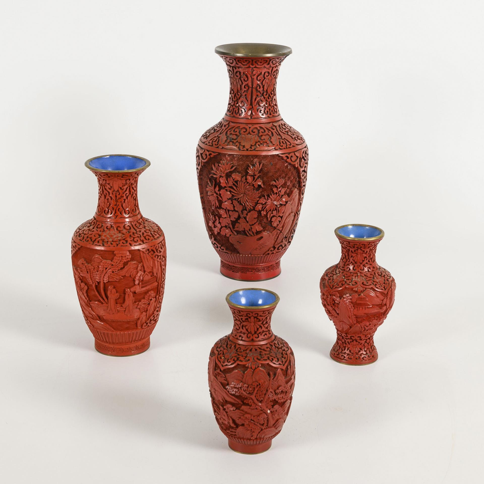 Alle mit Messingkorpus, die drei kleinen Vasen mit blauer Innen-Emaillierung. Tief reliefierter Rotlack mit Pflanzen- und Landschaftsdarstellungen. Große Vase mit Trockenrissen und Fehlstelle.