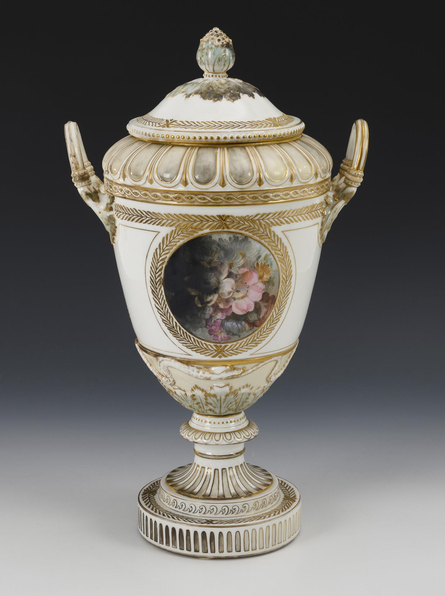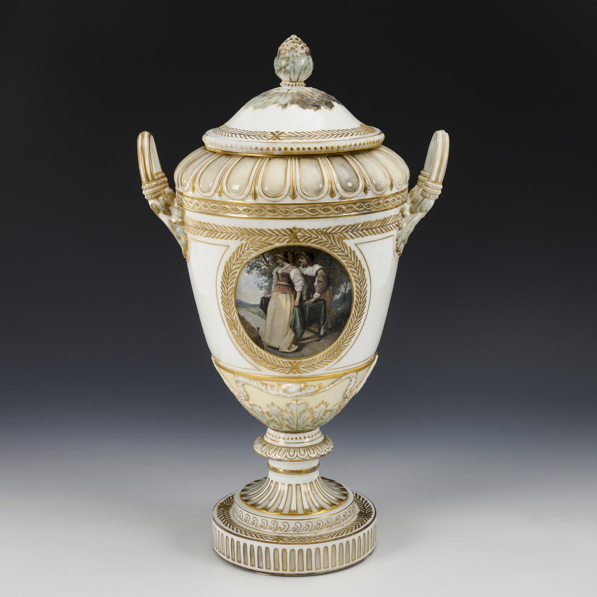 Sogenannte Weimar-Vase. Ovoider Korpus mit Zungenbandrelief, zwei Akanthusblatthenkeln, Knaufdeckel, kanneliertem Rundfuß, auf Rundplinthe. Schauseitig ein Medaillon mit der Darstellung eines Liebespaares, verso ein Blumenbukett im Stil der Weichmalerei. Partiell geschwärzt (Brandspuren), Klebespuren an der Verbindung Fuß/Korpus.