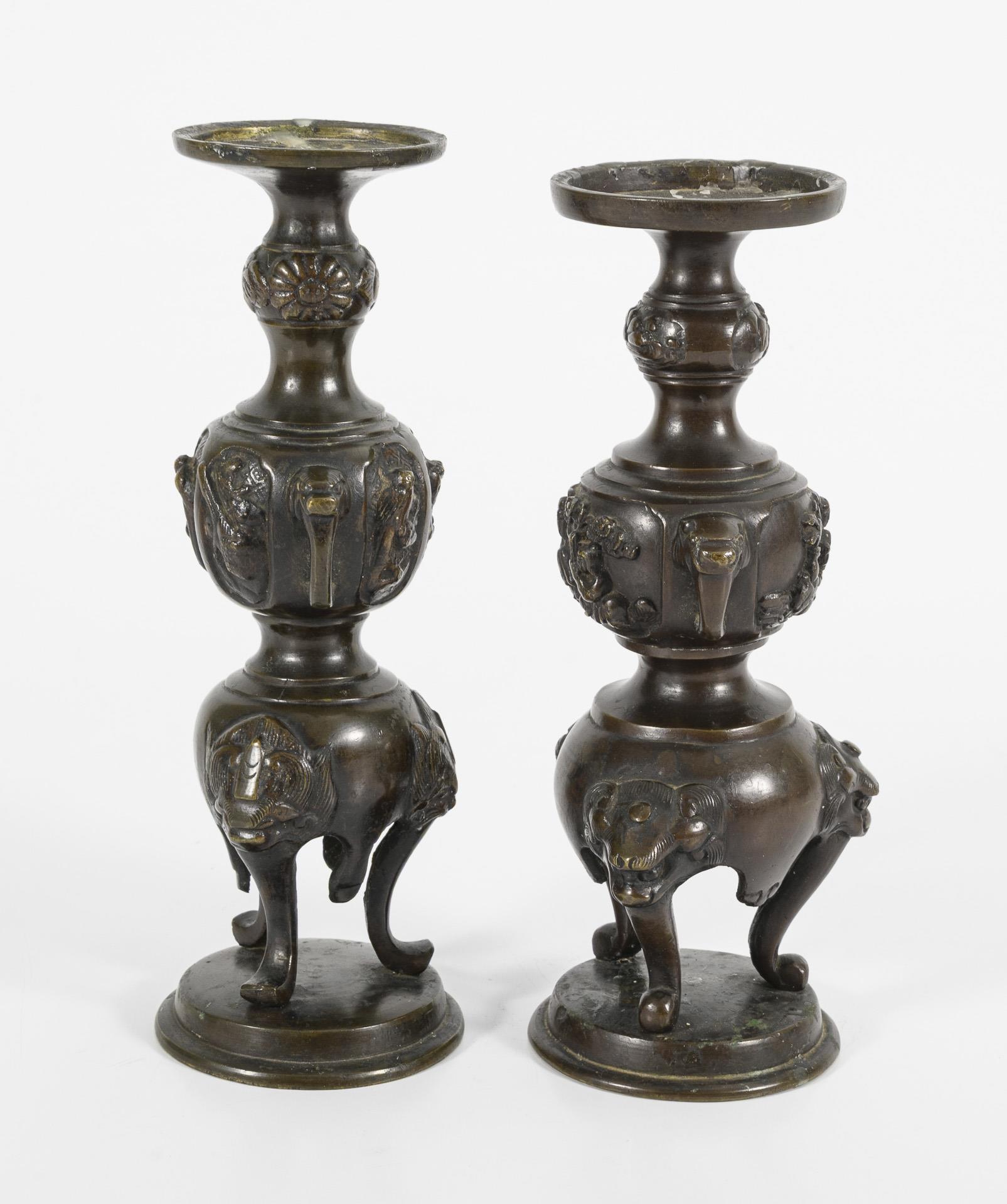 In der Form sehr ähnliche Leuchter. Dreifüßig, auf runder Plinthe mit Relieffeldern.