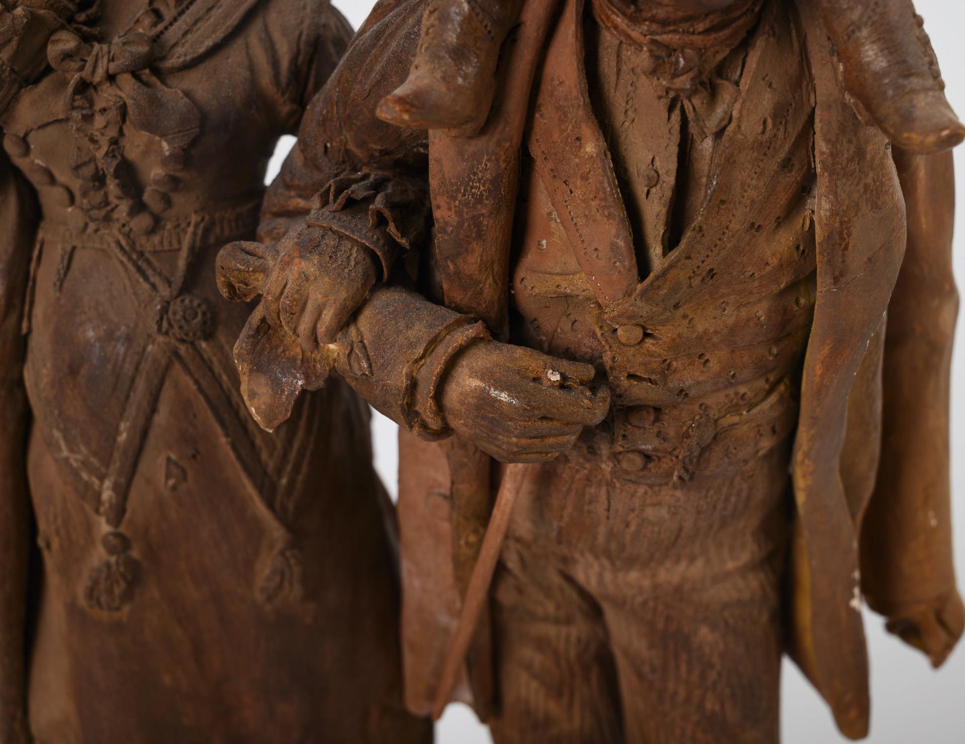 Sehr fein ausgearbeitetes, vornehmes Paar in zeittypischer Kleidung der Belle Époque. Während sich die Dame kokett zur Seite wendet, trägt der Herr das Kind auf den Schultern, dass wiederum seinen Zylinder auf dem Kopf hat. Restauriert/geklebt, wenige Fehlstellen und Ausbesserungen.