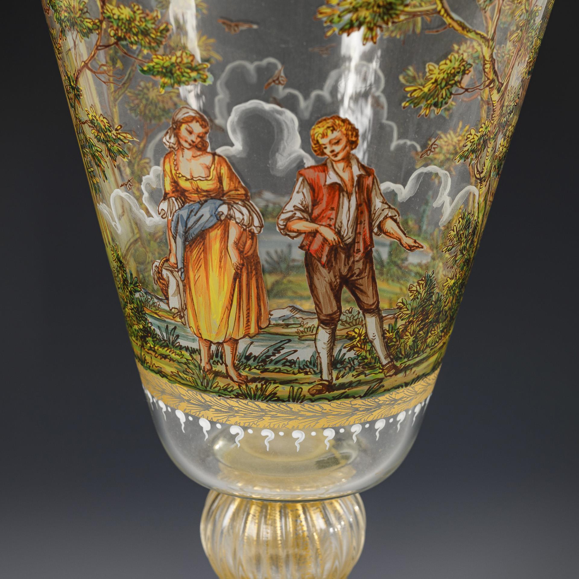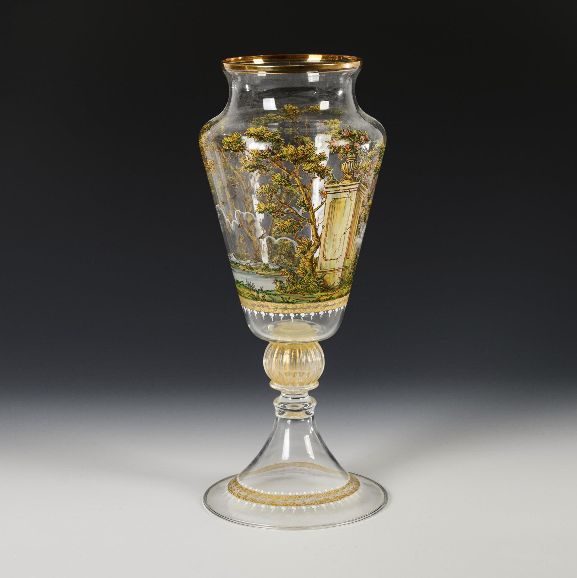 Farbloses Glas, polychrome Emailmalerei, Goldstaffage. H 38 cm. 800 g.
