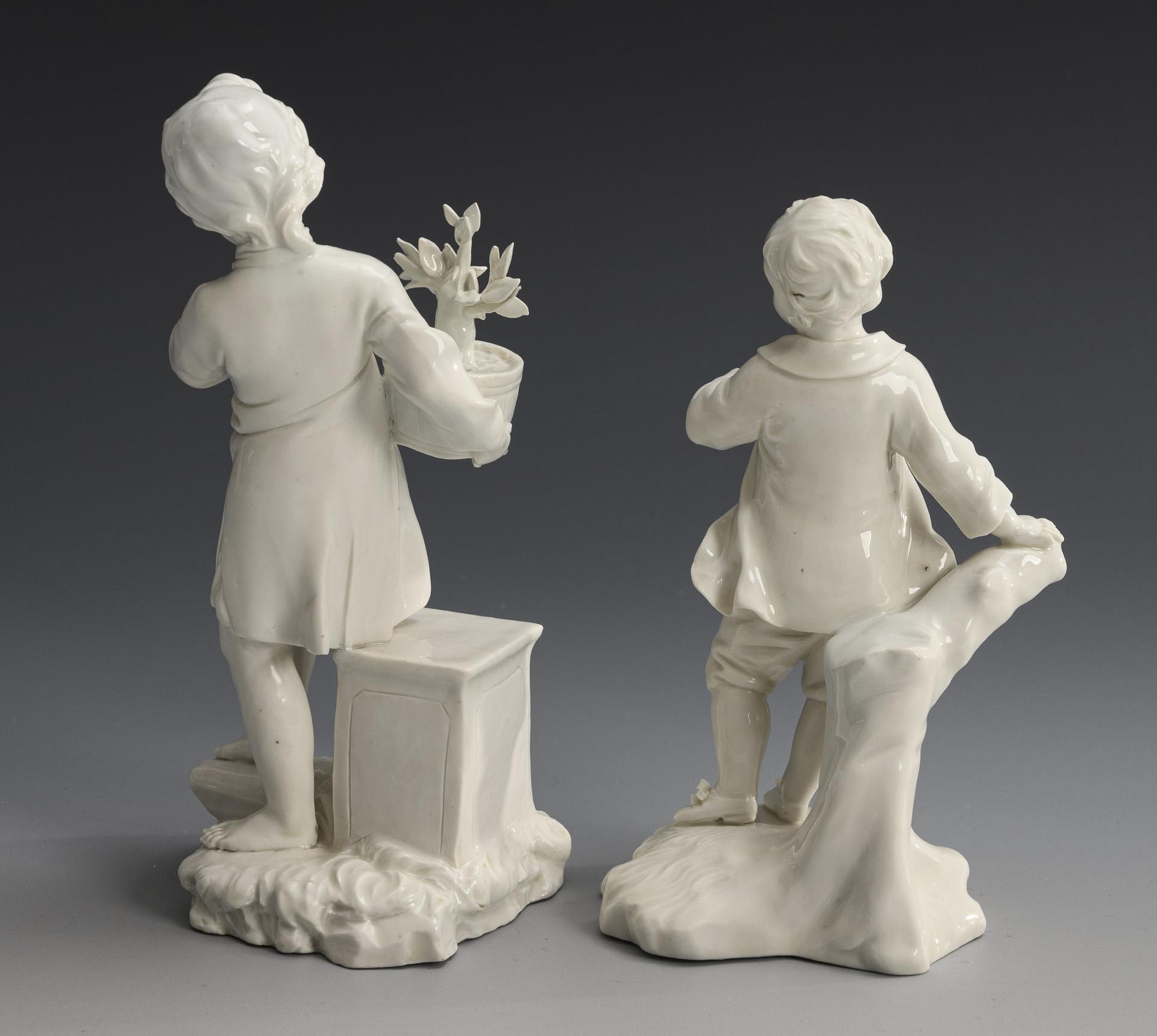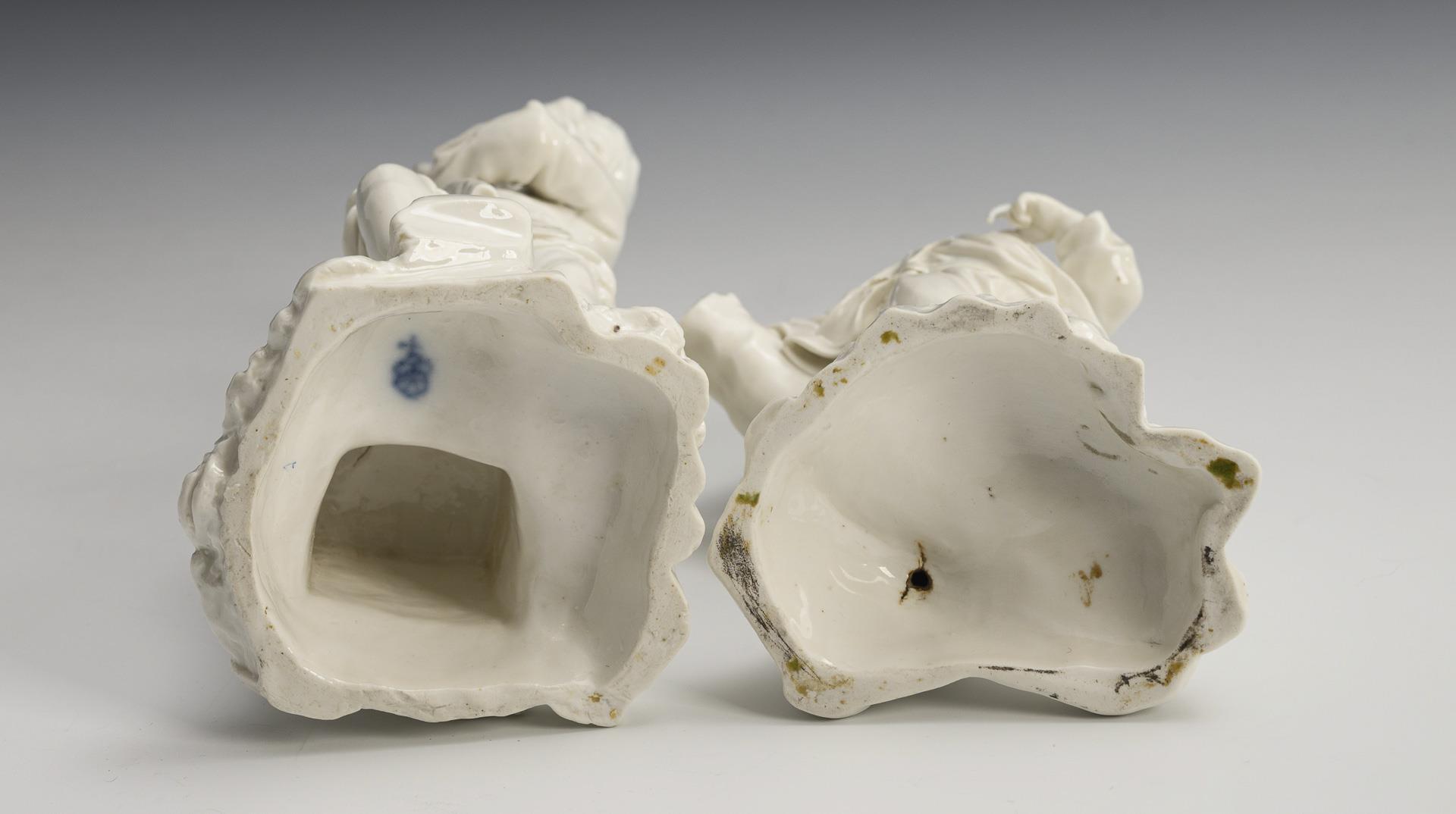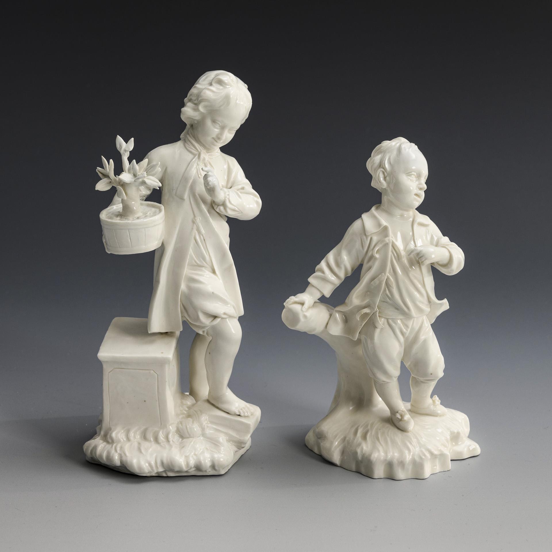 1x Knabe mit Blumentopf und 1x Knabe an einem Baumstamm. Mit Restaurierungen.