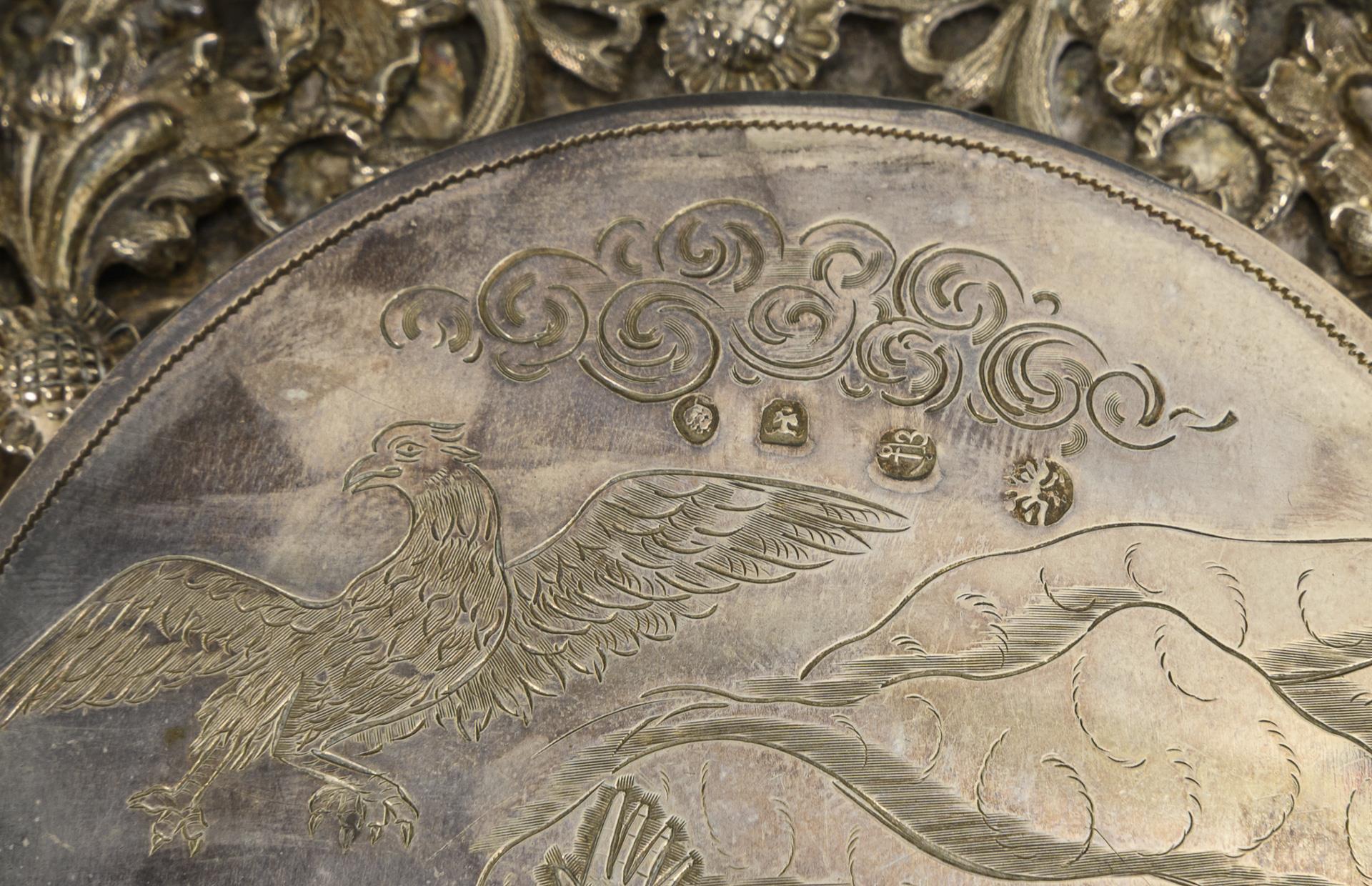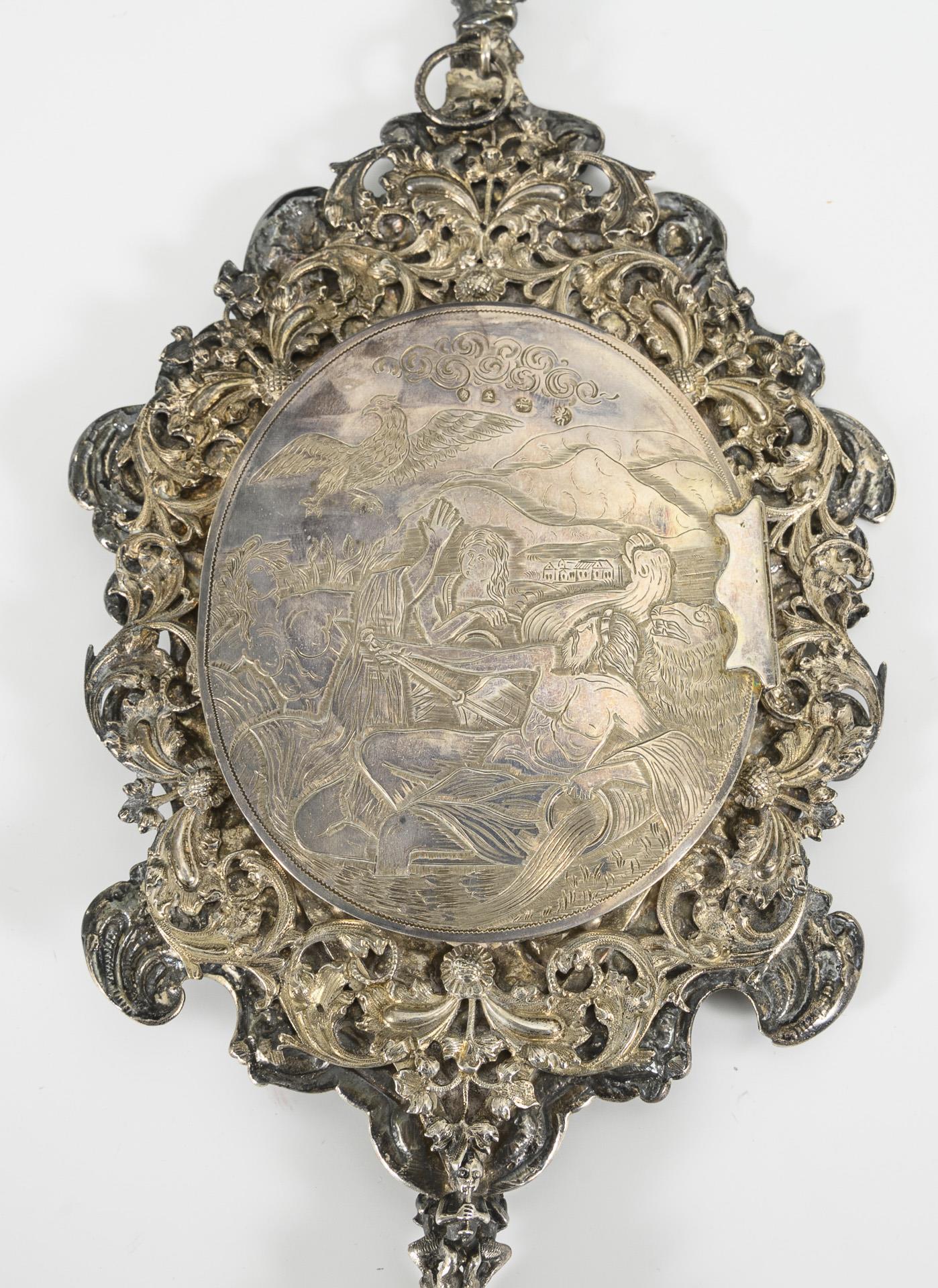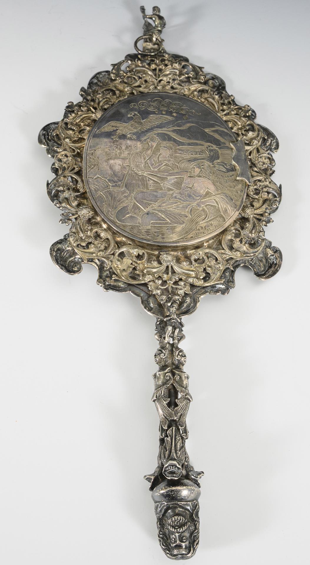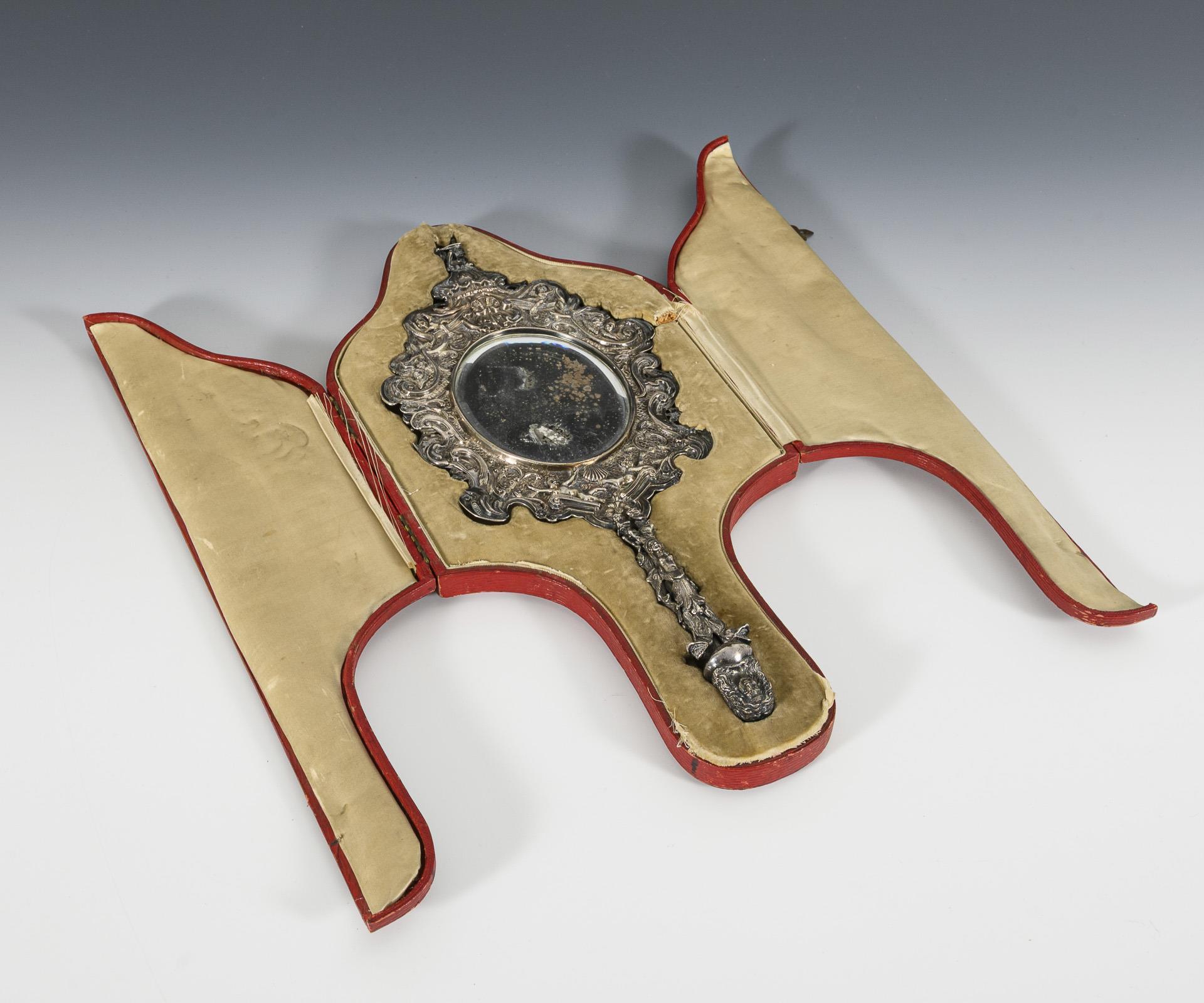 Mit Rocaillen-, Blüten- und Muschelmotiven reliefierter Spiegel. Aufklappbare Rückseite mit gravierter mythologischer Szene, 37 x 15,5 cm. In defektem rotem Etui mit Samtfutter. Spiegelglas mit Altersspuren und Defekten.