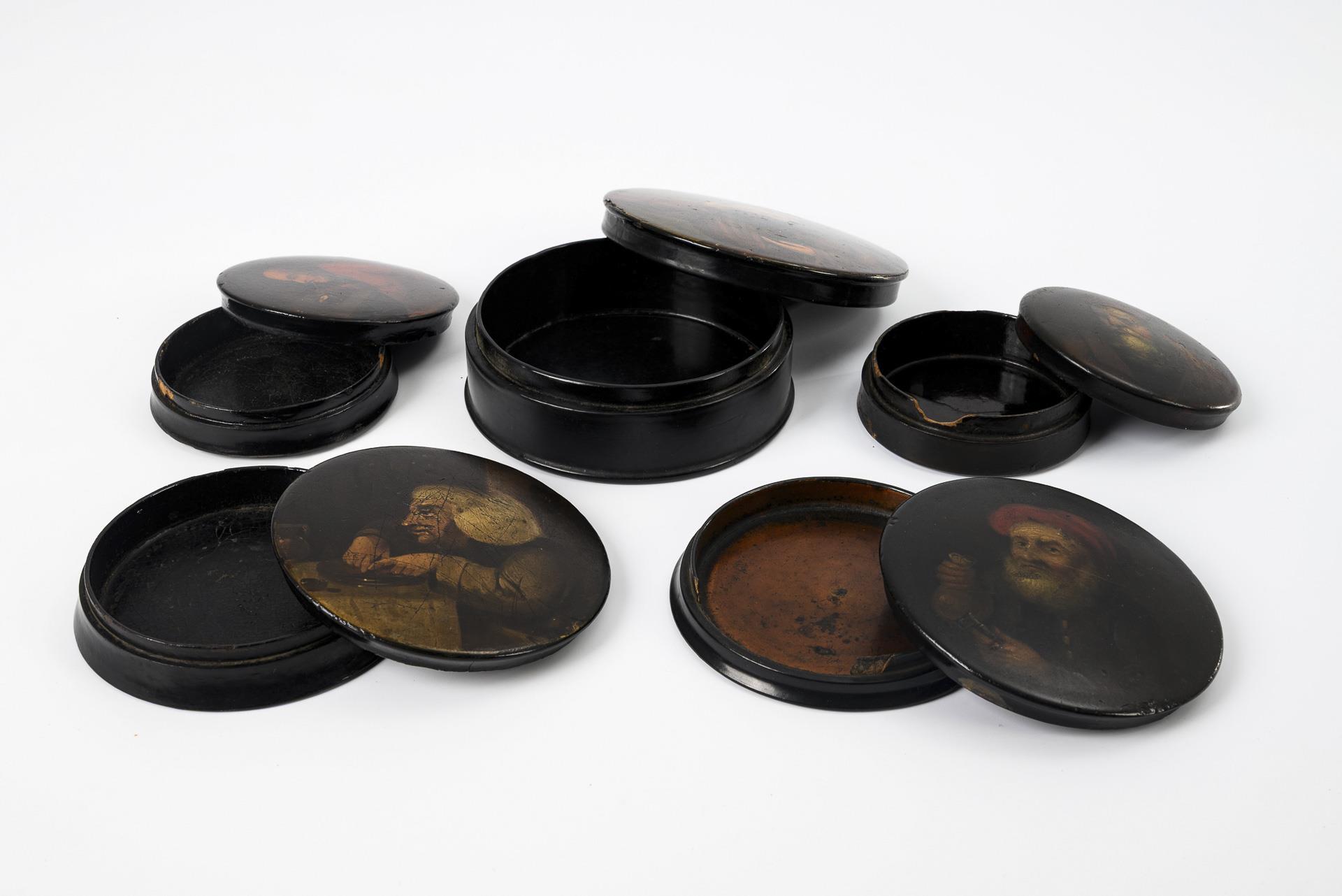 Runddosen mit Passdeckeln. Tabak schnupfender Mönch, Mann beim Essen, Mann mit rotem Turban sowie Schlüssel und Geldsack, Pfeiferaucher, bärtiger Mann mit rotem Barett. Je Alters-/Gebrauchsspuren, 2x Fehlstellen am Innenrand, 1x innen und außen stark krakeliert und Bild sehr stark zerkratzt.