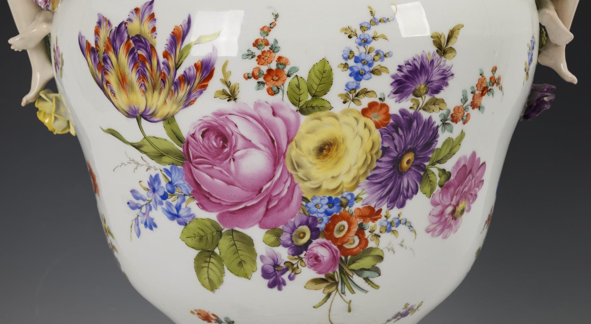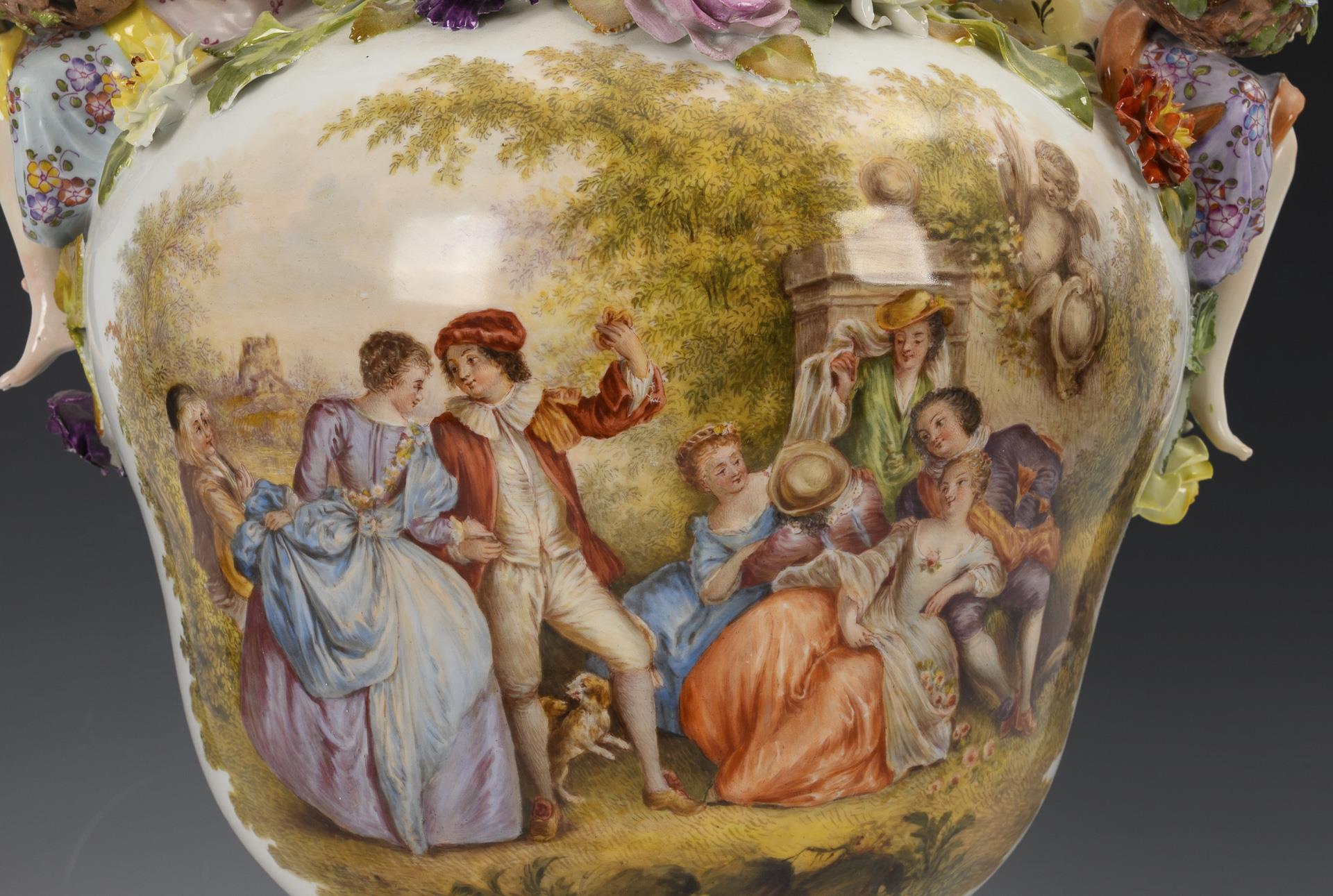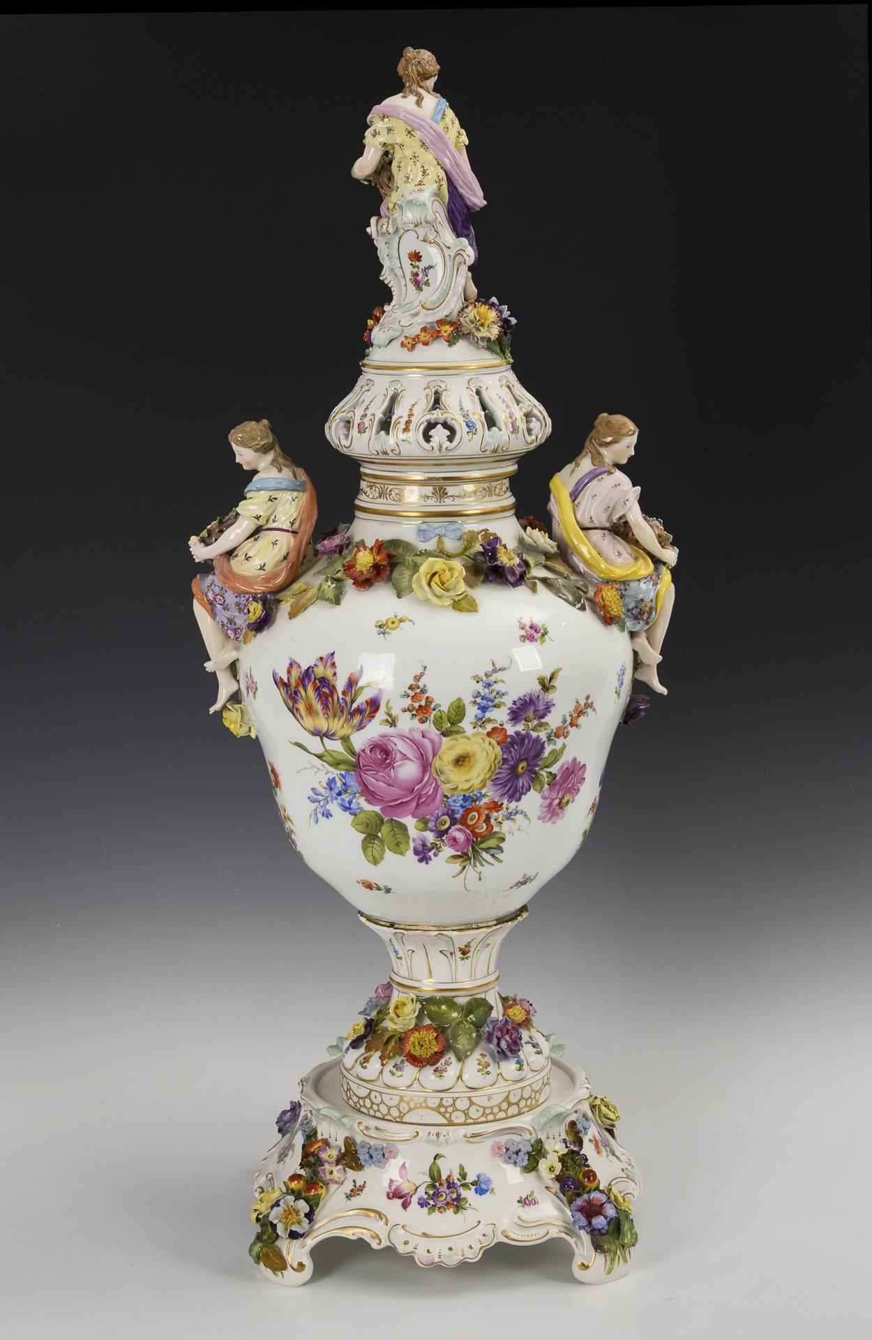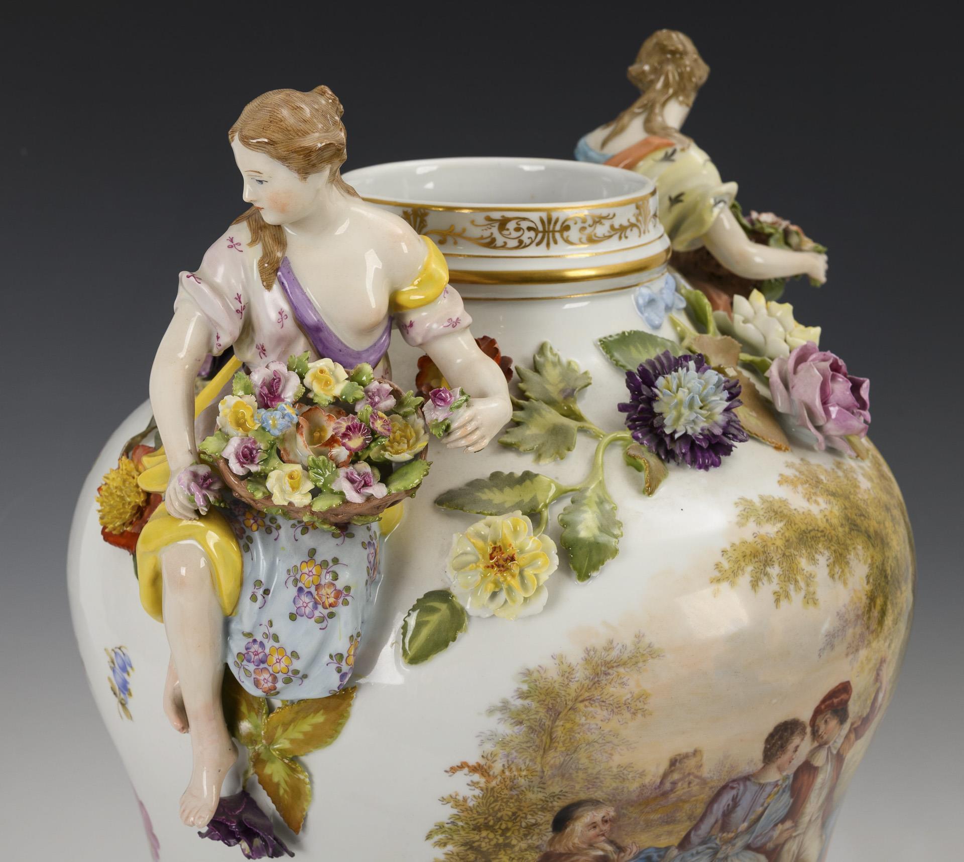 Blütenbelegte Balustervase mit zwei, einen Blumenkorb haltenden Frauenfiguren als Handhaben und durchbrochenem Deckel mit Frauenfigur, vierfüßiger, blütenbelegter Sockel. Schauseitig auf Vase und Sockel eine Watteau-Szene, verso ein Blumenbukett. Bestoßungen und Restaurierungen am Belag, rechter Arm der Deckelfigur, Beine einer Vasenfigur und Arme einer Vasenfigur restauriert.