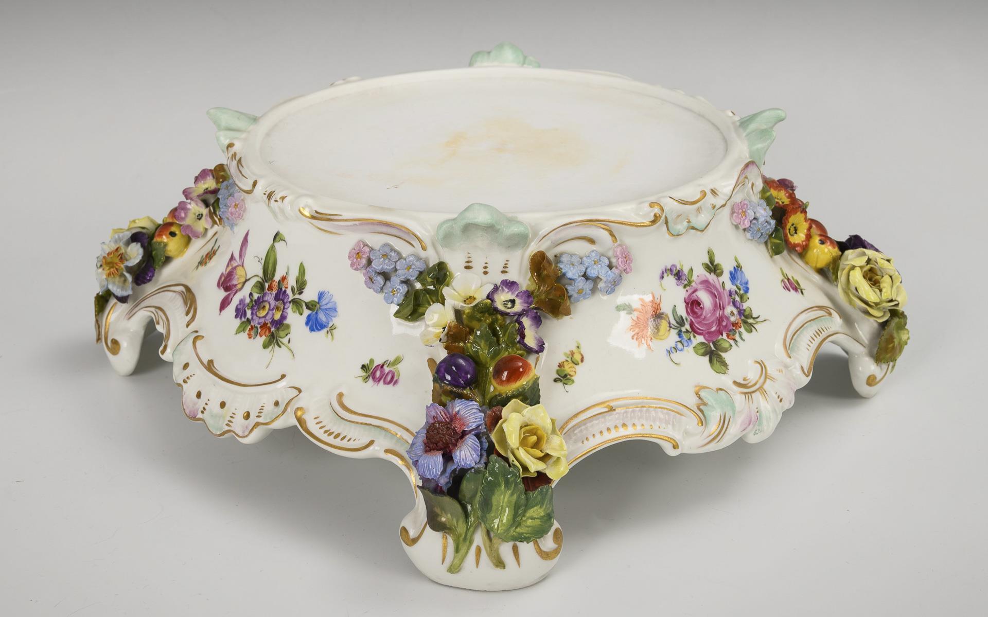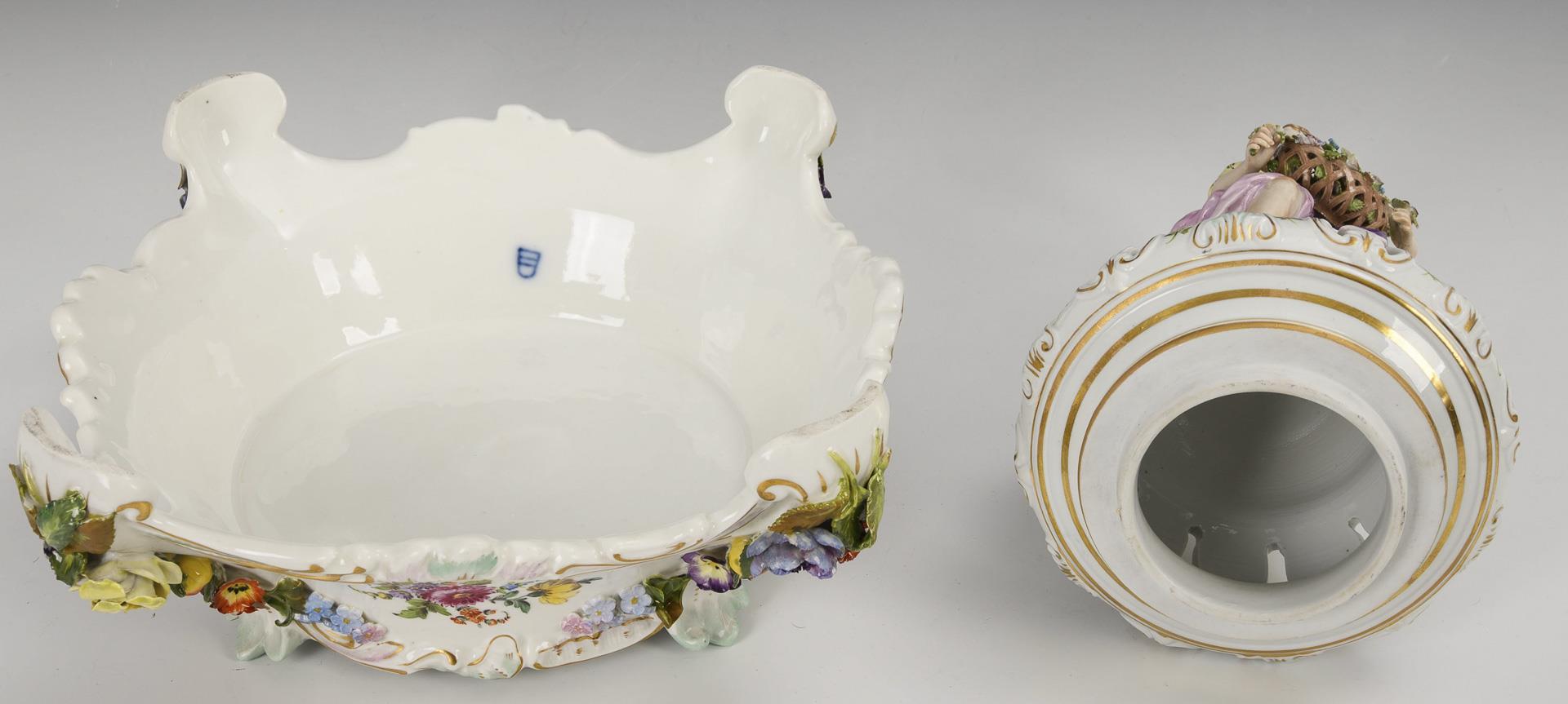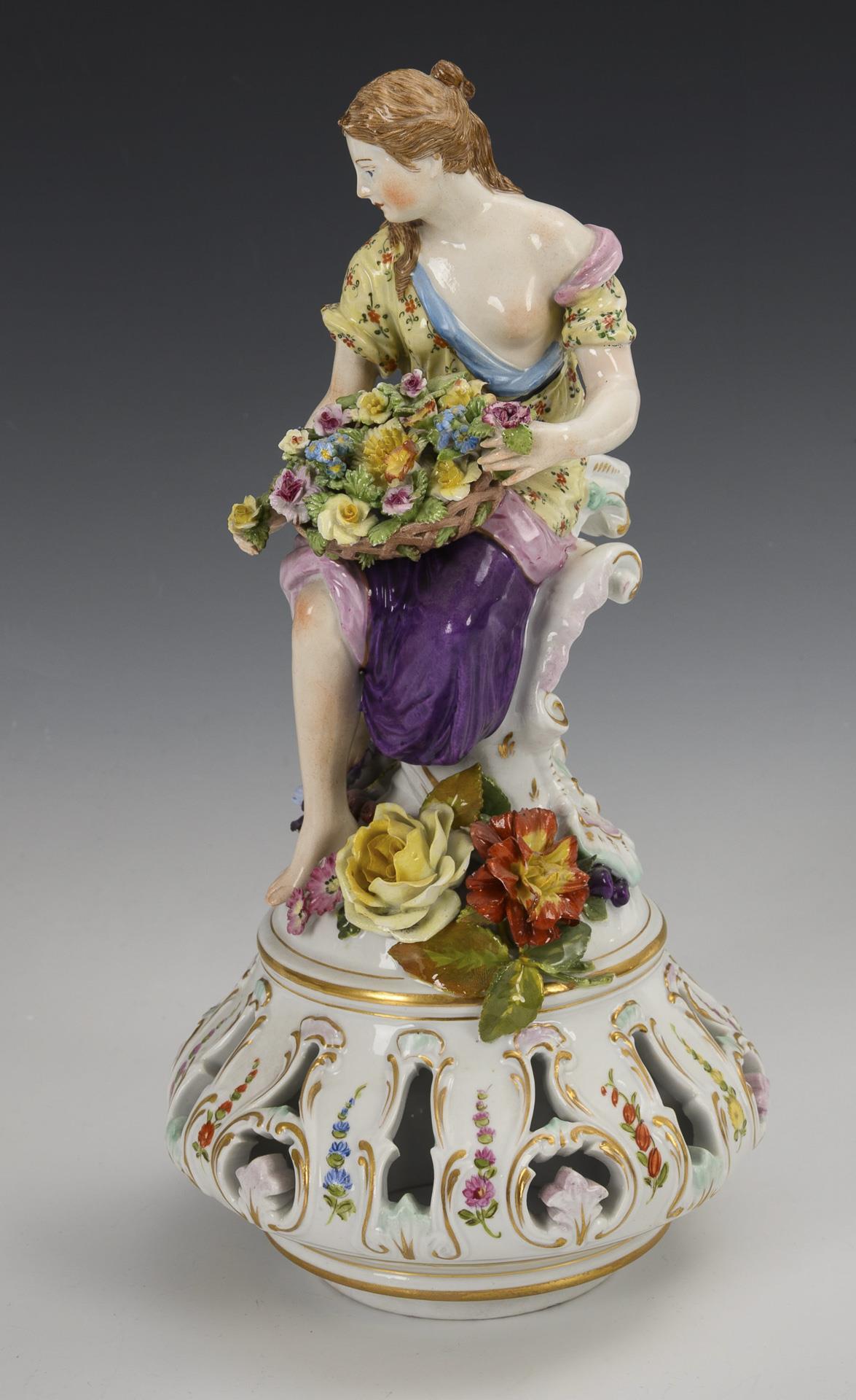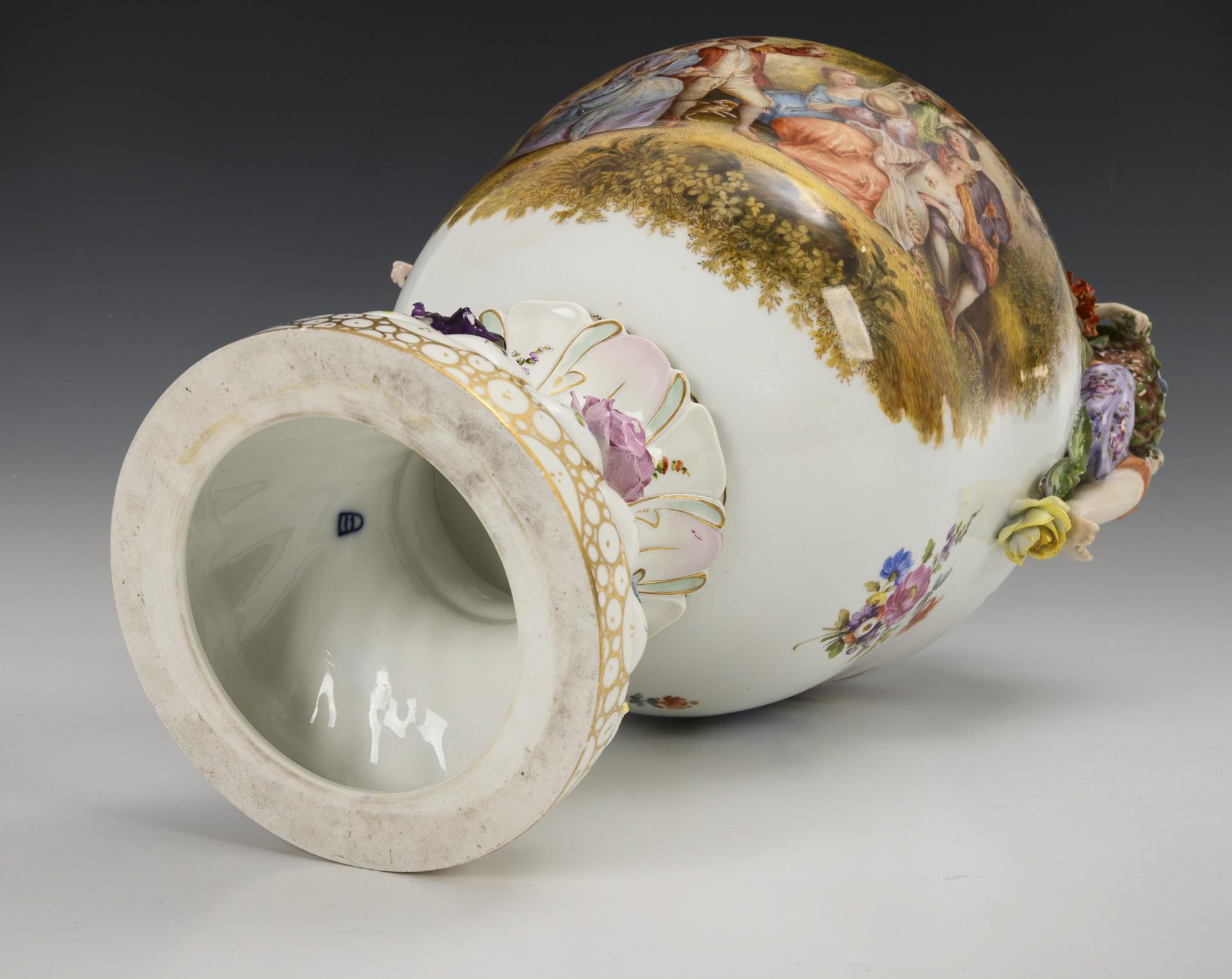 Blütenbelegte Balustervase mit zwei, einen Blumenkorb haltenden Frauenfiguren als Handhaben und durchbrochenem Deckel mit Frauenfigur, vierfüßiger, blütenbelegter Sockel. Schauseitig auf Vase und Sockel eine Watteau-Szene, verso ein Blumenbukett. Bestoßungen und Restaurierungen am Belag, rechter Arm der Deckelfigur, Beine einer Vasenfigur und Arme einer Vasenfigur restauriert.