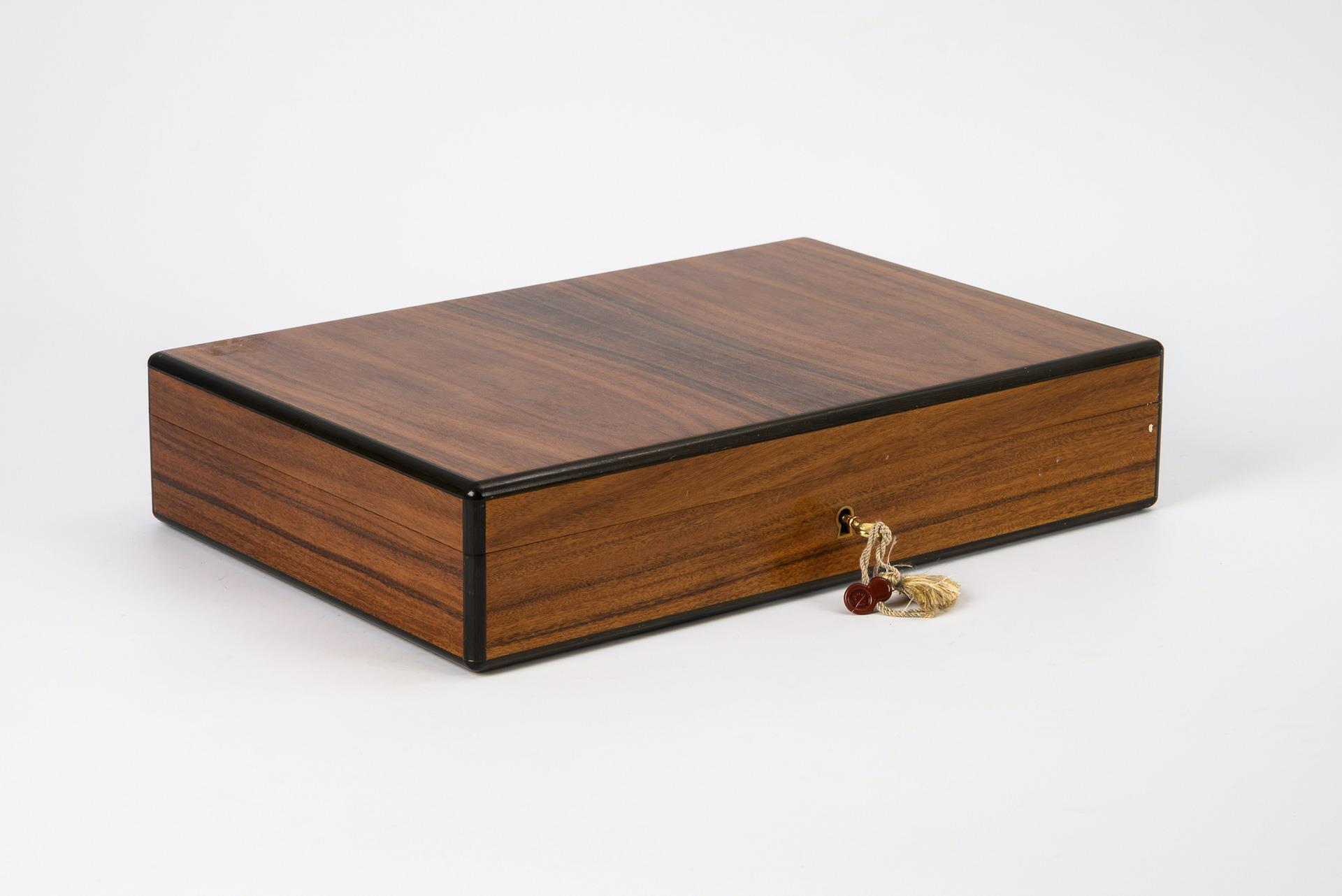 Auf dem Schloss gemarkt, im Deckel Firmenstempel, Schlüssel mit Firmensiegel, beiliegender Firmen-Zettel mit Furnierstück. Zigarrenschneider Solingen bzw. Davidoff gemarkt. 2. Hälfte 20. Jh.
