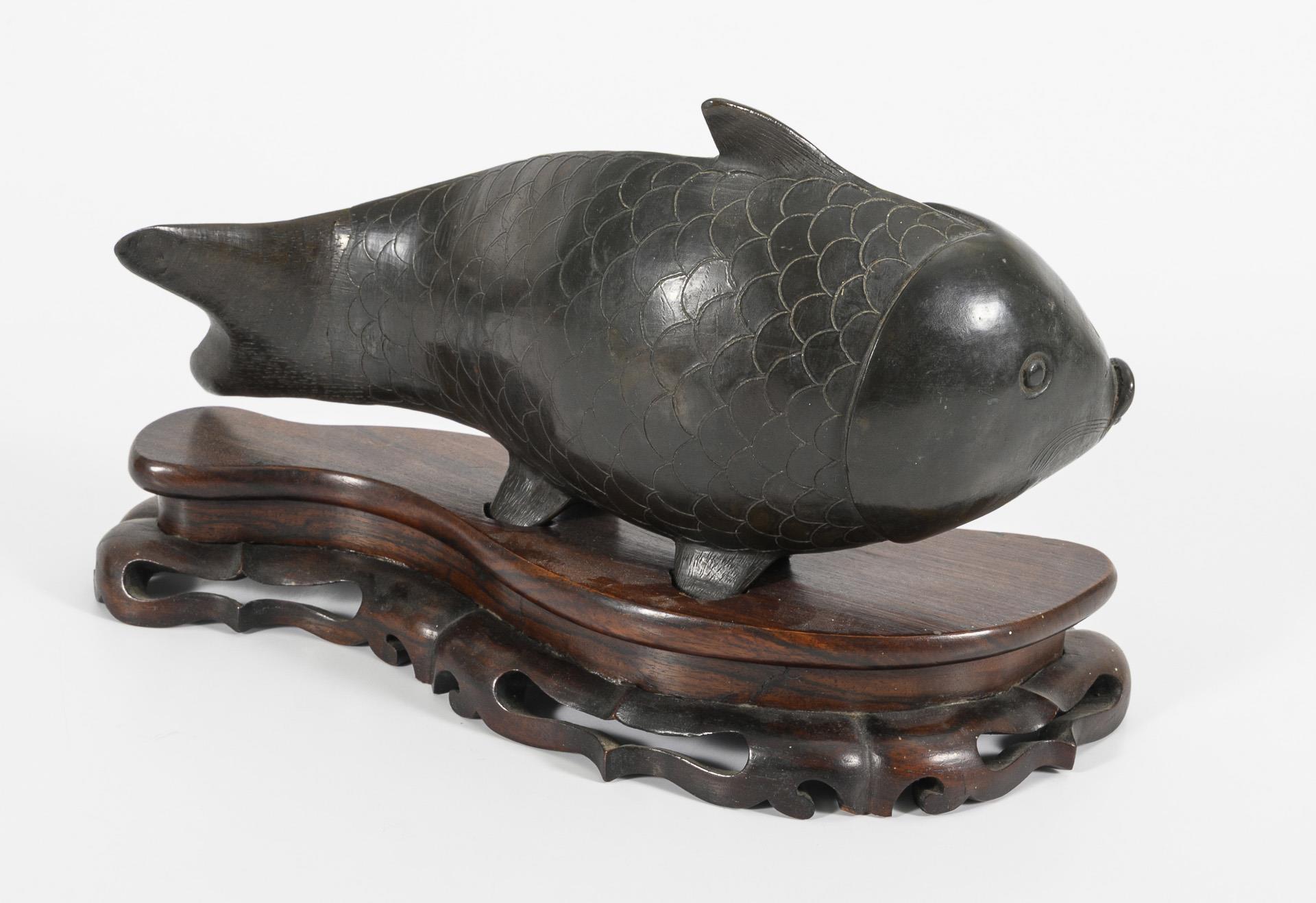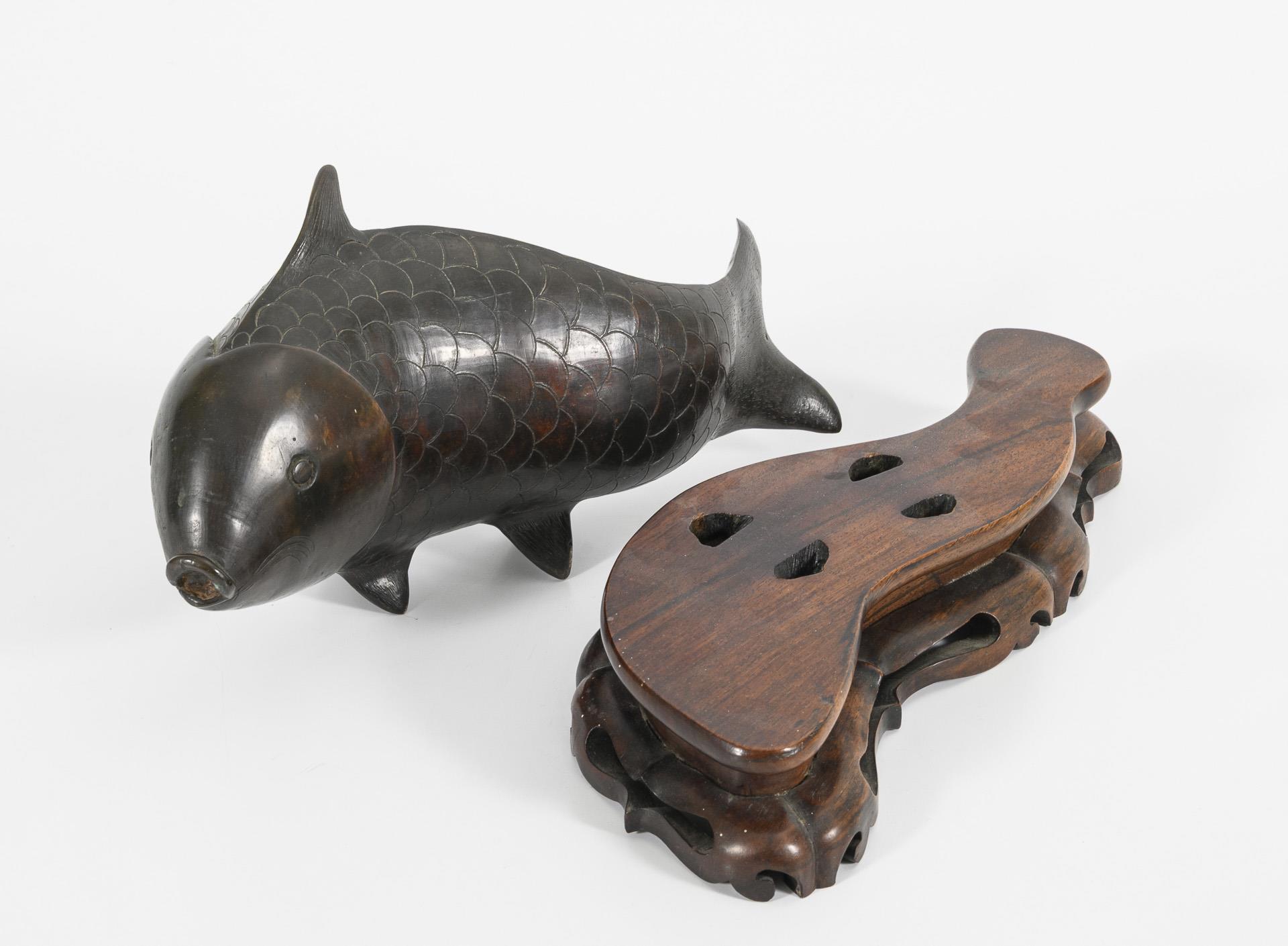 Karpfen in schwimmender Bewegung, auf passendem Holzsockel.