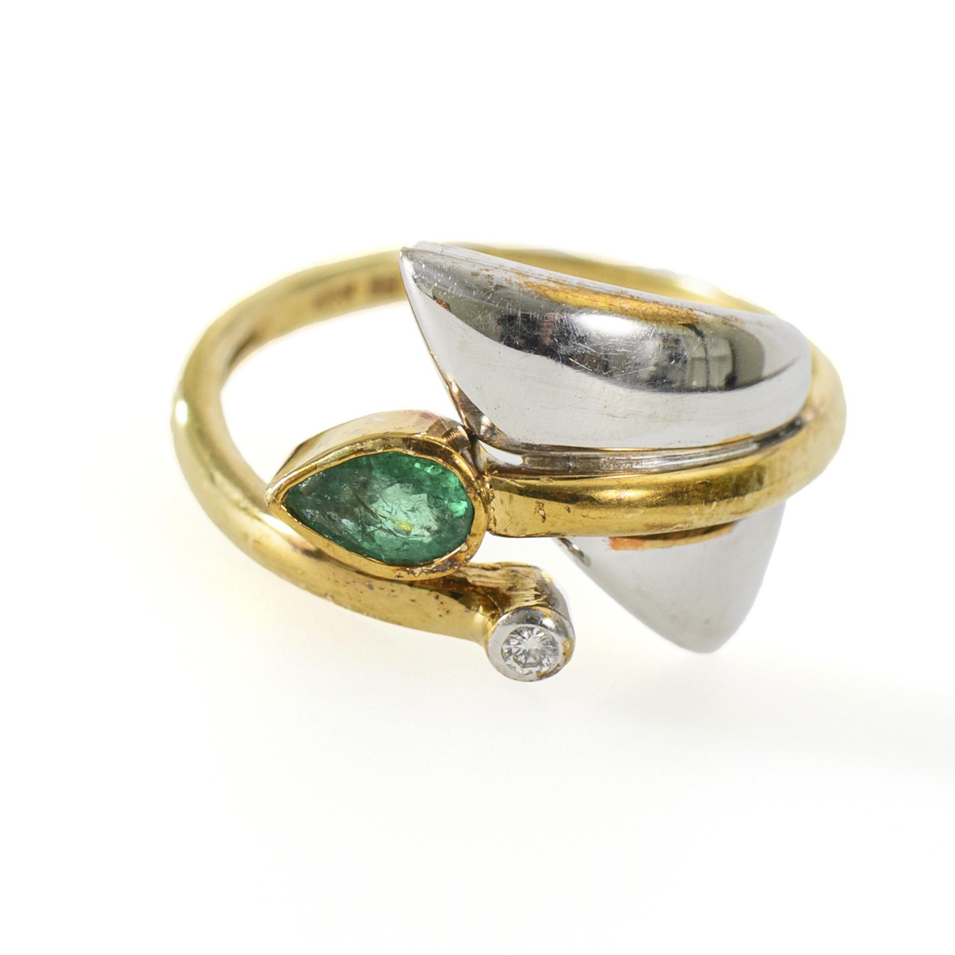 Ring mit dreiecksförmigem Weißgoldelement sowie in Zargenfassung je ein kleiner Brillant und ein Smaragd in Tropfenform, an einer Gelbgoldschiene. Leichte Tragespuren, ein kleiner Kratzer am Smaragd.
